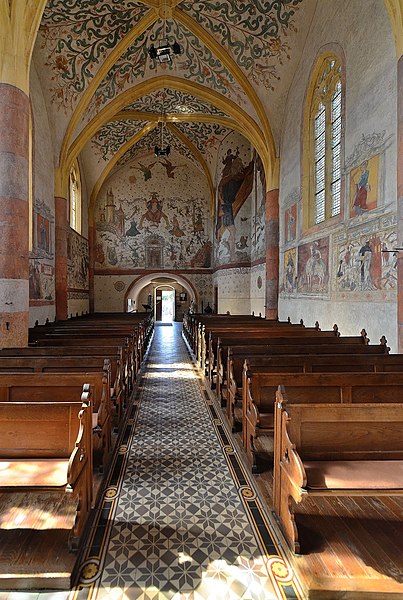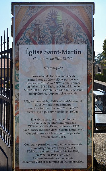 L'église Saint-Martin de Sillegny, paroissiale de la commune située en Moselle, est surnommée la « petite Sixtine lorraine » ou la « Sixtine de la Seille » en raison de l'abondance de ses fresques couvrant l'intégralité de l'édifice. De style gothique, elle a été édifiée au XVe siècle et conserve une tour massive et fortifiée, plus ancienne, qui servait autrefois à protéger les habitants. À la charnière des XVe et XVIe siècles, une seconde campagne de travaux a permis d'élever le chœur, la première sacristie et le transept, et d'offrir à l'édifice sa première parure de vitraux. Au XIXe siècle, les verrières du chœur ont été remplacées par des compositions de Laurent-Charles Maréchal, élève messin de Delacroix, et la tour du clocher, rasée au XVIe siècle, a été reconstruite ; la même époque a vu l'amputation du bras sud du transept, qui a détruit sa symétrie. La richesse principale de l'église tient aux fresques qui couvrent une grande partie des murs intérieurs et représentent des scènes religieuses ainsi que des saints et saintes. Ces peintures anonymes sont datées du second quart du XVIe siècle, et la tradition rapporte qu'en 1540 un peintre italien ambulant, à la demande du curé, décora l'édifice de scènes tirées de l'Évangile et de la Bible. Diverses hypothèses subsistent quant à l'identité des artistes ; la réalisation est parfois attribuée à des peintres envoyés par les sœurs du cloître Sainte-Marie-aux-Nonnains de Metz. Dans le presbytère de la « Sixtine de la Seille » figure la représentation du saint patron des empereurs romains, Saint Césaire, diacre et martyr. Les fresques, considérées comme dépassées par certains, ont été recouvertes de badigeon vers la fin du XVIIIe siècle ou au début du XIXe siècle, puis redécouvertes en 1845, donnant lieu à une première restauration conduite par l'artiste messin Malardot et qui a duré vingt ans. L'ensemble de l'église et de ses fresques fait l'objet d'un classement au titre des monuments historiques depuis le 9 mai 1881 ; ce classement porte notamment sur le chœur, le plafond du chœur et plusieurs peintures murales, dont Saint Césaire et le Jugement dernier. En 1944, l'édifice a subi des bombardements américains qui ont détruit le clocher et détérioré la peinture du Jugement dernier ; sa restauration a commencé un an plus tard et s'est achevée en 1963. Des travaux de conservation et de restauration ont été menés de 2002 à 2004 pour lutter contre l'usure du temps.