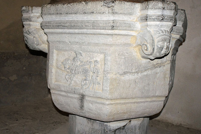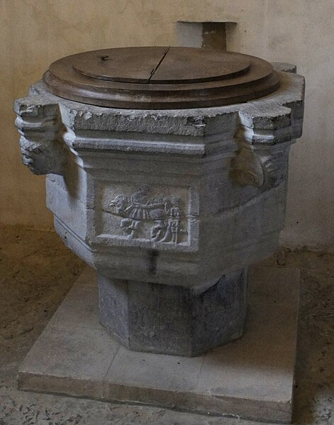 Les fonts baptismaux conservent une cuve en pierre de Meuse du XVIe siècle : la cuve ronde est creusée dans une pierre octogonale, entourée d'un bandeau plat et ornée de quatre têtes (deux masculines et deux féminines), toutes différentes et présentées de face sur un quart de la hauteur du tambour, qui pouvaient servir de poignées. Entre ces têtes figurent quatre motifs encadrés, dont deux représentent saint Martin découpant un pan de son manteau et deux une fleur de lys. On remarque aussi un Christ en bois du XVe siècle ainsi que des statues de sainte Ursule et de saint Martin datant du XVIIe siècle.