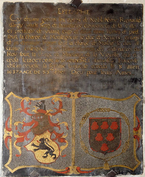 À l'intérieur, une dalle funéraire du XVIIe siècle porte en gravure la figure d'un chevalier et une inscription qui mentionne : « Noble home Regnauld d'Argy.. qui décéda le 12 octobre 1638 âgé de 84 ans et demoiselle Françoise d'Escanvevelle, sa femme, laquelle décéda le 8 avril 1637 âgée de 83 ans ». Le défunt y est nommé gouverneur et prévôt de Warcq, capitaine de vingt hommes de pied et de cinquante chevau‑légers sous le commandement du duc de Nevers et de Rethel.