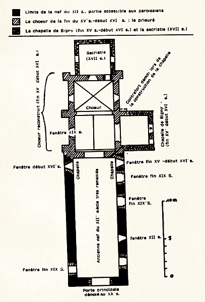 L'église présente une nef romane unique couverte d'un plafond de bois, percée de plusieurs petites fenêtres dont une seule est conservée dans son état primitif; elle communique par une grande arcade cintrée avec deux travées de chœur construites à la fin du XVe siècle ou au début du XVIe siècle, voûtées d'ogives. L'ancien chevet roman a été réemployé pour la plupart des modillons de la corniche extérieure; une sacristie est accolée au chevet et une chapelle seigneuriale, dite chapelle de Bigny, a été ajoutée légèrement plus tard au sud, au niveau de la première travée du chœur. Un petit clocher cubique à toit octogonal, revêtu de bardeaux, se trouvait autrefois entre la nef et le chœur; il a disparu mais l'accès qui y menait a été conservé dans la chapelle de Bigny. L'édifice est de petite taille : la nef mesure 5,70 m de largeur, le chœur 5,30 m de largeur et 9,50 m de longueur, pour une longueur totale de 25,40 m; la nef contient deux autels vides, un de chaque côté du chœur. La chapelle de Bigny renferme plusieurs tombeaux et épitaphes : une grande épitaphe noire partiellement brisée à la mémoire de Joseph de Bigny, une épitaphe en pierre blanche au nom de Sylvine Binet datée du 22 mai 1693 et la pierre tombale de Claude de Bigny, représenté en habit de combat avec une inscription rappelant sa mort le 10 septembre 1622.