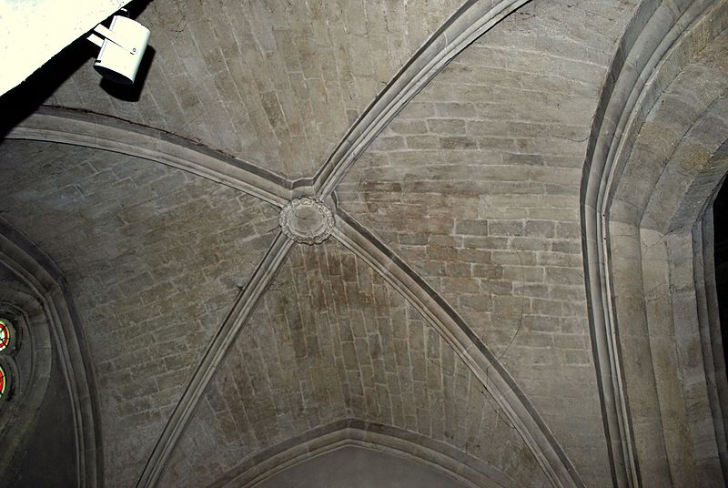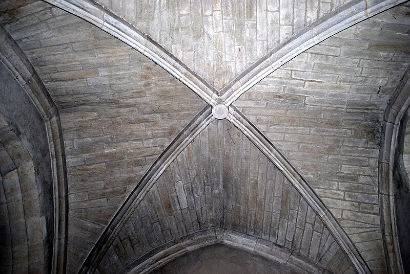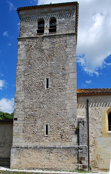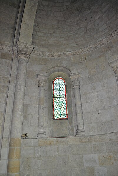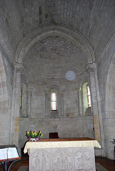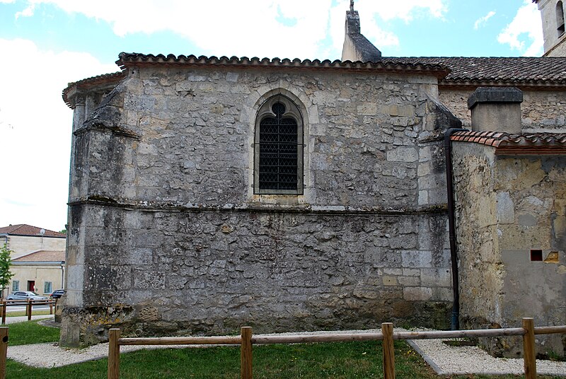 À l'extérieur, l'abside primitive à sept pans a perdu quatre pans lors de l'adjonction des chapelles du transept ; les trois pans subsistants sont séparés verticalement par des contreforts plats et organisés en deux niveaux, un soubassement et un étage ajouré de fenêtres, le tout couronné par une corniche à modillons. Chaque baie axiale est encadrée de colonnettes à chapiteaux sculptés et d'archivoltes ornées d'astéries. La corniche est soutenue par une quinzaine de modillons, dont plusieurs figurés ; ces modillons représentent aussi bien des motifs géométriques que des figures animales, humaines ou grotesques, parmi lesquelles figurent un loup, des joueurs d'instruments, des personnages nus et des bossages. Le clocher carré, placé à l'angle sud-ouest, est essentiellement roman, percé de petites baies en plein cintre et muni d'un cadran solaire daté de 1654 ; l'appareil a été retaillé côté sud. La présence et la disparition de cloches durant la Révolution et les remplacements postérieurs sont attestées par les inscriptions et les fontes mentionnées dans les archives.