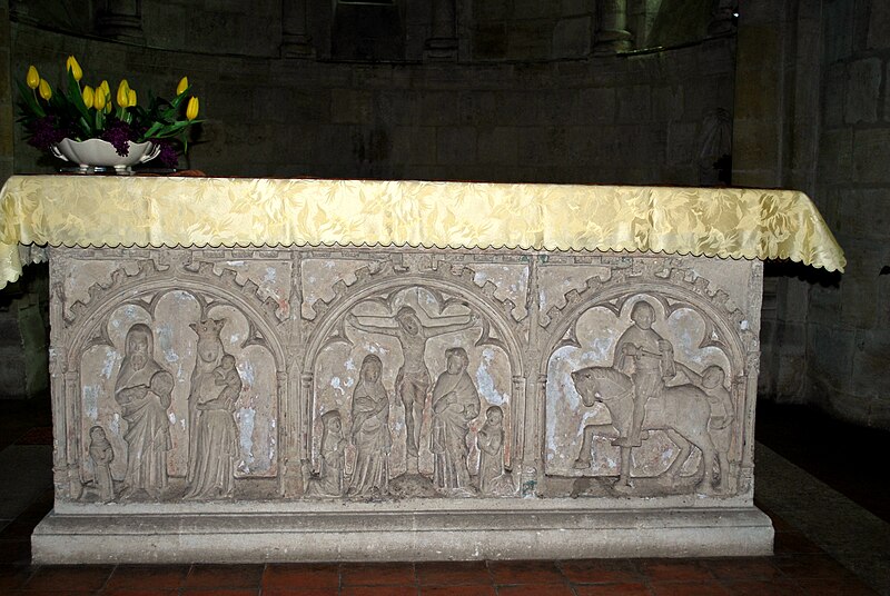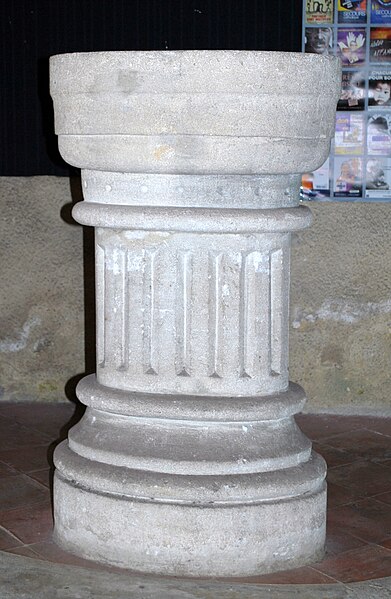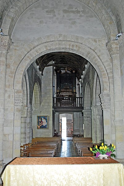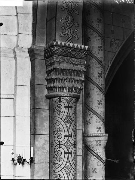 La sculpture romane de l'église relève de deux phases distinctes, XIe siècle et fin XIIe–début XIIIe siècle. Les chapiteaux des quatre grands piliers de la nef appartiennent au XIe siècle et se caractérisent par des corbeilles allongées aux angles abattus et des décors souvent géométriques ou schématiques, avec stries, volutes simplifiées et animaux affrontés. Quelques chapiteaux datent de la reconstruction du chœur et de l'abside à la fin du XIIe siècle et ornent l'arcade romane en plein cintre qui séparait primitivement le chœur des collatéraux. Certains chapiteaux de la nef ont été mutilés lors de l'installation de la chaire ; le chapiteau le plus travaillé présente des scènes figurées avec quadrupèdes, oiseaux et feuillages, tandis que d'autres corbeilles du chœur et de l'abside offrent des motifs de feuilles d'eau, d'astéries et de têtes humaines.