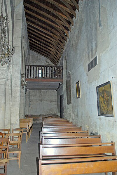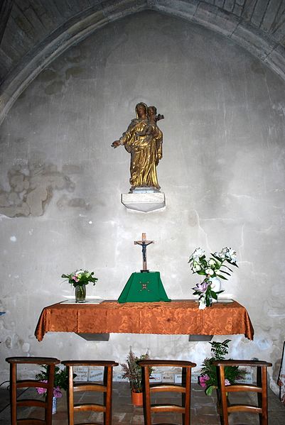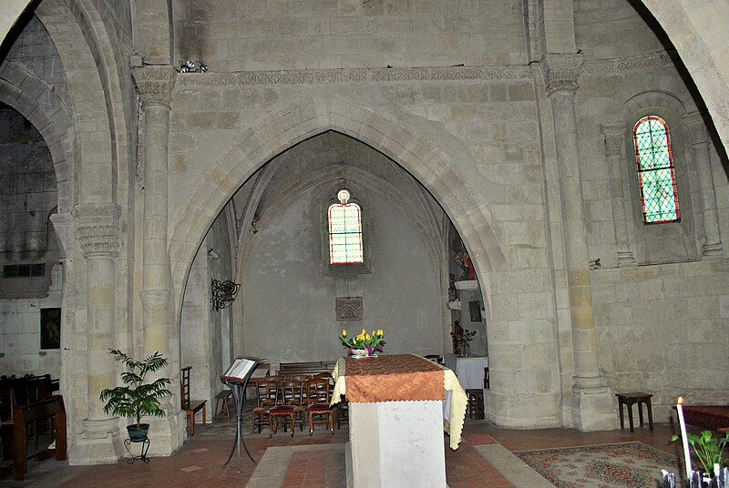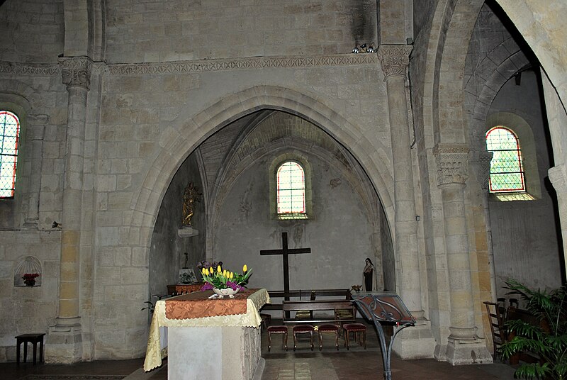 À l'intérieur, on pénètre sous le clocher par une petite porte en plein cintre ; le bas-côté sud compte trois travées si l'on considère le clocher, et des éléments romans indiquent que la façade primitive ne dépassait probablement pas le mur oriental du clocher. L'abside présente une voûte en cul-de-four et des travées droites voûtées en berceau brisé sur doubleaux en appareil régulier ; une grande arcade de communication relie l'abside à la nef. Les vitraux contemporains datent de 1968.