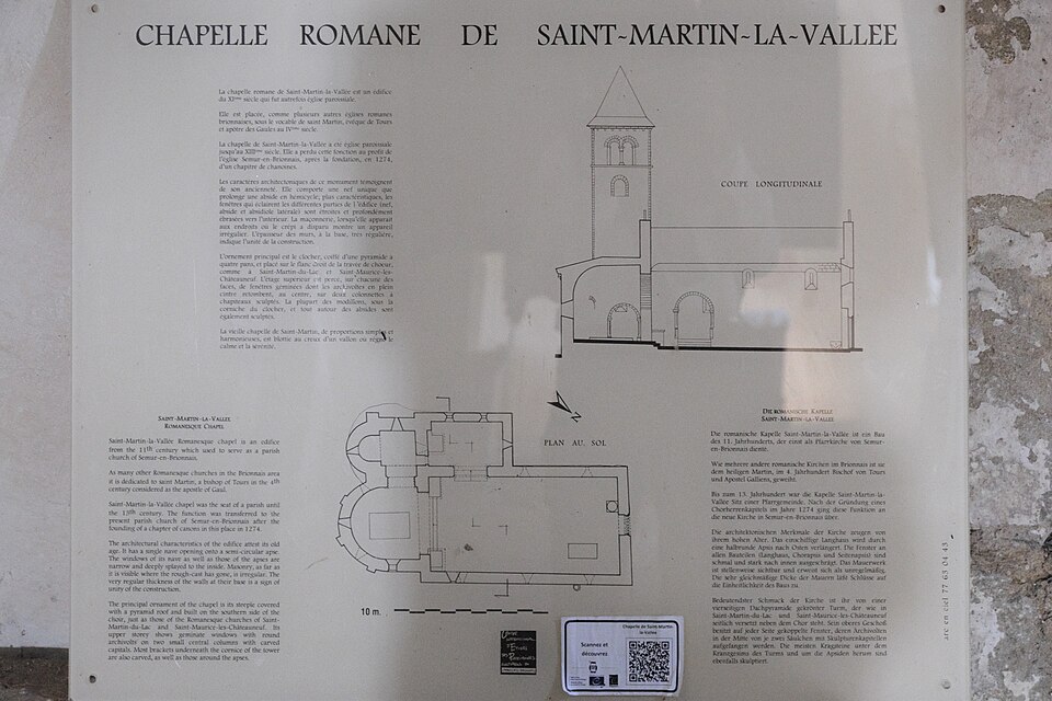 La chapelle romane Saint‑Martin‑la‑Vallée se situe à Semur‑en‑Brionnais, en Saône‑et‑Loire. Elle fut église paroissiale jusqu'en 1274, puis devint chapelle subordonnée à l'église Saint‑Hilaire lors de la création du chapitre de Semur‑en‑Brionnais. Elle fait partie des églises romanes du Brionnais, placées sous l'influence de Cluny. Le hameau de Saint‑Martin‑la‑Vallée se trouve entre le centre historique de Semur‑en‑Brionnais et le bourg de Marcigny, sur un promontoire d'où l'on découvre notamment le château‑fort Saint‑Hugues et l'église Saint‑Hilaire. Outre la chapelle, le hameau comprend le château de la Vallée, qui n'est pas ouvert au public. La paroisse de Saint‑Martin‑la‑Vallée remonte probablement au Xe siècle ; sous la Révolution elle devint commune, qu'elle resta jusqu'à sa fusion avec Semur‑en‑Brionnais en 1825. Le vocable rappelle la popularité de saint Martin de Tours en Bourgogne, où 192 paroisses lui sont dédiées dans les quatre départements régionaux. L'édifice a été bâti entre la fin du XIe et le début du XIIe siècle et appartenait au baron de Semur. Des modifications aux XVIe et XVIIe siècles ont porté sur les peintures murales et sur l'entrée principale, qui passa d'une porte en plein cintre à une porte rectangulaire. La paroisse comprenait plusieurs hameaux — Rochefort, La Fay, les Cours, Vernay, La Cray — ainsi qu'un moulin sur le ruisseau Grozélier (Merdasson) et une fontaine aux eaux légèrement purgatives. L'église est protégée par inscription au titre des monuments historiques par l'arrêté du 29 mars 1971. À l'extérieur, le clocher présente une implantation inhabituelle, perché au sud du chœur plutôt que sur la croisée, disposition que l'on retrouve dans deux églises proches, à Saint‑Maurice‑les‑Châteauneuf et Saint‑Martin‑du‑Lac. Une absidiole a été ajoutée à l'est du clocher, lui‑même composé d'un soubassement ajouré, d'un étage percé de baies et d'une flèche à quatre pans recouverte d'ardoises. Selon Mme Schneiter, citant M. Oursel, le clocher pourrait avoir été construit après l'église et la petite pièce attenante transformée en chapelle des seigneurs de Semur. L'intérieur comporte une nef unique à charpente apparente ; la nef s'ouvre sur le chœur par un arc en plein cintre et l'abside est semi‑circulaire en cul‑de‑four. Des restaurations menées de 1999 à 2014 ont fait réapparaître des peintures murales monumentales dans le chœur, dont un Christ en gloire entouré du tétramorphe dans le cul‑de‑four de l'abside. Ces peintures appartiennent à deux campagnes distinctes, l'une romane aux XIIe–XIIIe siècles et l'autre de la Renaissance au XVIe siècle.