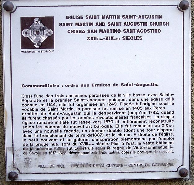 L'église Saint-Martin-Saint-Augustin, dite aussi glèia San-Martin-Sant-Augustin en niçois, se situe place Saint-Augustin dans le Vieux-Nice, Alpes-Maritimes. Elle fait partie des plus anciennes églises de la ville basse, avec Sainte-Réparate et Saint-Jacques-le-Majeur, aujourd'hui souvent appelée Sainte-Rita. Une statue en plâtre de Sainte-Rita, datée des XIXe-XXe siècles et d'art non sulpicien, se trouve dans la première chapelle à gauche. Un couvent des pères ermites de Saint-Augustin fut édifié au XIVe siècle hors des murs de la ville, mais le bâtiment fut rapidement ruiné par les guerres. En 1405, l'évêque de Nice et le chapitre cathédral confièrent l'église paroissiale Saint-Martin aux pères augustins, dans le quartier du Podio ou de Camas Soubran. L'édifice médiéval est représenté sur un plan réalisé par Jean-Louis Baldoino en 1607. L'église actuelle, qui remplace un bâtiment gothique, a été reconstruite à partir de 1636 pour le compte des moines augustins ; les travaux, menés également en accord avec la confrérie des tailleurs de pierre, se sont poursuivis pendant le XVIIe siècle et jusqu'au début du XVIIIe siècle. Un plan conservé à la Bibliothèque nationale de France montre l'aspect extérieur de l'église avant sa transformation au XIXe siècle : une façade avec serlienne, un fronton triangulaire et deux clochers assez bas. Ce type d'architecture était courant dans le triangle Nice-Gênes-Turin. Le plan du Consiglio d'Ornato pour la façade porte la date de 1834 et la façade ne fut achevée qu'en 1895. Le tremblement de terre de février 1887 détruisit le second clocher. Une note des archives de l'église atteste le passage de Martin Luther le 20 juin 1510, alors moine augustin, qui y célébra une messe dans l'ancien édifice. C'est également dans cette église que fut baptisé Joseph Garibaldi le 19 juillet 1807. L'édifice est classé aux monuments historiques depuis le 4 février 1946. L'église actuelle relève du baroque italien ; son intérieur et son chœur sont baroques et elle abrite une Pietà de la Renaissance attribuée au peintre niçois Louis Bréa.