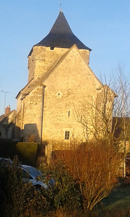 Les murs de la nef, en petit appareil, datent globalement du Xe siècle. Cet édifice carolingien a été remanié à plusieurs reprises. Deux grosses piles cylindriques engagées précèdent le chœur d'une travée voûtée par une croisée d'ogives, des doubleaux et des formerets en arc brisé. Sur cette travée s'élève un clocher carré et fortifié, flanqué d'échauguettes à chaque angle, daté du XIIe siècle, et l'édifice se termine par un court sanctuaire de la même époque. Aux angles du chevet plat se dressent deux tourelles cylindriques. Au pignon, dans l'appareil, apparaît une croix latine ornée d'entrelacs et d'une rosace qui surmonte un écu bandé.