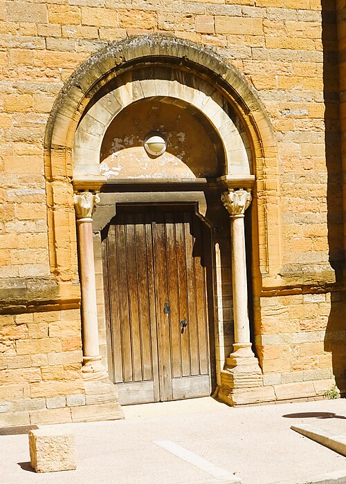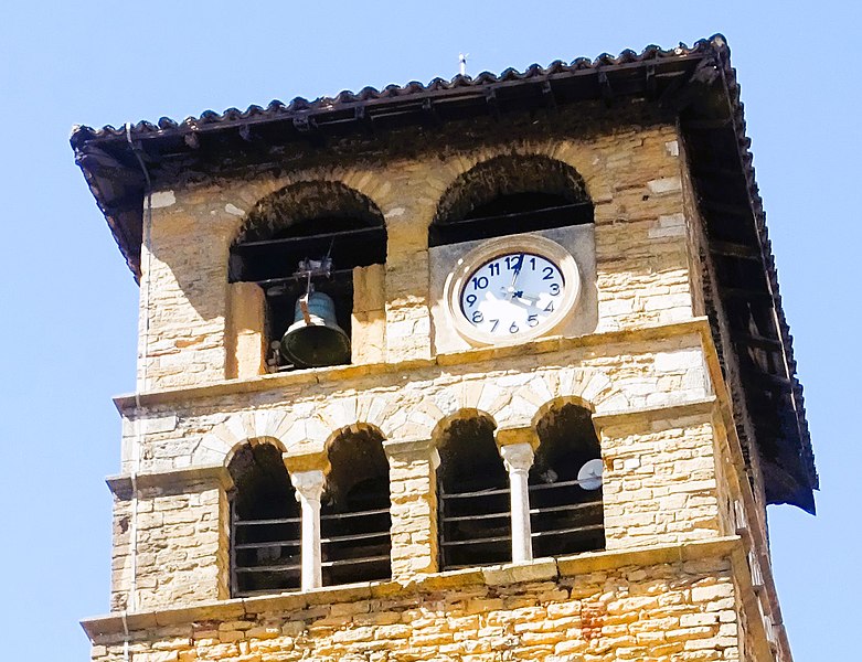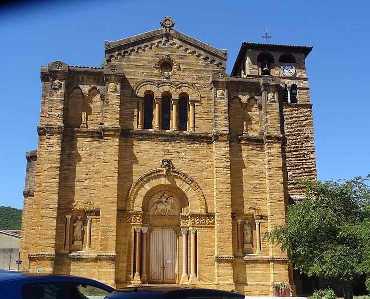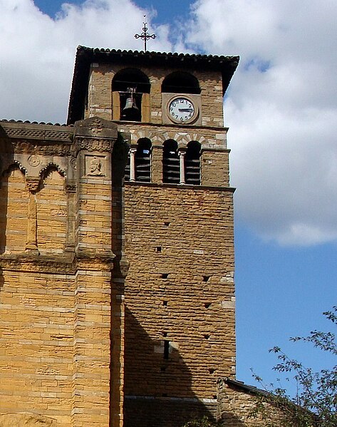 L'église Saint-Maurice de Couzon-au-Mont-d'Or, située dans la métropole de Lyon à environ 10 kilomètres au nord de la ville, est un édifice catholique dont l'ancienne église apparaît dans les textes à partir du XIVe siècle, bien que sa fondation soit probablement antérieure. L'examen stylistique de la partie la plus ancienne la rattache au XIIe siècle. L'église actuelle a été conçue par les architectes Pierre Bossan et Wilhelm Léo, construite entre 1855 et 1876, puis consacrée le 7 juillet 1889 par l'archevêque Joseph-Alfred Foulon. Elle est dédiée à saint Maurice et ses compagnons, comme l'indique une inscription latine sur le fronton. Le bâtiment présente une silhouette trapue : il est essentiellement rectangulaire de la façade jusqu'au transept, avec une abside semi-cylindrique dont la hauteur est à peu près équivalente à celle de la nef. Les pierres de taille sont régulièrement alignées selon un agencement original : une assise intercalaire de calcaire ordinaire blanc-gris court sur toute la hauteur et met en valeur deux niveaux de « pierres de Couzon » à la teinte dorée, atténuée par le temps. Un rang de pierres saillantes et décorées entoure l'édifice aux deux tiers de sa hauteur. La couverture est réalisée en tuiles « romanes » (tuiles canal), matériau traditionnel des maisons locales mais peu fréquent pour ce type d'édifice ; le toit principal à double pente couvre sans discontinuité les trois nefs. L'ornementation, d'inspiration néoromane, se manifeste notamment par un portail encadré de colonnes à chapiteaux, surmonté d'un arc de plein cintre et d'un fronton sculpté, flanqué de deux niches à colonnettes contenant les statues de saint Laurent et de saint Vincent. Les fenêtres obéissent à un module étroit et surmonté d'un arc : elles sont simples pour l'abside et groupées en doubles ou triples sur la façade et les flancs, en harmonie avec le clocher dont le style roman est ancien. Le haut de l'abside est décoré de mâchicoulis qui se prolongent en festons le long du bâtiment. Des vues présentent le portail, le chevet, le flanc ouest et l'abside. Le clocher, de plan carré, est adossé au flanc est de l'église ; il correspond à l'ancienne tour sud-est d'un château disparu, daté du XIIIe siècle. Cette tour, qui a appartenu à une église antérieure, conserve une cloche du XVIe siècle qui sonne encore les heures, et on y a ajouté cinq autres cloches réalisées par le fondeur Gédéon Morel en 1840. Le clocher est construit en pierres de Couzon plus grossières que celles de l'édifice moderne, disposées en assises superposées ; seules les arches des fenêtres sont polychromes et leurs colonnettes en calcaire blanc. La tour a la forme d'un parallélépipède à base carrée, coiffé d'un toit à quatre pentes très aplati couvert de tuiles traditionnelles ; son corps moyen porte de nombreux trous de boulin. Le corps supérieur, qui abrite les cloches, présente sur chaque face une partie basse percée de deux doubles fenêtres à persiennes et une partie haute percée de deux larges baies partiellement murées. Le clocher est inscrit au titre des monuments historiques depuis le 5 juillet 1927.