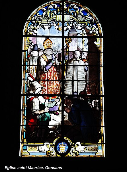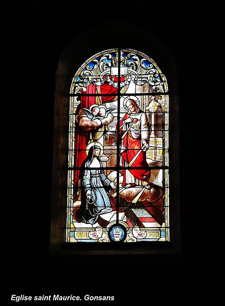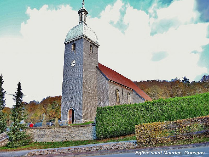 L'église paroissiale Saint-Maurice se situe à Gonsans, dans le département du Doubs en France. Une église est mentionnée dès 1138. En 1722, l'édifice était en ruine ; Pierre Bassignot proposa un plan et les travaux furent réalisés en 1724-1725. L'église fut consacrée en 1776 par Monseigneur Jouffroy-Gonsans, évêque de Gap. Elle est inscrite au titre des monuments historiques depuis le 3 août 2009. L'édifice dépend de la paroisse de Bouclans, dite paroisse du Plateau de Boulcans, rattachée au diocèse de Besançon. Il est précédé d'un clocher-porche surmonté d'un dôme à impériale, de type galbé franc-comtois, et les façades est et sud du clocher sont revêtues de tavaillons, planches de bois destinées à protéger la façade des intempéries. L'église se compose d'un seul vaisseau voûté d'arêtes reposant sur des piliers toscans ; la nef se termine par une abside à pans, avec la sacristie dans l'axe, et quatre chapelles latérales ouvrent sur la nef. L'intérieur a été entièrement peint entre 1869 et 1872 ; le décor décoratif souligne les structures et délimite les surfaces, tandis que le décor figuré comprend de grandes scènes représentant notamment saint Maurice, trois autres saints et quatre épisodes de la vie de la Vierge. Le mobilier est remarquable et plusieurs pièces sont protégées au titre d'objets des monuments historiques : un retable en pierre du XVIe siècle, long de deux mètres, sculpté dans un style gothique flamboyant et représentant le Christ en croix entre les deux larons, la Vierge Marie et les apôtres, classé le 5 décembre 1908 ; une Vierge de piété en pierre polychrome et une statue équestre de saint Georges, toutes deux en pierre polychrome du XVIe siècle et classées le 10 mai 1928 ; enfin les fonts baptismaux et leur retable en bois taillé et doré du XVIIIe siècle, classés le 3 octobre 1988.