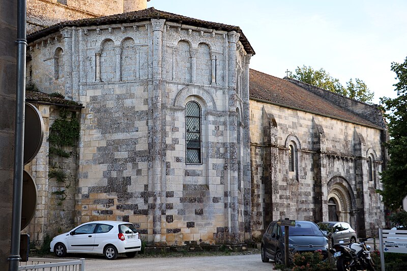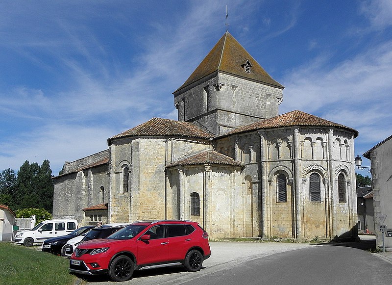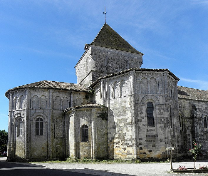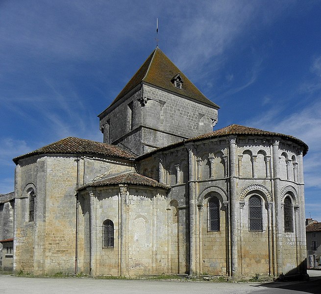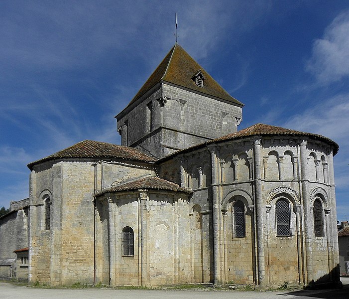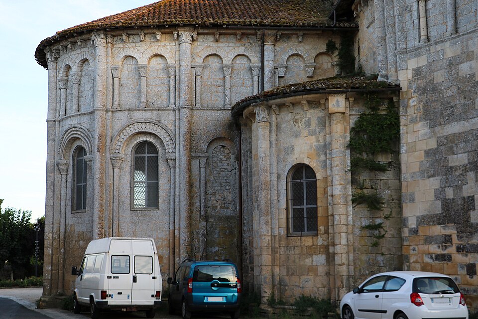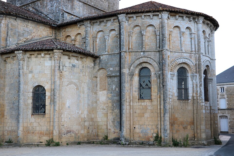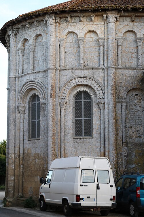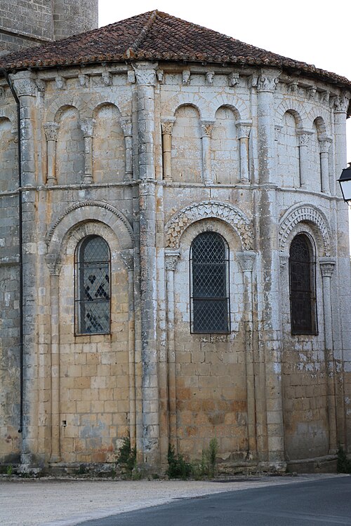Le chevet, de style roman à absidioles, conserve sur ses moellons les marques des tailleurs de pierre. Les fenêtres en plein cintre sont encadrées de larges arcatures aveugles, chacune correspondant à deux plus petites à l'étage supérieur ; ces arcatures reposent sur de fines colonnes surmontées de chapiteaux sculptés. Une corniche à modillons ceinture l'abside et les absidioles, et l'ensemble rappelle l'art roman saintongeais par ses contreforts‑colonnes et ses arcades.