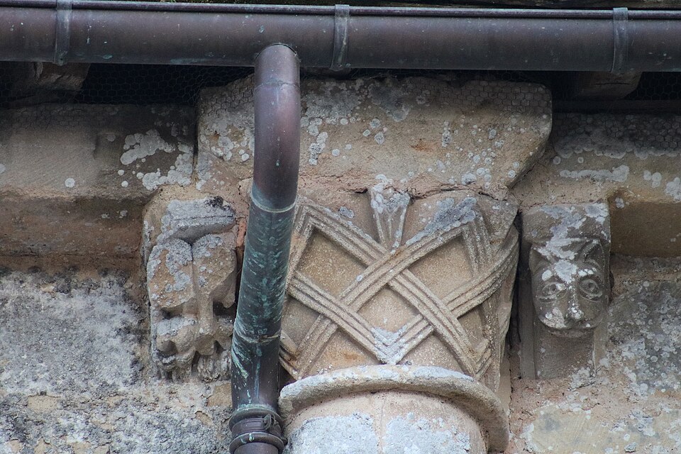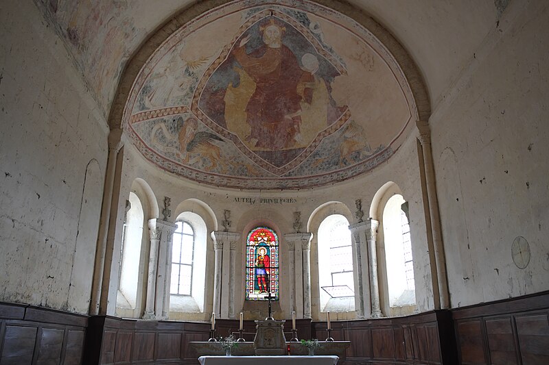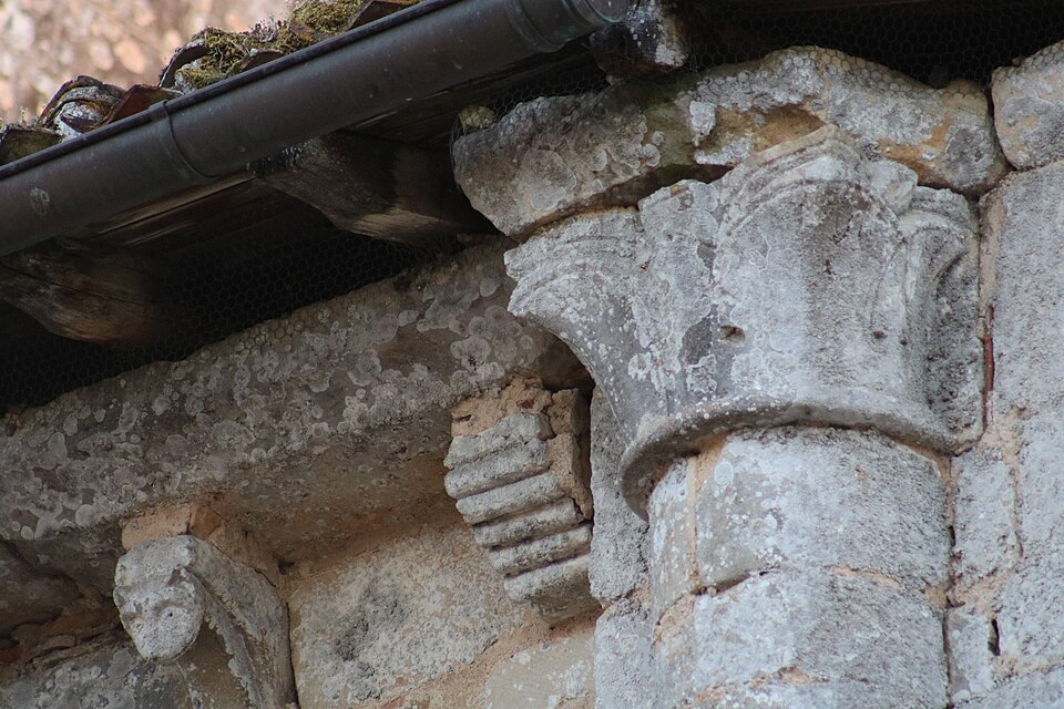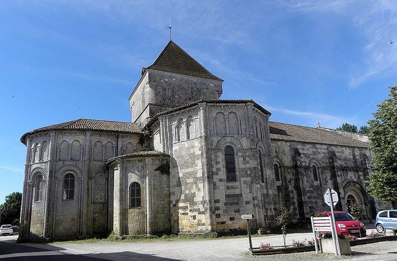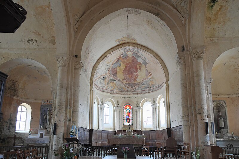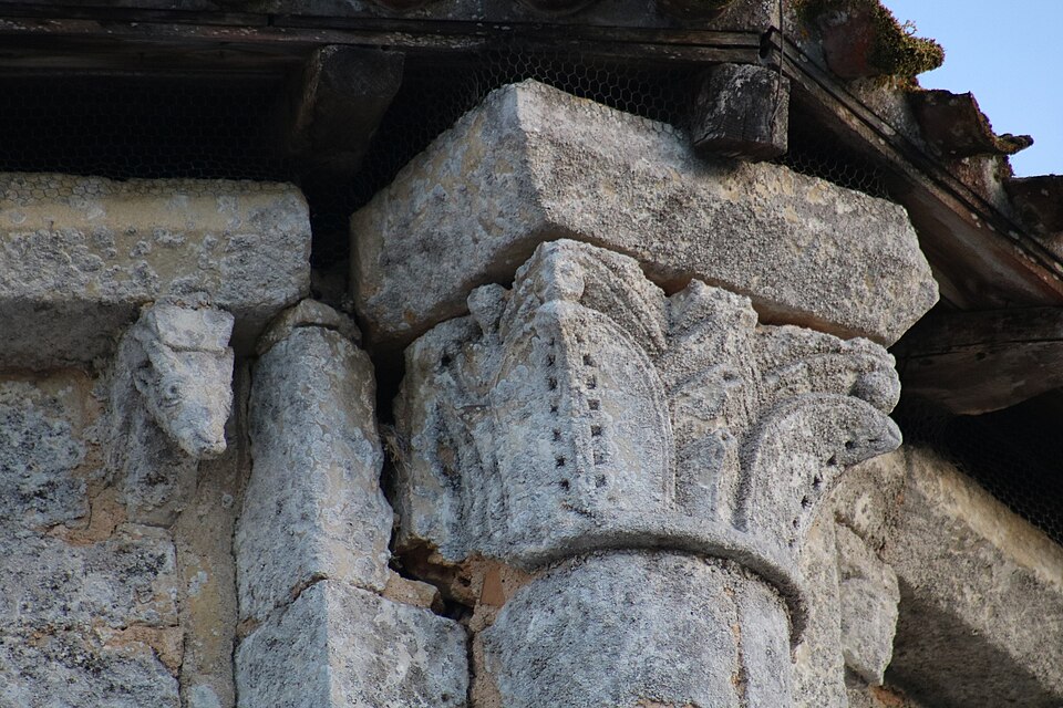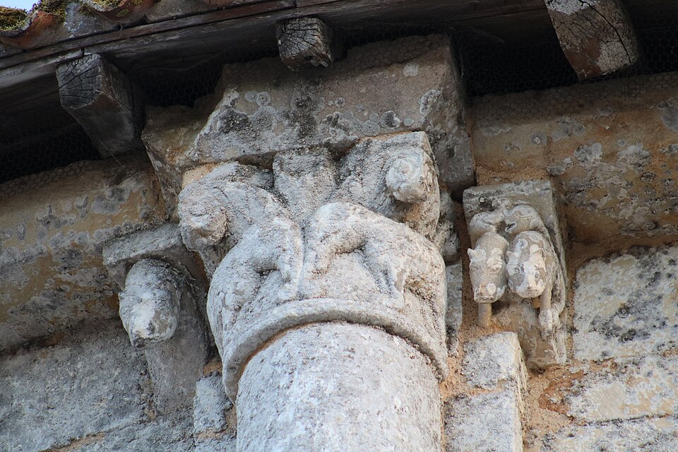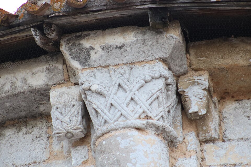 Le chevet, de style roman à absidioles, conserve sur ses moellons les marques des tailleurs de pierre. Les fenêtres en plein cintre sont encadrées de larges arcatures aveugles, chacune correspondant à deux plus petites à l'étage supérieur ; ces arcatures reposent sur de fines colonnes surmontées de chapiteaux sculptés. Une corniche à modillons ceinture l'abside et les absidioles, et l'ensemble rappelle l'art roman saintongeais par ses contreforts‑colonnes et ses arcades.