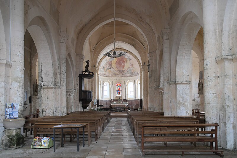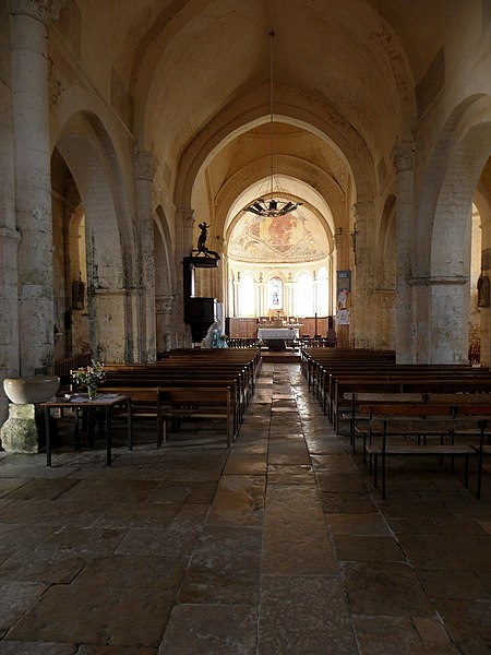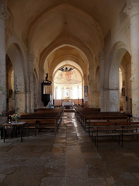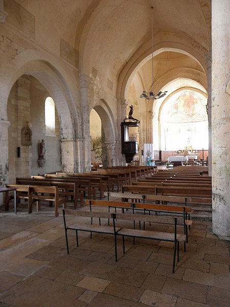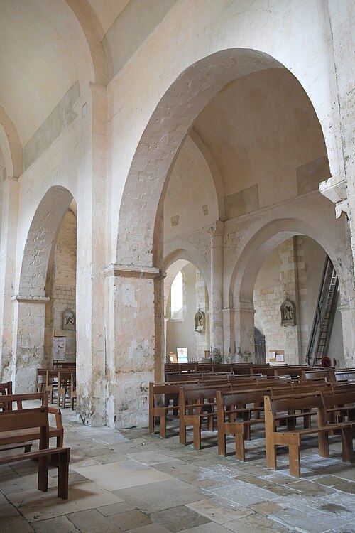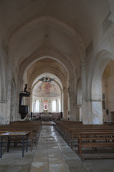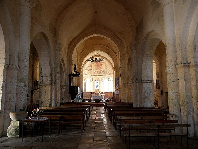 L'église se compose d'une nef et de deux collatéraux d'à peu près la même hauteur ; l'éclairage provient des bas‑côtés et du chœur, dans un style roman poitevin caractéristique. L'édifice mesure environ 20 mètres dans sa plus grande largeur pour 30 mètres de longueur ; le plan de la nef est légèrement trapézoïdal. Le transept possède des absidioles orientées et le chœur comprend deux courtes travées suivies d'un hémicycle.