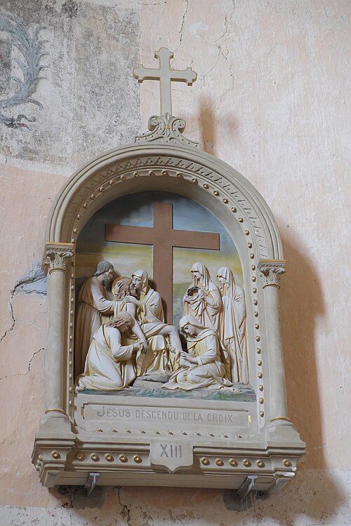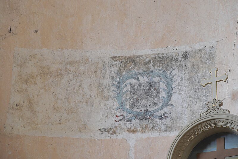 L'intérieur conserve des peintures des XIVe et XVIe siècles, aujourd'hui dégradées par l'humidité : à la voûte de l'abside se distingue un grand Christ en majesté entouré d'un quadrilobe où figurent les symboles des évangélistes ; sur le berceau du chœur apparaissent des prophètes et des apôtres partiellement effacés ; dans le bas‑côté droit figurent des peintures du XVIe siècle, difficiles à lire, représentant des bateaux. On y trouve également une litre seigneuriale.