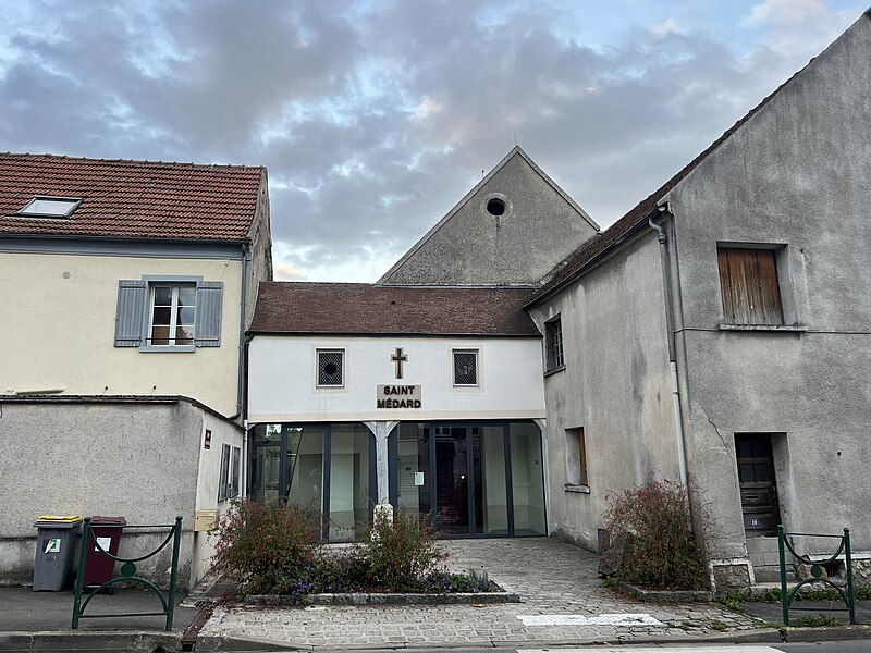 L'église appartient à la paroisse « Saint‑Médard » (secteur Le Plateau), rattachée au diocèse de Saint‑Denis depuis 2008. Orientée, elle présente un plan allongé avec une nef à deux vaisseaux et des voûtes d'ogives. Le chevet plat, situé au sud, est accolé à une petite sacristie coiffée d'une toiture en appentis et en croupe. Au‑dessus se dresse une tour‑clocher qui abrite une chambre de cloches munie d'abat‑sons ; la cloche, bénie en 1769, porte le nom d'Adrienne‑Louise. La toiture du clocher est à quatre pans et coiffée d'un épi de faîtage. La façade à pignon est percée d'un portail rectangulaire épaulé par un contrefort à ressauts et pourvue d'une galerie suspendue sur poteaux servant de passage vers des dépendances mitoyennes. Les murs latéraux sont percés de baies en arc brisé et l'ensemble est couvert d'une toiture à double pente. Des notices et ressources en ligne existent, notamment sur Wikimedia Commons, IdRef, Clochers de France, GCatholic.org, l'Observatoire du patrimoine religieux et la base Mérimée.