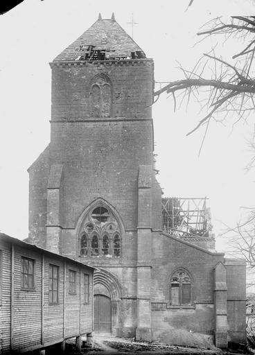 À l'extérieur, la façade est dominée par une tour carrée et massive coiffée d'un toit à quatre pans ; au-dessus de la croisée du transept s'élève un clocher effilé surmonté d'une pyramide octogonale et orné de quatre clochetons. Le portail, au bas de la tour et encadré par deux contreforts, présente une voussure en ogive basse décorée de six cordons saillants reposant sur des colonnettes. Au-dessus s'ouvre une arcade ogivale percée de fenêtres à meneau et d'une rosace dont le vitrail illustre la légende de l'aigle protégeant saint Médard, renvoyant à la symbolique du ciel et des éléments. Le flanc droit comporte quatre pignons et une porte surmontée d'un fronton triangulaire orné de volutes.