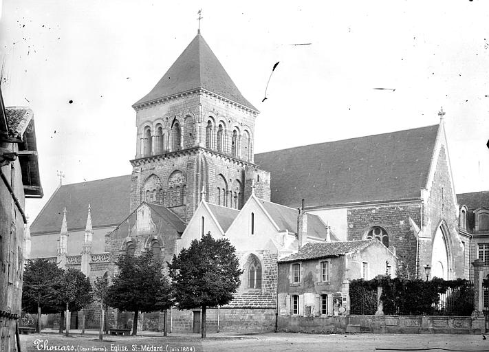 L'église Saint-Médard, surnommée Saint-Médard-des-Champs, est une église catholique située dans le centre ancien de Thouars, sur la place qui porte son nom, dans le département des Deux-Sèvres. Les premières traces de présence humaine dans le périmètre remontent au IXe siècle, attestées par la découverte de monnaies dans des sarcophages, et la première mention documentaire de l'église date de 988. L'édifice a été édifié à partir du Xe siècle et a subi des transformations importantes jusqu'au XIXe siècle. Des éléments des murs et de la façade inférieure, ainsi que les portails nord et ouest et une grande partie du mur sud, sont conservés de l'édifice du XIIe siècle. L'église fut en grande partie détruite lors de la prise de Thouars par Henri II Plantagenêt en 1158, puis partiellement reconstruite dans les décennies suivantes avec le soutien du roi d'Angleterre. À la fin du Moyen Âge, les trois nefs primitives furent fusionnées pour former un vaste espace central ; la disposition actuelle date principalement des XVe et XVIe siècles. À partir des bases anciennes on créa une nef à six travées voûtée sur croisées d'ogives à liernes longitudinales ; l'élargissement de la nef entraîna l'édification, entre chaque travée, de massifs intérieurs faisant office de contreforts et portant les voûtes. Les espaces entre ces massifs furent couverts en berceaux et leur fond correspond au mur primitif du XIIe siècle. Le chevet est percé d'une baie en tiers-point dont l'archivolte est ornée de choux frisés. La chapelle des Trois-Maries ou du Saint-Sépulcre fut édifiée à la hauteur de la quatrième travée en 1480 et une autre chapelle de deux travées fut ajoutée en 1510 ; la chapelle Saint-Louis est attribuée à Gabrielle de Bourbon. Le grand clocher carré de l'église est également construit à cette époque. L'étage inférieur de la façade occidentale appartient au XIIe siècle ; son portail central présente quatre voussures sculptées et est encadré d'arcs aveugles à deux rangs de voussures ornées. Les contreforts surmontés de pinacles, ainsi que la fenêtre et la galerie d'arcs tréflés qui la surmonte, relèvent du XVe siècle. Au-dessus du portail, une représentation du Christ dans une gloire, entouré d'anges dans de petites arcades, complète le décor sculpté qui comprend également les Douze Apôtres, l'Ascension du Christ et des symboles d'immortalité ; le portail nord est quant à lui marqué par un arc polylobé de tradition mozarabe. Pendant les XVIe et XIXe siècles des boutiques furent installées contre le portail sur le parvis, notamment des poissonniers ; ces échoppes, qui endommagèrent l'édifice, furent détruites en 1866. En 1691 le cimetière accolé à l'église fut réduit pour lutter contre les profanations et il cessa d'être utilisé à partir de 1747. Au XIXe siècle un vaste programme de restauration du portail principal, dirigé par l'architecte Daviaud, s'étendit jusqu'en 1870. L'édifice fut classé au titre des monuments historiques le 9 juillet 1909 ; la toiture fut achevée en 1920 et la flèche prévue sur le clocher ne fut jamais installée. À partir de 1993 la ville entreprit une rénovation progressive des murs extérieurs, utilisant notamment la biominéralisation par injection de bactéries dans le tuffeau pour renforcer la pierre. Le mur sud accueille depuis 2005 des vitraux contemporains réalisés par l'atelier du vitrail de Limoges pour remplacer ceux détruits lors des bombardements de 1944 ; aucun vitrail actuel n'est d'origine. L'église Saint-Médard constitue un exemple du roman poitevin, sa façade étant rapprochée de celles de l'abbatiale de Saint-Jouin-de-Marnes et de la collégiale Notre-Dame-la-Grande de Poitiers. Un ancien cimetière occupait les espaces au nord et à l'est de l'église.