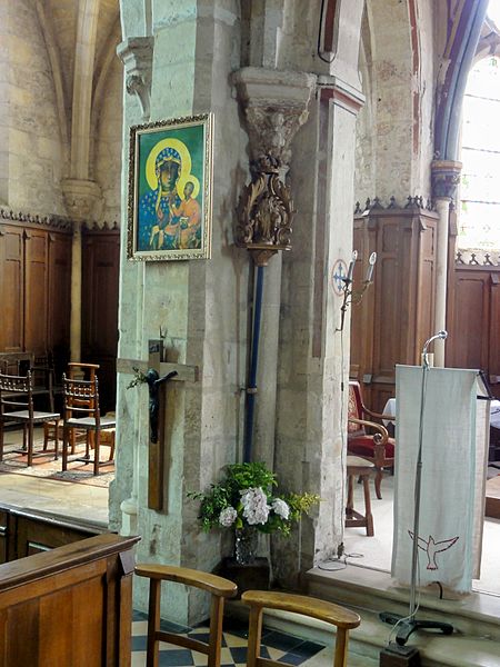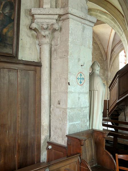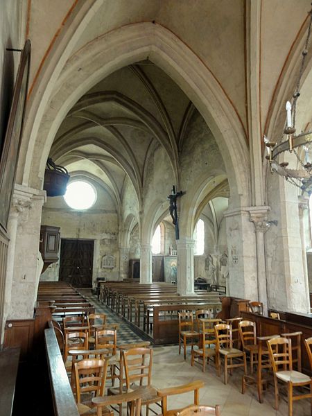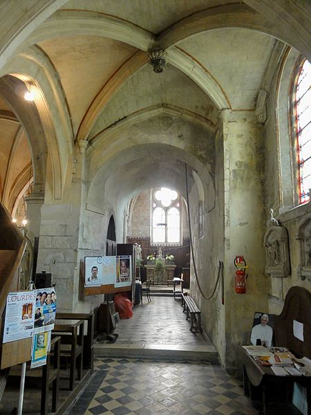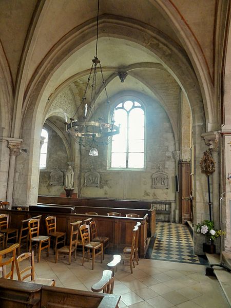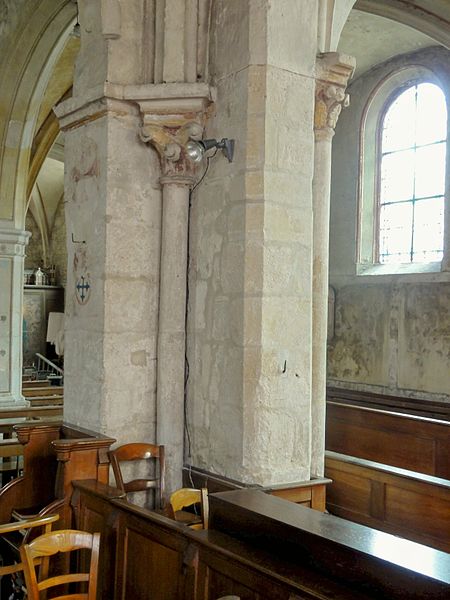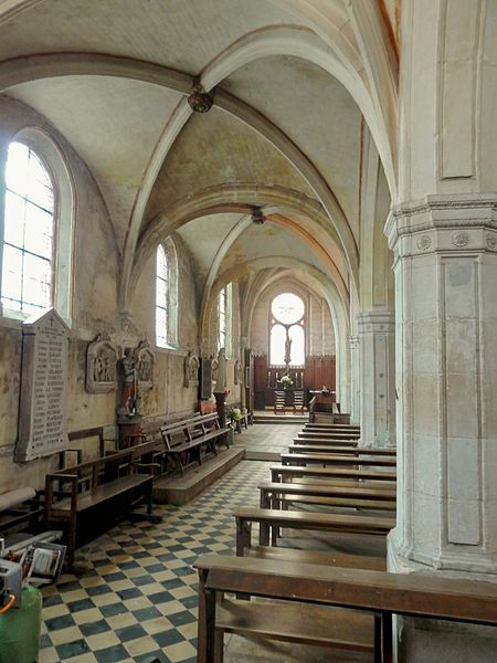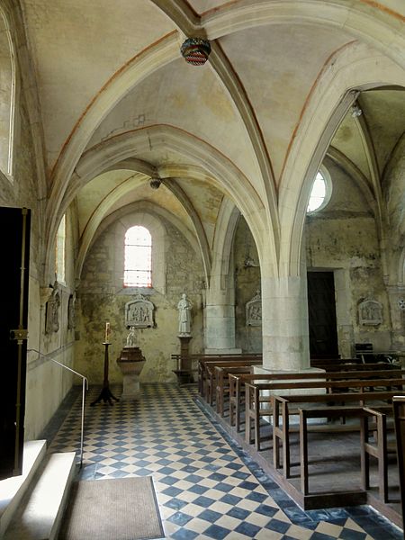 Le chœur, voûté à une hauteur moindre que la nef, conserve de nombreux chapiteaux sculptés et des vestiges de polychromie, ainsi qu'un maître-autel et des boiseries néogothiques qui respectent les supports médiévaux. La chapelle nord, dédiée à la Vierge, se compose de deux travées et conserve des chapiteaux témoignant d'une évolution stylistique vers un naturalisme plus marqué ; la chapelle sud, dédiée à saint Médard et située sur l'emplacement du chœur primitif, est plus petite et abrite un doubleau médiéval et deux chapiteaux identiques. La base du clocher, voûtée en berceau et percée d'une arcade plein cintre, montre des murs épais avec un placard ménagé dans l'épaisseur et communiquait autrefois avec l'église sans sacristie extérieure jusqu'à la construction de celle-ci en 1867.