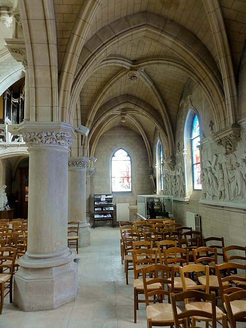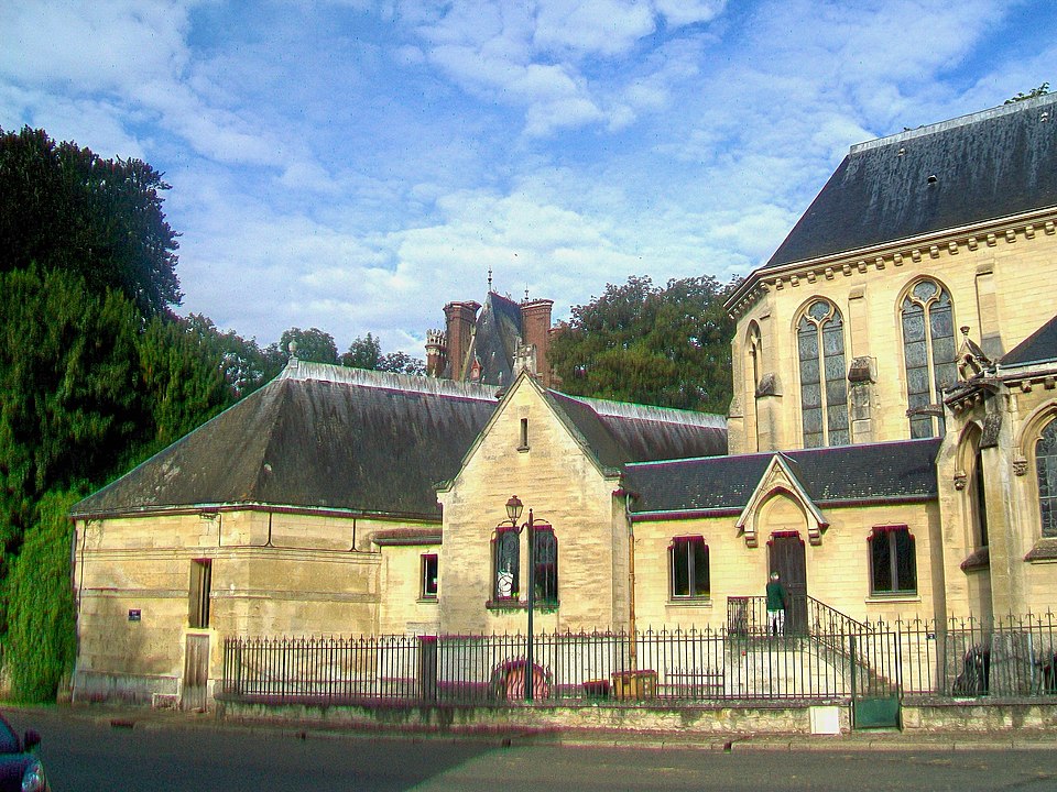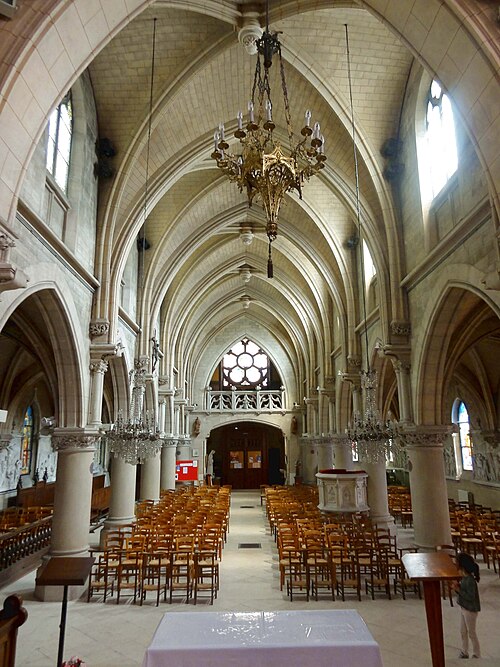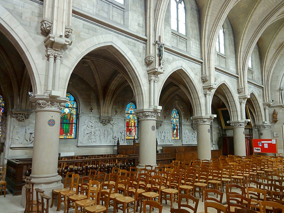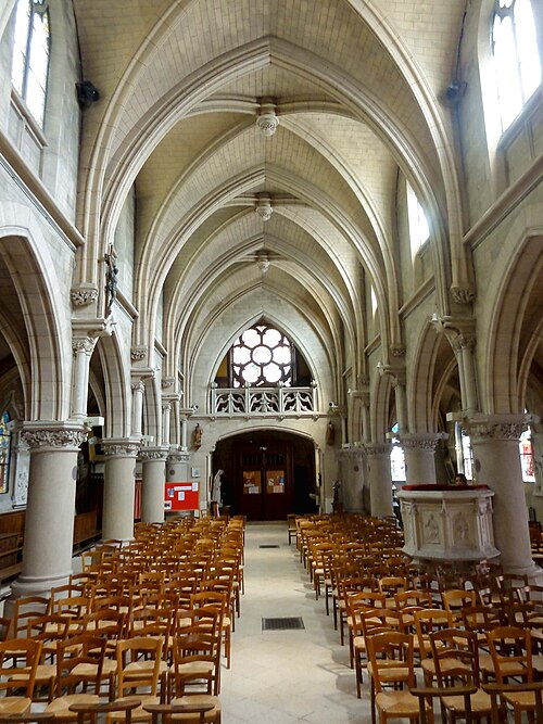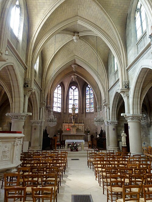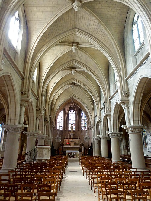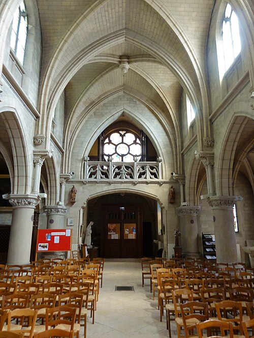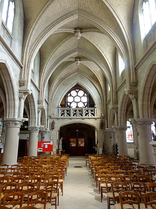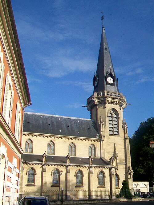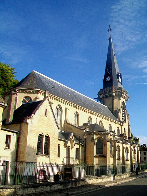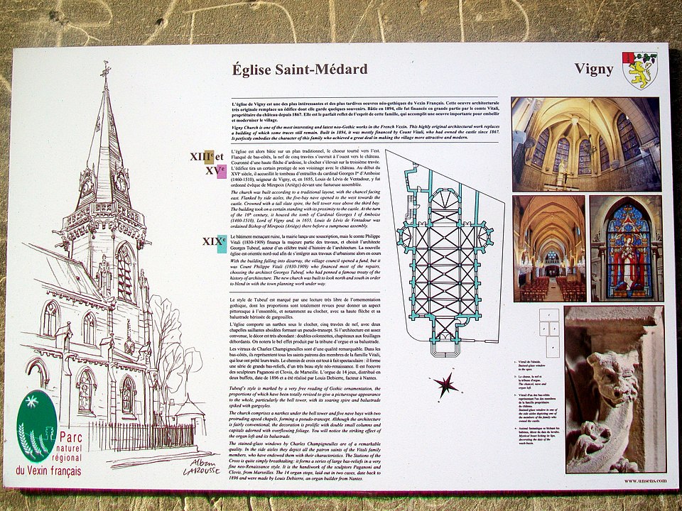 Au cœur du village de Vigny, l'église Saint‑Médard jouxte le domaine du château et forme avec lui un ensemble historique indissociable. Le domaine a été acquis par le comte Philippe Vitali en 1867 ; homme d'affaires vénitien d'origine grecque ayant fait fortune dans les chemins de fer, il lança une vaste opération de modernisation du village. Après une importante campagne de travaux sur le château (Cazaux, architecte, 1888), il organisa un concours pour la reconstruction de l'église, qui désigna Georges Tubeuf comme architecte. Né en 1850 et admis aux Beaux‑Arts de Paris en 1869, Tubeuf, surtout connu comme théoricien, n'est guère identifié pour d'autres réalisations, si ce n'est sa participation au chantier du château. L'église et plusieurs bâtiments et travaux d'utilité publique de la commune furent quasi intégralement financés par le comte Vitali, ce qui explique l'unité stylistique et l'homogénéité du centre bourg. Construite à partir d'octobre 1894 et achevée en 1896, la nouvelle église remplace une bâtisse médiévale démolie en raison de sa vétusté. La reconstruction entraîna aussi la démolition de l'ancien presbytère au profit d'une place mettant en valeur la façade principale ; cette mise en scène urbaine semble avoir été voulue par le comte pour créer un écrin au château et à l'église. Le chevet de l'édifice est adossé, au sud‑ouest, à l'orangerie du château (XVIIe siècle) ; un petit escalier ménagé contre le chœur, dans le prolongement du bas‑côté nord, permettait au châtelain d'accéder directement à l'église depuis l'orangerie. Suivant les préconisations du conseil des bâtiments civils pour les églises paroissiales, Saint‑Médard présente un plan en croix latine à trois vaisseaux, un chevet polygonal et un transept légèrement saillant. Le clocher‑porche renvoie au type courant de l'église rurale, tandis que le couvrement en briques de ciment de la nef et des bas‑côtés témoigne d'une recherche d'économie. Si, à première vue, l'édifice rappelle les réalisations du XIXe siècle influencées par le rationalisme du conseil des bâtiments civils, son gabarit, sa flèche élancée et sa richesse ornementale lui confèrent un caractère remarquable. Les vitraux, luminaires et sculptures forment un ensemble homogène, assez luxueux et rare en grande couronne, dont les auteurs sont identifiés. Le répertoire décoratif s'inspire volontiers des modèles médiévaux, principalement du gothique du XIIIe siècle, et le programme iconographique porte la marque personnelle de Vitali, soulignant la parenté évidente entre l'église et le château ; l'empreinte des pouvoirs publics y reste modérée du fait du contexte social et financier spécifique.