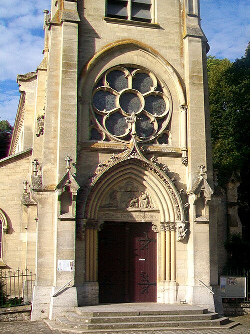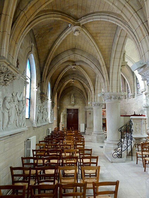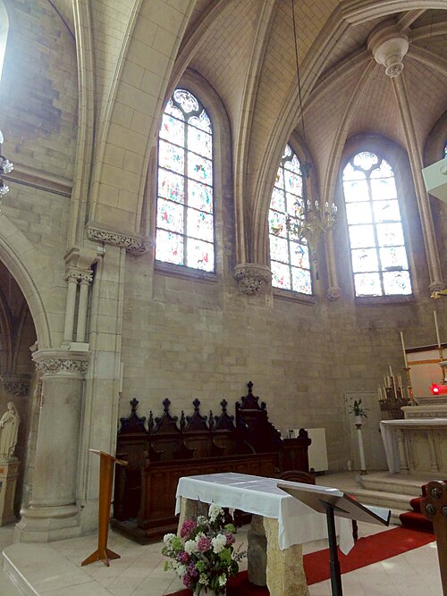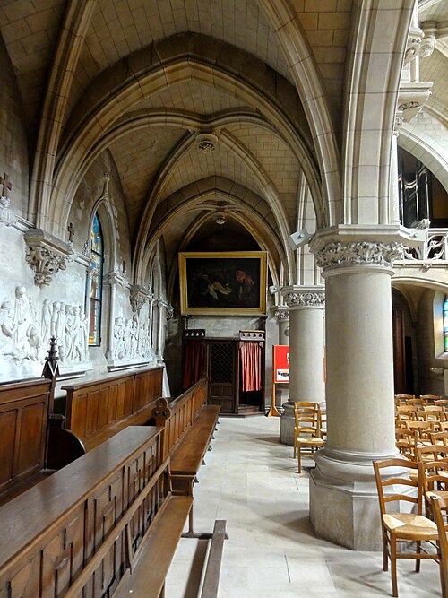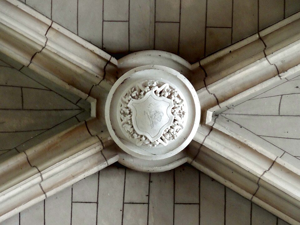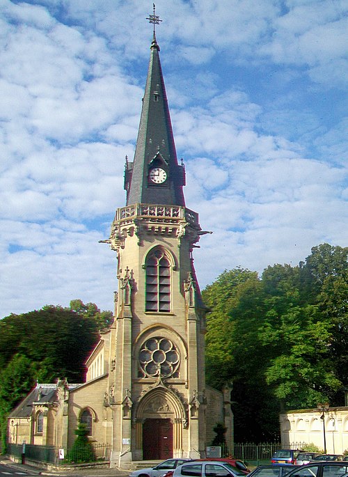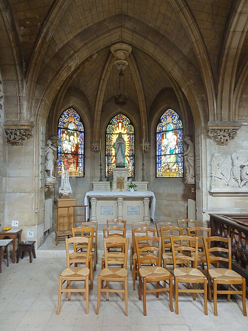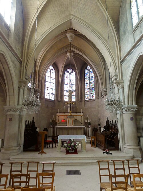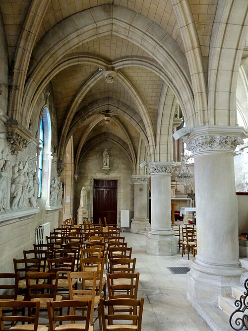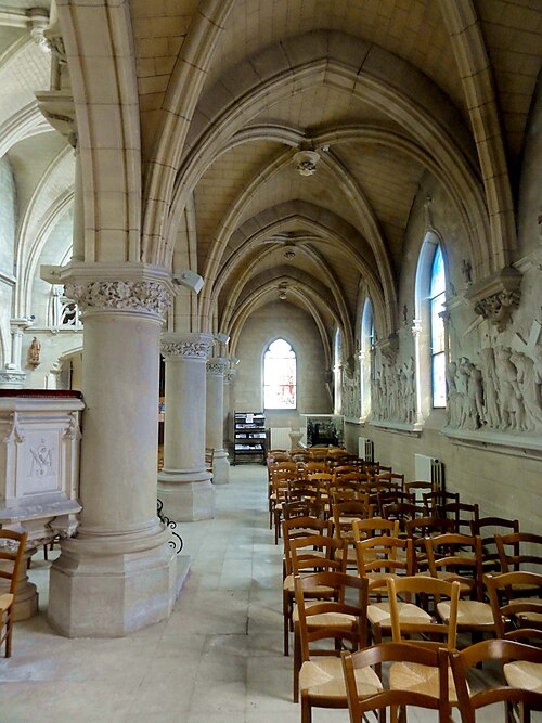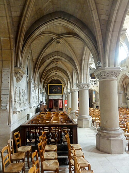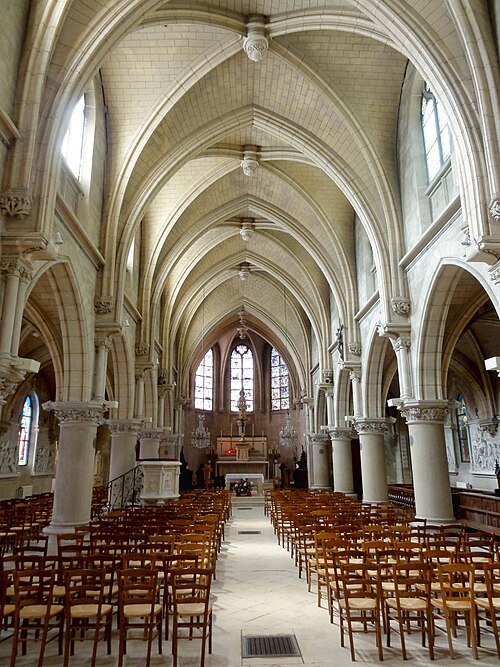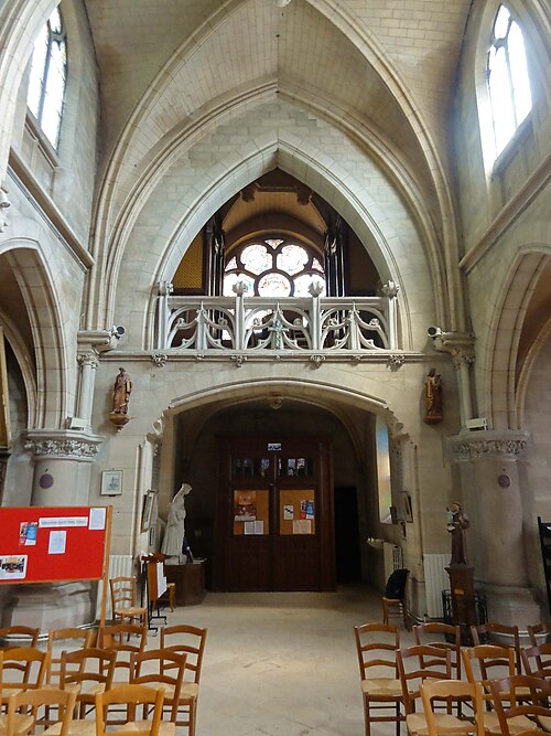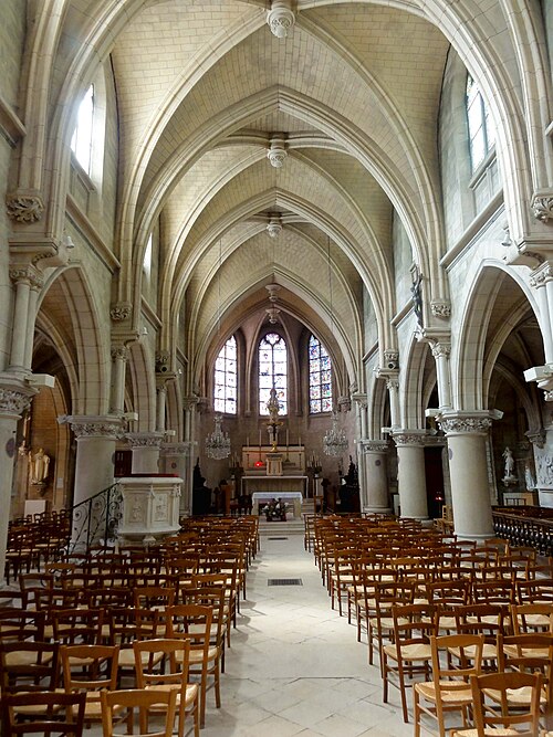 Au cœur du village de Vigny, l'église Saint‑Médard jouxte le domaine du château et forme avec lui un ensemble historique indissociable. Le domaine a été acquis par le comte Philippe Vitali en 1867 ; homme d'affaires vénitien d'origine grecque ayant fait fortune dans les chemins de fer, il lança une vaste opération de modernisation du village. Après une importante campagne de travaux sur le château (Cazaux, architecte, 1888), il organisa un concours pour la reconstruction de l'église, qui désigna Georges Tubeuf comme architecte. Né en 1850 et admis aux Beaux‑Arts de Paris en 1869, Tubeuf, surtout connu comme théoricien, n'est guère identifié pour d'autres réalisations, si ce n'est sa participation au chantier du château. L'église et plusieurs bâtiments et travaux d'utilité publique de la commune furent quasi intégralement financés par le comte Vitali, ce qui explique l'unité stylistique et l'homogénéité du centre bourg. Construite à partir d'octobre 1894 et achevée en 1896, la nouvelle église remplace une bâtisse médiévale démolie en raison de sa vétusté. La reconstruction entraîna aussi la démolition de l'ancien presbytère au profit d'une place mettant en valeur la façade principale ; cette mise en scène urbaine semble avoir été voulue par le comte pour créer un écrin au château et à l'église. Le chevet de l'édifice est adossé, au sud‑ouest, à l'orangerie du château (XVIIe siècle) ; un petit escalier ménagé contre le chœur, dans le prolongement du bas‑côté nord, permettait au châtelain d'accéder directement à l'église depuis l'orangerie. Suivant les préconisations du conseil des bâtiments civils pour les églises paroissiales, Saint‑Médard présente un plan en croix latine à trois vaisseaux, un chevet polygonal et un transept légèrement saillant. Le clocher‑porche renvoie au type courant de l'église rurale, tandis que le couvrement en briques de ciment de la nef et des bas‑côtés témoigne d'une recherche d'économie. Si, à première vue, l'édifice rappelle les réalisations du XIXe siècle influencées par le rationalisme du conseil des bâtiments civils, son gabarit, sa flèche élancée et sa richesse ornementale lui confèrent un caractère remarquable. Les vitraux, luminaires et sculptures forment un ensemble homogène, assez luxueux et rare en grande couronne, dont les auteurs sont identifiés. Le répertoire décoratif s'inspire volontiers des modèles médiévaux, principalement du gothique du XIIIe siècle, et le programme iconographique porte la marque personnelle de Vitali, soulignant la parenté évidente entre l'église et le château ; l'empreinte des pouvoirs publics y reste modérée du fait du contexte social et financier spécifique.