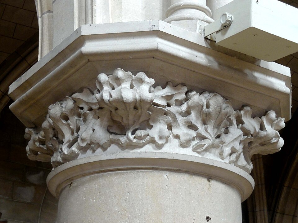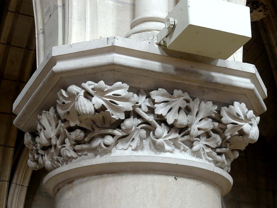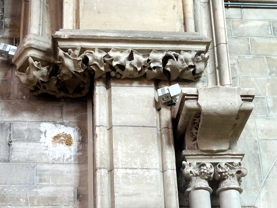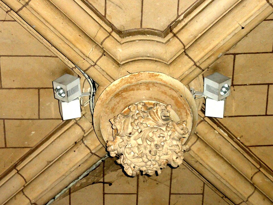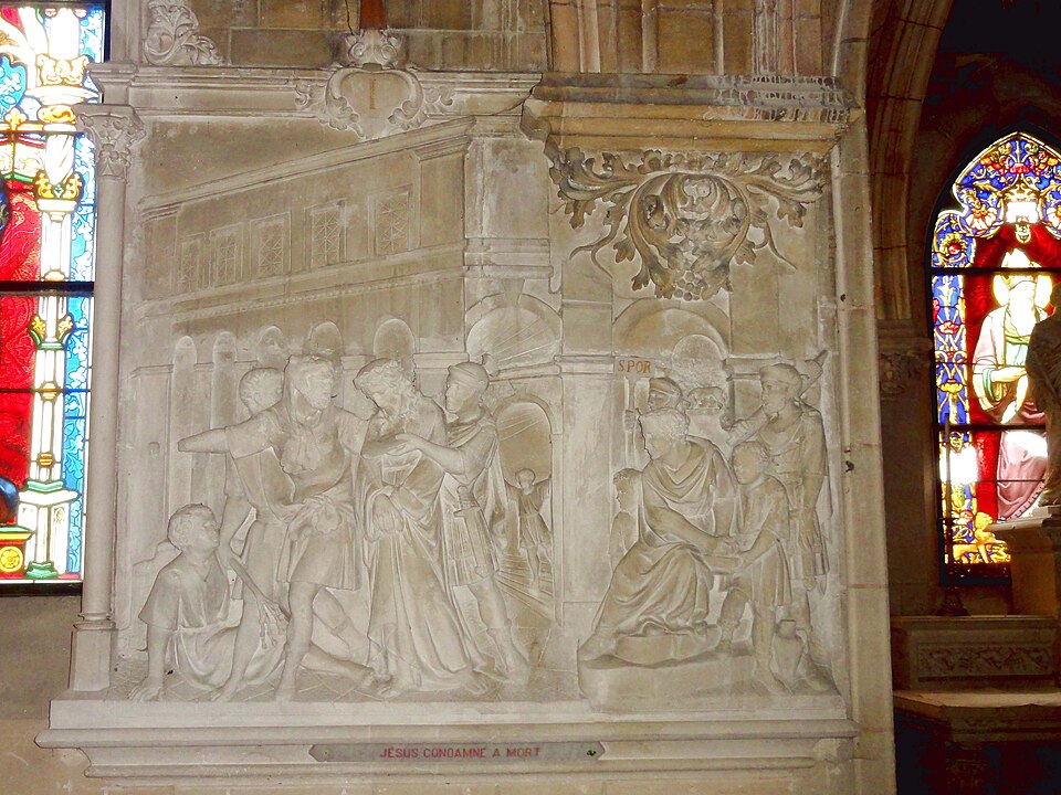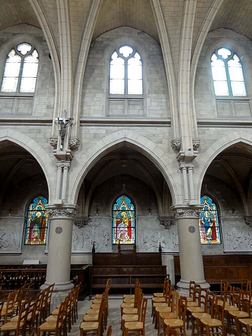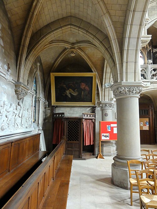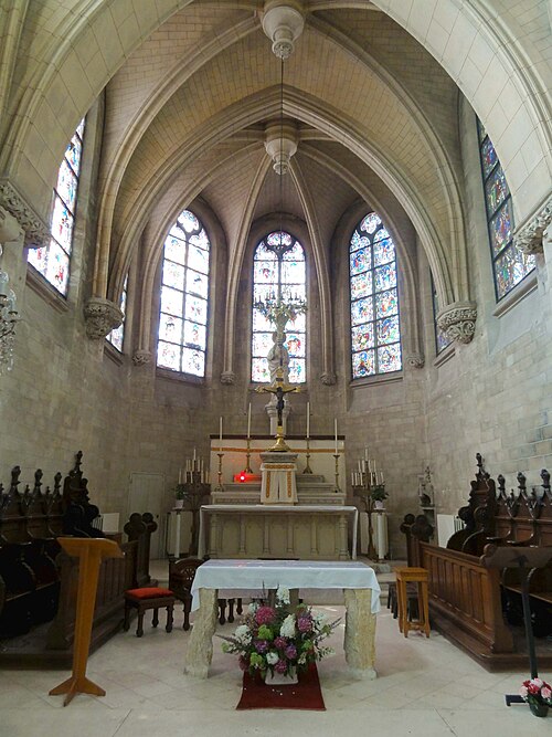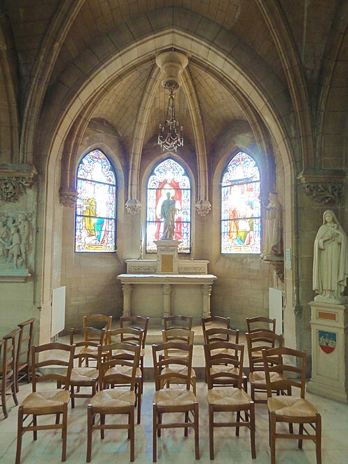 Au cœur du village de Vigny, l'église Saint‑Médard jouxte le domaine du château et forme avec lui un ensemble historique indissociable. Le domaine a été acquis par le comte Philippe Vitali en 1867 ; homme d'affaires vénitien d'origine grecque ayant fait fortune dans les chemins de fer, il lança une vaste opération de modernisation du village. Après une importante campagne de travaux sur le château (Cazaux, architecte, 1888), il organisa un concours pour la reconstruction de l'église, qui désigna Georges Tubeuf comme architecte. Né en 1850 et admis aux Beaux‑Arts de Paris en 1869, Tubeuf, surtout connu comme théoricien, n'est guère identifié pour d'autres réalisations, si ce n'est sa participation au chantier du château. L'église et plusieurs bâtiments et travaux d'utilité publique de la commune furent quasi intégralement financés par le comte Vitali, ce qui explique l'unité stylistique et l'homogénéité du centre bourg. Construite à partir d'octobre 1894 et achevée en 1896, la nouvelle église remplace une bâtisse médiévale démolie en raison de sa vétusté. La reconstruction entraîna aussi la démolition de l'ancien presbytère au profit d'une place mettant en valeur la façade principale ; cette mise en scène urbaine semble avoir été voulue par le comte pour créer un écrin au château et à l'église. Le chevet de l'édifice est adossé, au sud‑ouest, à l'orangerie du château (XVIIe siècle) ; un petit escalier ménagé contre le chœur, dans le prolongement du bas‑côté nord, permettait au châtelain d'accéder directement à l'église depuis l'orangerie. Suivant les préconisations du conseil des bâtiments civils pour les églises paroissiales, Saint‑Médard présente un plan en croix latine à trois vaisseaux, un chevet polygonal et un transept légèrement saillant. Le clocher‑porche renvoie au type courant de l'église rurale, tandis que le couvrement en briques de ciment de la nef et des bas‑côtés témoigne d'une recherche d'économie. Si, à première vue, l'édifice rappelle les réalisations du XIXe siècle influencées par le rationalisme du conseil des bâtiments civils, son gabarit, sa flèche élancée et sa richesse ornementale lui confèrent un caractère remarquable. Les vitraux, luminaires et sculptures forment un ensemble homogène, assez luxueux et rare en grande couronne, dont les auteurs sont identifiés. Le répertoire décoratif s'inspire volontiers des modèles médiévaux, principalement du gothique du XIIIe siècle, et le programme iconographique porte la marque personnelle de Vitali, soulignant la parenté évidente entre l'église et le château ; l'empreinte des pouvoirs publics y reste modérée du fait du contexte social et financier spécifique.