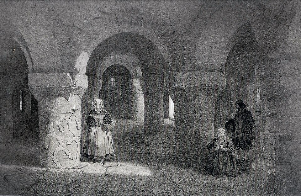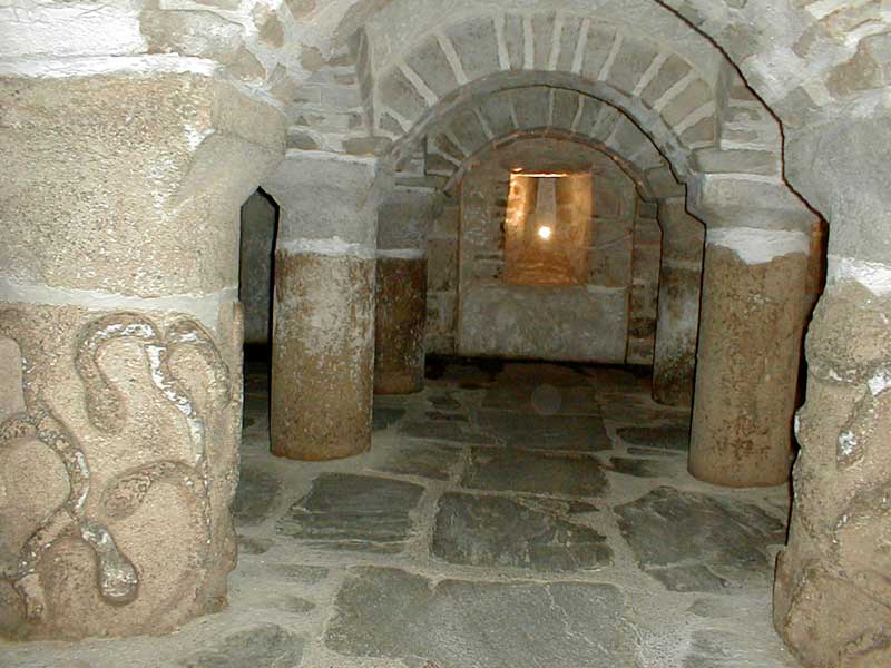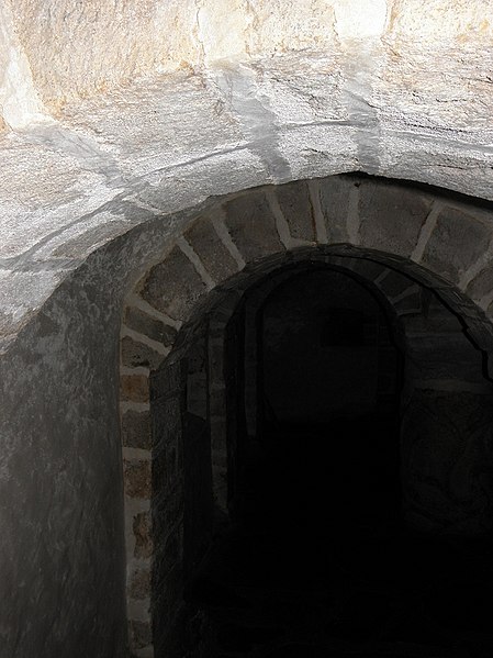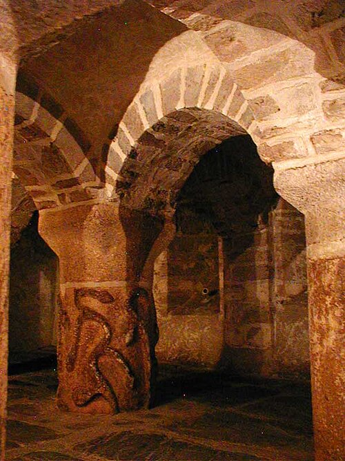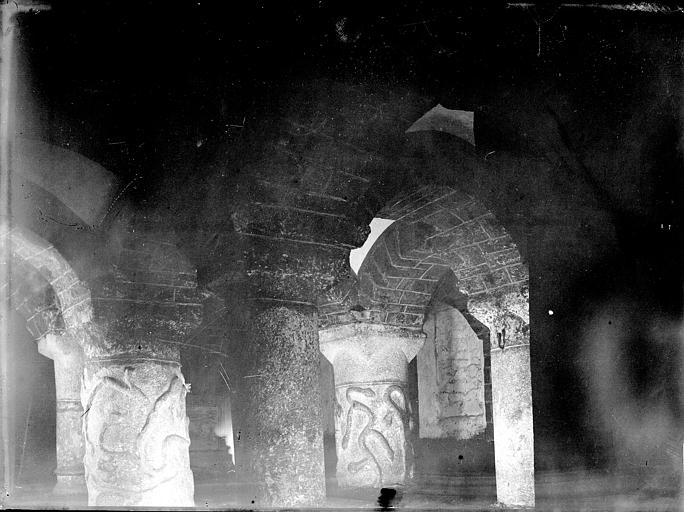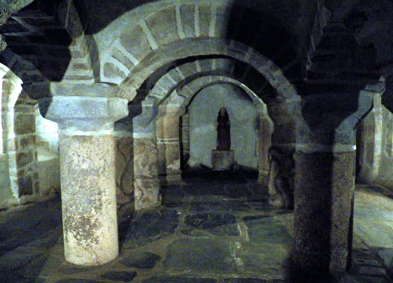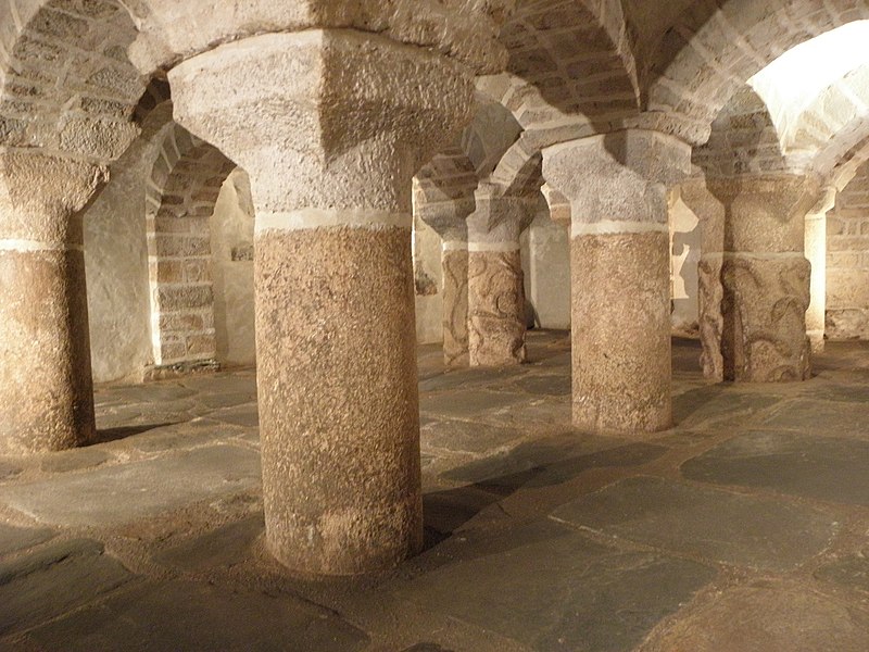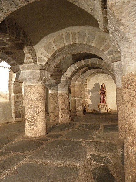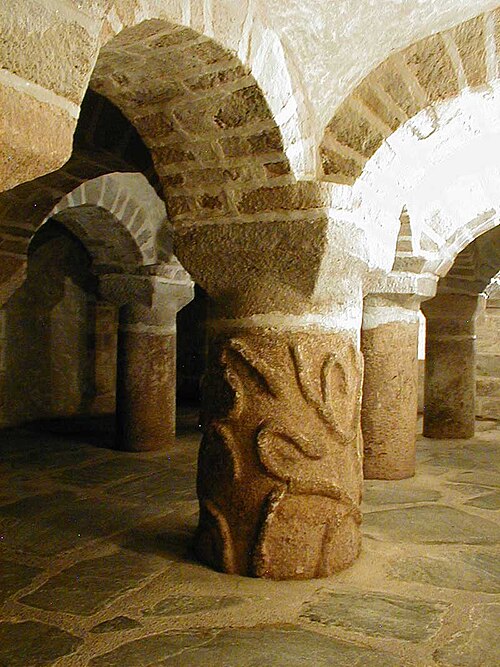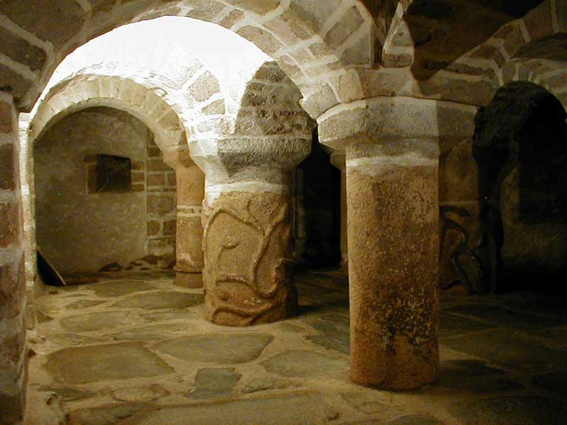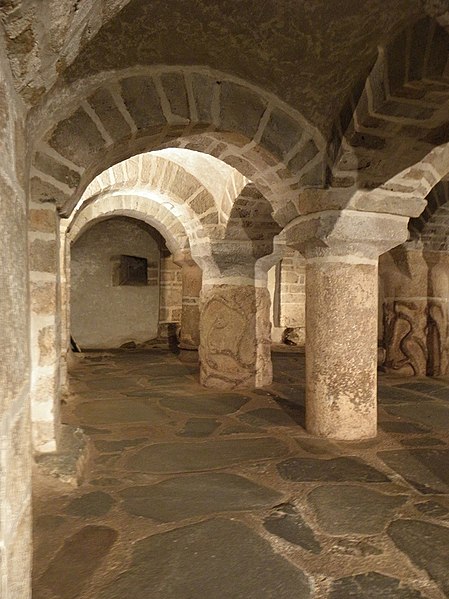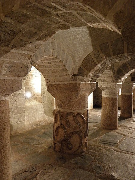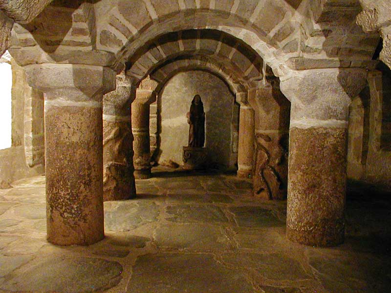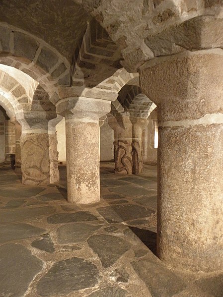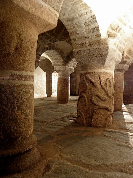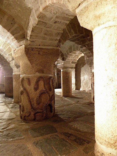 L'église Saint-Mélar, située à Lanmeur dans le Finistère, est dédiée au saint du même nom. La crypte, attribuée aux Xe–XIe siècles et comportant des éléments de remploi probables du VIe siècle, constitue l'élément le plus ancien du site. La tradition signale au centre de la crypte une fontaine considérée comme miraculeuse et vraisemblablement antérieure à l'édifice. Des actes attestent la présence à Lanmeur d'une cour comtale au dernier quart du Xe siècle ; certains auteurs envisagent qu'un mécénat local ait pu favoriser la construction primitive, sans que cela soit établi de façon certaine. L'église romane, remaniée à plusieurs reprises, a été détruite en 1902 et remplacée en 1904 par un édifice néo-roman en croix latine dessiné par l'architecte Ernest Le Guerrannic, qui a réemployé la crypte et le portail méridional médiéval. Le clocher date du XVIIIe siècle et le portail méridional, daté des XIIe–XIIIe siècles, conserve une porte pentagonale inscrite dans un arc en plein cintre retombant sur des impostes et des chapiteaux sculptés ; une photographie ancienne le montre encore dans son emplacement originel, légèrement décentré sous un porche. La crypte est un rectangle de 8,78 mètres sur 5,07, divisé en trois vaisseaux par deux rangées de quatre colonnes monolithes reliées par des arcs surbaissés à simple rouleau ; elle est couverte de voûtes sommaires, entre coupoles et voûtes d'arêtes, dont la hauteur atteint 1,97 mètre depuis le sol. Une réfection des voûtes a été réalisée, probablement lors d'une modification du chœur vers le milieu du XVIe siècle ; le pavage date du XVIIe siècle. À l'origine, la crypte comportait deux accès nord et sud, le second ayant été obstrué peu après 1790, comme l'atteste une monnaie trouvée sous les pierres de rebouchage. Près de la porte nord, un bassin en demi-cercle créé au XVIIe siècle permettait de résoudre des problèmes hydrauliques : construite sur une zone très humide, la crypte était régulièrement inondée au printemps, parfois jusqu'à trente centimètres, situation qui a perduré jusqu'à l'installation du tout-à-l'égout en 1967. Des fouilles ont mis en évidence un réseau de drainage contemporain de l'édification, partiellement implanté sous les piliers. La fontaine de la crypte, source des infiltrations, a suscité une vénération populaire sous le nom de fontaine Saint-Mélar. La notoriété de la crypte tient aussi à deux colonnes situées entre la deuxième et la troisième travée, richement décorées : des motifs végétaux en ronde-bosse s'enroulent autour du tronc et se terminent par des têtes ovoïdes, interprétés diversement comme algues, hydres, serpents ou plants de vigne. Cette dernière hypothèse renvoie au symbolisme classique du sang du martyr, la crypte ayant été destinée à recevoir les reliques de saint Mélar, aujourd'hui largement dispersées et dont un fragment seulement était vénéré à Lanmeur. Autre vestige du culte, huit petites ouvertures ou "fenestrellae" permettaient aux pèlerins de voir les reliques depuis l'extérieur ; elles ont été bouchées mais restent visibles. Les motifs des colonnes de Lanmeur présentent une stylisation comparable à certaines représentations de plantes de vigne présentes dans des enluminures du Haut Moyen Âge et sur la tapisserie de Bayeux. L'édifice est classé au titre des monuments historiques.