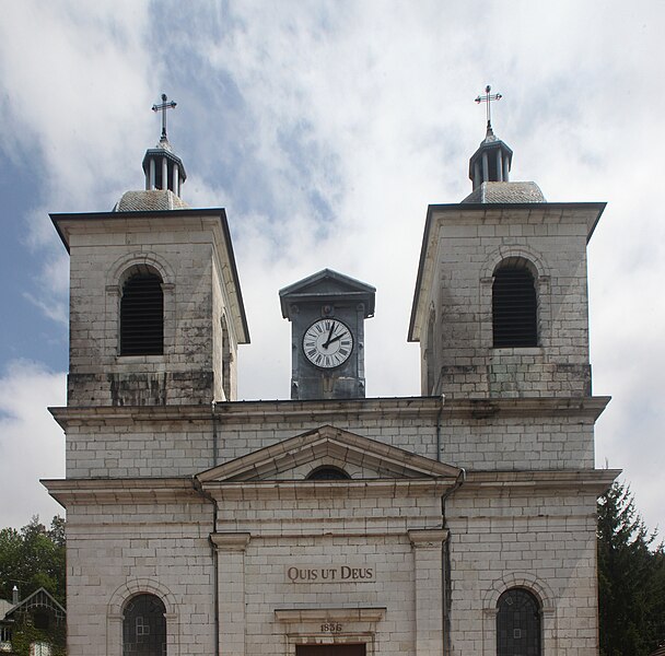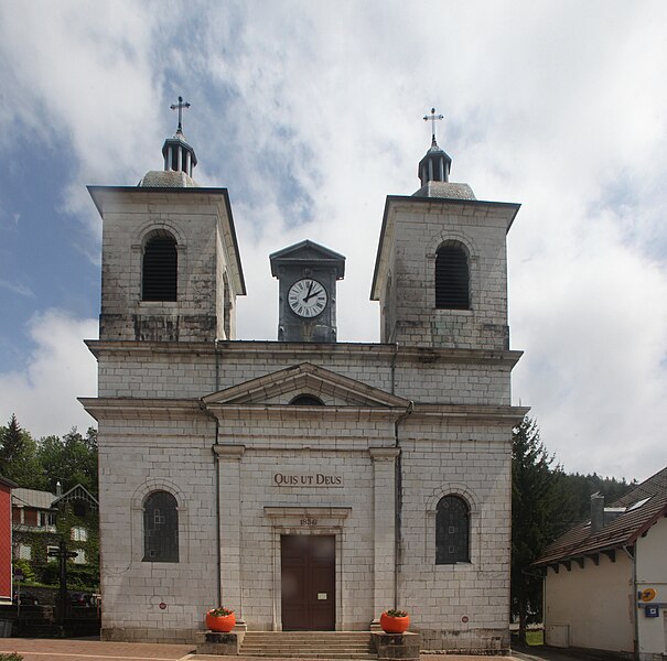 Dès 1827, le conseil de fabrique souhaitait remplacer l'ancienne église par un édifice plus vaste et plus sain ; la modification du tracé de la route royale en 1832 rendit sa démolition nécessaire et le conseil municipal décida en 1833 la construction d'un nouveau bâtiment. L'emplacement définitif fut choisi par le préfet le 21 décembre 1833 et l'architecte Joseph‑Marie Dalloz établit les métrés et devis le 3 mai 1834 ; il s'inspira pour l'extérieur de l'église de Morez et reprit pour l'intérieur le modèle néo‑classique de Saint‑Philippe du Roule. Le projet de 1834 fut modifié en 1838 par le remplacement du fronton des clochers par des dômes, et la réception définitive des travaux eut lieu en 1839. L'église présente une façade percée de deux clochers coiffés de dômes à lanternon qui forment, de part et d'autre, de petits porches encadrant le vestibule central sous la tribune. Le plan est basilical ; derrière la colonnade de l'abside se développe un déambulatoire à étage. Le vaisseau central et l'abside sont entourés de supports doriques et couronnés d'un fort entablement ; ils sont couverts d'une fausse voûte à caissons ornée de motifs peints. Les éléments du second œuvre — stalles, boiseries, chaire à prêcher, retables et autels — ont été dessinés par l'architecte Claude‑François Besand et exécutés par son père François‑Ignace, sculpteur et doreur. Des travaux de réparation, notamment de la toiture des coupoles des clochers, furent entrepris en 1877 sous la direction de l'architecte Auguste Comoy, la réception définitive ayant eu lieu le 11 novembre 1881.