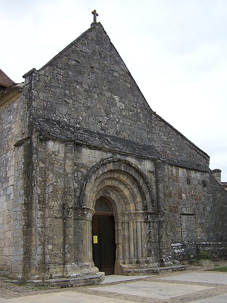 Le château de Michel de Montaigne se dressait non loin de l'église ; à sa mort en 1592, sa veuve Françoise de La Chassagne fit déposer son cœur dans la chapelle de l'édifice et transférer son corps à Bordeaux, dans l'église des Feuillants. L'église romane se compose d'une nef suivie d'un carré de transept couvert d'une coupole et d'un chœur en hémicycle voûté en cul-de-four. La nef a été revoûtée au XVIIe siècle et le mur sud a été percé de deux arcs au XVIe siècle. La coupole du carré du transept, qui remonte à la première moitié du XIIe siècle, adopte une solution intermédiaire entre l'octogone et le cercle. Près de l'angle du bas-côté, un baptistère a été élevé au XVIIIe siècle : il se présente comme une niche à coquille encadrée de deux pilastres cannelés soutenant un fronton coupé à volutes. La façade occidentale s'ouvre par un portail du XIIe siècle marqué par une influence saintongeaise ; il comporte quatre voussures en plein cintre, ornées d'un boudin et d'enroulements de feuillage entre la première et la seconde et encadrant la quatrième. Ces voussures retombent sur huit colonnettes aux chapiteaux rustiques et aux astragales toriques ; leurs tailloirs portent une frise de dents de scie opposées qui se prolonge jusqu'aux colonnes contreforts. Les bases des colonnettes sont moulurées d'un cavet entre deux tores, posées sur un socle sculpté d'une frise d'étoiles. Les murs conservés du XIIe siècle sont exécutés en appareil régulier assisé, tandis que les maçonneries postérieures ont été remontées en moellons irréguliers.