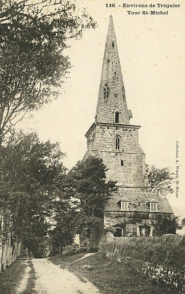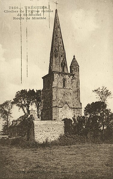 L'ancienne église Saint-Michel est située à Tréguier, dans les Côtes-d'Armor, en Bretagne. La chapelle primitive fut édifiée en 1474 par Christophe du Chastel, évêque de Tréguier de 1466 à 1479, sur son fief s'étendant à l'origine sur la paroisse du Minihy-Tréguier. La chapelle fut détruite par les Anglais au XVIe siècle ; il n'en subsiste que le clocher. Il s'agit d'une tour carrée, flanquée d'un escalier, surmontée d'une flèche octogonale en granite ; le passage du carré à l'octogone est assuré par quatre encorbellements simples formés par la superposition d'assises dont la face présente un triangle. Un cimetière avait été aménagé à proximité et l'on conserve également un socle de croix vraisemblablement datable du XVe siècle, portant une inscription en lettres gothiques ; il pourrait s'agir de l'ancienne croix de cimetière. Par ordonnance du 15 février 1836, une partie du territoire de Minihy-Tréguier, comprenant les maisons des Buttes, le faubourg de Kerfant et la chapelle Saint-Michel, fut rattachée à la commune de Tréguier. Jugée en mauvais état, la nef de la chapelle fut arasée en 1841. Une construction incorporant des éléments architecturaux anciens a été accolée à la tour après 1834. Le clocher, propriété de la commune (cadastre AH 179), a été classé au titre des monuments historiques par arrêté du 25 juin 1930. Le nom de la tour a donné celui du chemin de Saint-Michel au cadastre de 1834, devenu par la suite « allée Saint-Michel ». Des sources et inventaires spécialisés, notamment Clochers de France et la base Mérimée, documentent ce monument et ses caractéristiques.