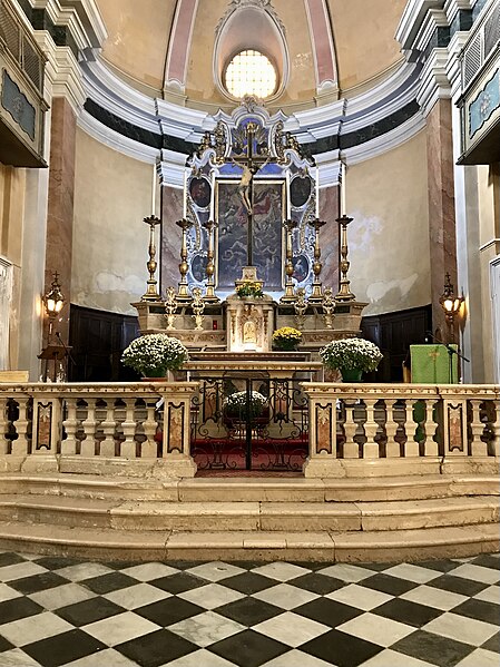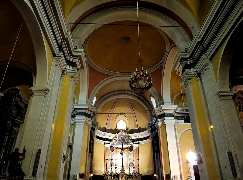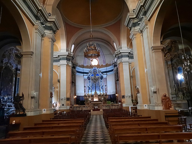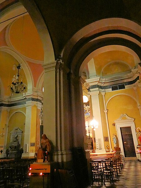L'édifice adopte un plan en croix latine ; la nef, composée de deux travées, est éclairée par des oculus placés au-dessus des collatéraux qui bordent la nef. Ces collatéraux aboutissent à un transept peu saillant donnant sur la travée du chœur, laquelle se termine par une abside en hémicycle. La nef est rythmée par des pilastres jumelés, détachés des piles, qui reprennent l'ordre toscan employé au premier niveau de la façade ; sur chacun de ces pilastres s'appuient les nervures jumelles de la voûte et les arcades ouvrant sur les collatéraux.
