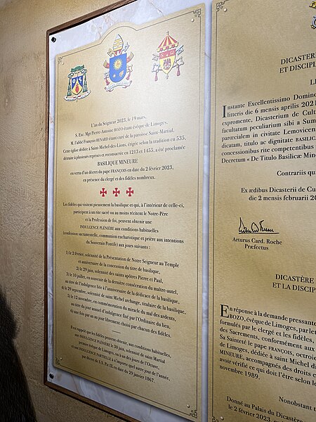 Vers 630, saint Loup, évêque de Limoges, donna une chapelle dédiée à saint Michel aux chanoines de Saint-Martial. L'édifice fut détruit par deux incendies en 1123 et 1147, puis reconstruit par le moine Pierre de Verteuil et consacré en 1213. Cette nouvelle église s'effondra ensuite et la première pierre d'une reconstruction fut posée en 1364 ; de cet ensemble subsistent deux chapelles et une partie des murs. Des travaux d'agrandissement eurent lieu en 1552 avec l'ajout à l'ouest d'une travée remarquable par ses grandes verrières, et des interventions furent menées sur le clocher aux XVIIe, XVIIIe et XIXe siècles (1604, 1754, 1810).