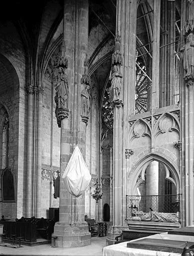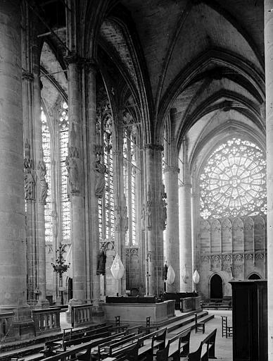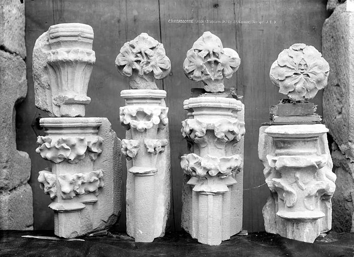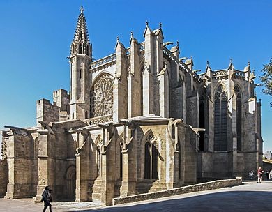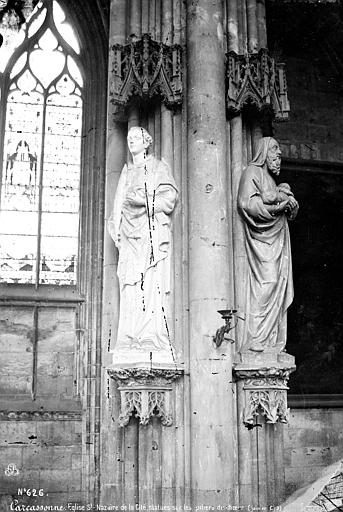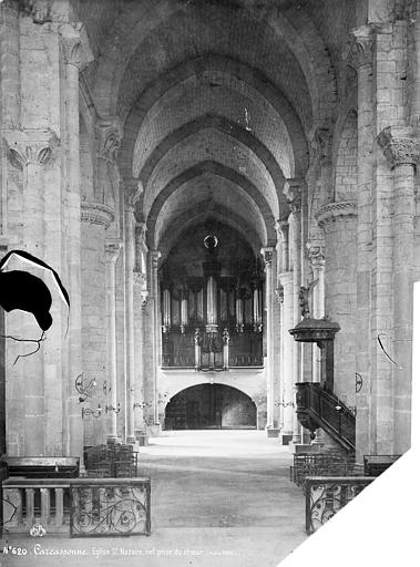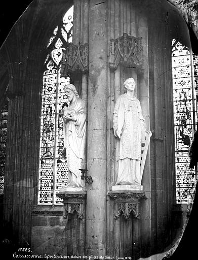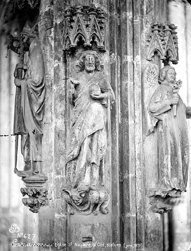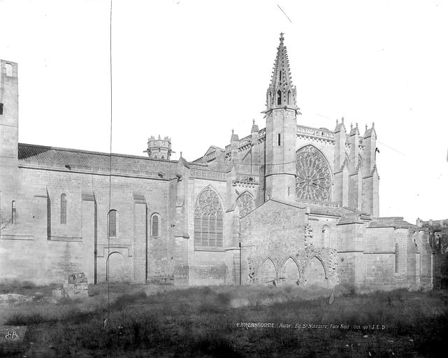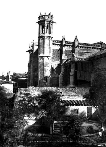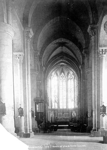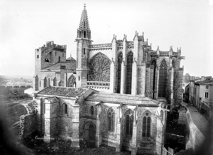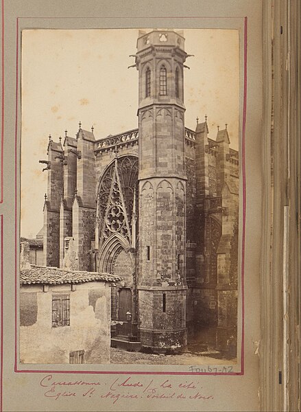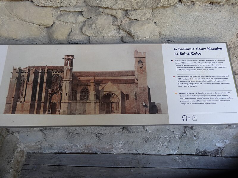 L'église Saint-Nazaire, ancienne cathédrale de la Cité de Carcassonne et basilique mineure depuis 1898, présente une superposition de styles roman et gothique. La tradition rapporte l'existence d'une première cathédrale consacrée aux saints Nazaire et Celse dès le VIe siècle, mais le premier document sûr mentionnant l'église sous l'invocation de saint Nazaire date de 925, sous l'évêque Gimer. L'édifice actuel repose sur une construction engagée du XIe au XIVe siècle ; les pierres de l'abside et du chœur furent bénies par le pape Urbain II en 1096, mais l'église resta inachevée à cette époque. Les parties les plus anciennes datent du XIIe siècle : la nef romane à trois vaisseaux, voûtée en berceaux, ainsi que la crypte mise au jour en 1857 et quelques piliers orientaux de la nef qui subsistent de la première campagne. Les transepts furent sans doute achevés au début du XIIIe siècle, puis le chevet roman fut détruit et remplacé par un ensemble gothique entre 1269 et 1330. À partir de 1269, des autorisations royales et des mesures financières prises par les évêques et le chapitre permirent d'agrandir le chœur et le transept ; l'œuvre reçut aussi des dons pontificaux et des indulgences pour soutenir la construction. L'évêque Pierre de Roquefort (Pierre de Rochefort) fit édifier, entre 1301 et 1321, la coquille appelée Concham ou Testudinem, le rond-point qui termine le chœur, et plusieurs chapelles furent ajoutées aux faces orientales des deux transepts, séparées par des piliers isolés. Deux grandes roses ornent les extrémités des bras du transept et les voûtes ainsi que le décor sculpté et les vitraux constituent un ensemble représentatif du gothique rayonnant. Des statues d'apôtres adossées aux piles du chœur et de l'abside s'inspirent des modèles de la Sainte-Chapelle de Paris, et des peintures polychromes du chœur et de l'abside ont été retrouvées et publiées par Eugène Viollet-le-Duc. Les travaux de restauration menés par Viollet-le-Duc au XIXe siècle ont profondément modifié l'extérieur et refait le portail roman, tandis que l'intérieur conserve l'emboîtement des éléments romans et gothiques, notamment des vitraux des XIIIe et XIVe siècles. L'ensemble des verrières du sanctuaire et du transept comprend une verrière d'axe consacrée à l'Enfance et à la Passion du Christ, attribuée aux années 1280 et entourée de verrières de style Renaissance, ainsi que des verrières datées des environs de 1300-1310 consacrées aux vies de saint Pierre et saint Paul et à celles des patrons Nazaire et Celse. Les vitraux des deux premières chapelles de chaque bras développent des thèmes arborés : à gauche, un arbre de Jessé du XIVe siècle entouré de prophètes ; à droite, un Arbre de Vie attribué aux années 1310-1320, qui fut au XIXe siècle remplacé de façon erronée par une scène de la tentation d'Adam et Ève lors de la restauration d'Alfred Gérente. L'orgue, dont différentes parties datent des XVIIe et XVIIIe siècles, connaît une longue histoire de commandes et de restaurations : un orgue fut offert en 1637 par Vitalis de Lestang et construit par Crespin Verniole, un instrument fut commandé en 1679 à Jean de Joyeuse, agrandi entre 1772 et 1775 par Jean‑Pierre Cavaillé, restauré entre 1900 et 1904 par Michel Roger, classé au titre des objets monuments historiques en 1970, puis restauré de 1982 à 1985 par Bartolomeo Formentelli et réinauguré en 1985 par Michel Chapuis ; le pédalier est à la française et les transmissions sont mécaniques. Jusqu'à la Révolution, la cathédrale resta le principal centre religieux de Carcassonne et un chapitre de chanoines vivait à proximité avant que les bâtiments capitulaires ne soient démolis en 1792 ; l'édifice conserva toutefois une fonction paroissiale et perdit officiellement le statut de cathédrale au profit de Saint‑Michel au début du XIXe siècle. Des campagnes de restauration récentes ont porté sur la mise aux normes des installations électriques en 2018 et sur la toiture du chœur et du transept engagée à partir de juillet 2020. Classée au titre des monuments historiques dès 1840, la basilique conserve de nombreux objets référencés dans la base Palissy et abrite plusieurs monuments funéraires d'évêques inhumés en son sein, parmi lesquels Guillaume Radulphe, Pierre de Rochefort, Pierre Rodier, Christophe et Vitalis de Lestang, et Louis‑Joseph Adhémar de Monteil de Grignan.
