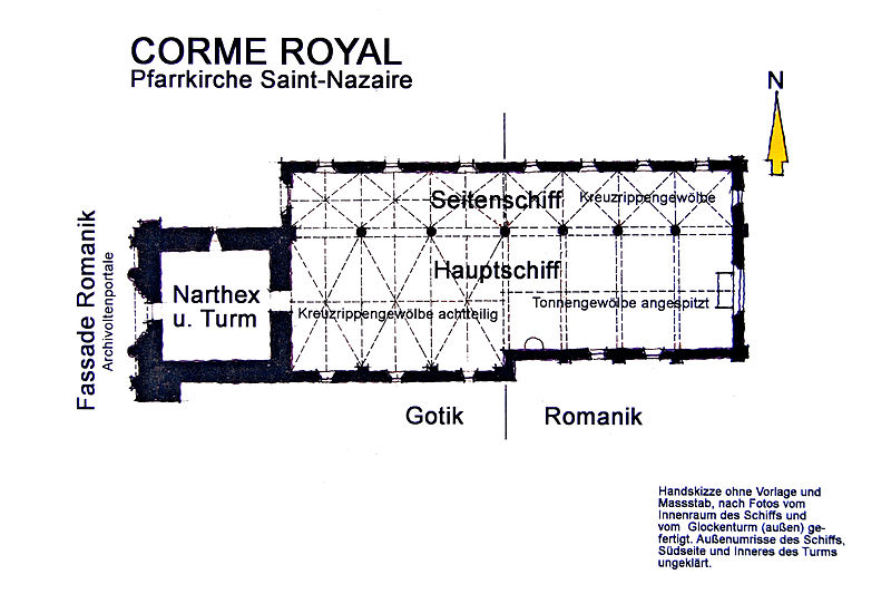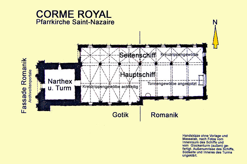L'église Saint-Nazaire, classée monument historique, se situe à l'entrée sud-est du bourg de Corme-Royal, en Charente-Maritime. Une église antérieure, dédiée à saint Pierre puis à saint Nazaire, est mentionnée par une charte de 1040 et fut donnée à l'abbaye de la Trinité de Vendôme, puis cédée sept ans plus tard à l'abbaye aux Dames de Saintes. L'édifice actuel, fondé dans la seconde moitié du XIIe siècle, paraît avoir été construit en deux temps : d'abord le transept et le chœur, dont subsistent des vestiges, puis la voûte en berceau brisé de la nef et la façade occidentale. Le chevet primitif, en hémicycle, fut remplacé dès le XIIIe siècle par un mur plat gothique percé d'une grande fenêtre ogivale. L'entrée s'ouvre sur un narthex très élevé, percé d'une porte haute desservant la nef par cinq marches, éclairé par deux fenêtres en plein cintre et couvert d'une voûte ogivale étoilée dont les nervures convergent vers un trou à cloches. La nef compte six travées, les trois premières voûtées en ogive avec clés sculptées, les trois autres, plus basses, en berceau brisé. Après la guerre de Cent Ans, une partie de l'édifice fut reprise : le mur sud fut remplacé par cinq grosses colonnes lisses supportant les arcs ogivaux et six grandes baies ouvrant sur un bas-côté nord voûté en ogive. Les travaux se poursuivirent au XVIIe siècle, notamment pour l'achèvement des voûtes et du clocher coiffé d'un toit en carène. Malgré les remaniements, l'église conserve d'importants éléments romans, notamment le mur sud de la nef percé de baies en plein cintre, encadrées de colonnettes à chapiteaux sculptés, ainsi que des corniches sculptées et un chapiteau représentant un énorme dragon en combat. La façade occidentale, de composition romane régionale, présente trois arcades sur chacun des deux niveaux et un décor sculpté riche mêlant ornements géométriques et végétaux, animaux fantastiques et personnages bibliques couvrant arcatures, voussures, colonnes, chapiteaux et corniches. L'édifice a été classé monument historique le 21 janvier 1907.