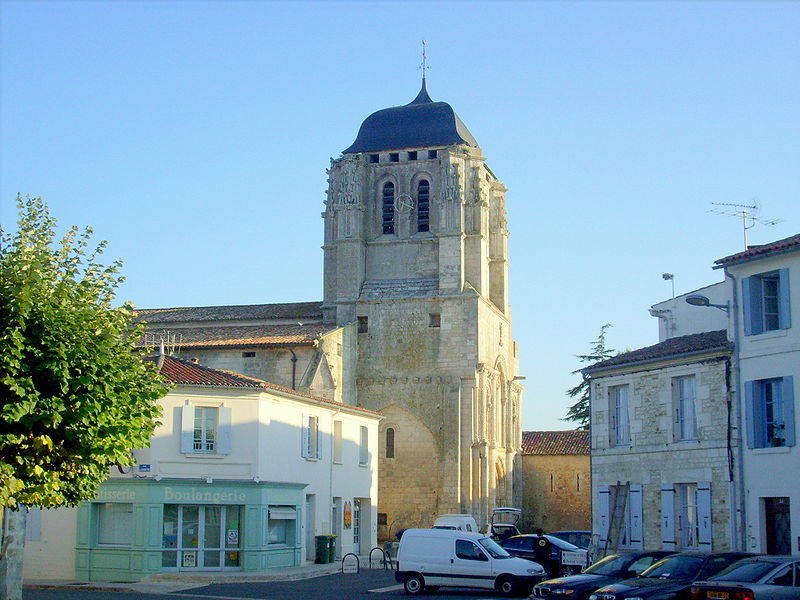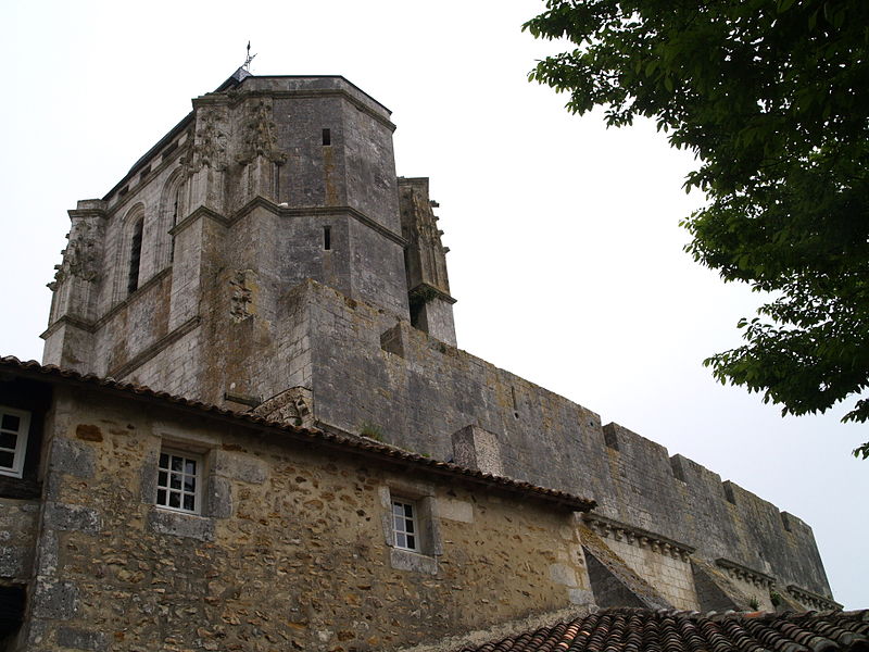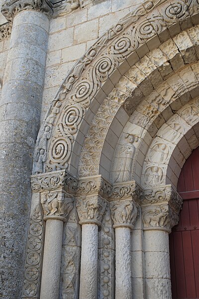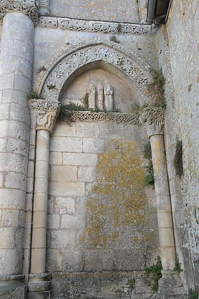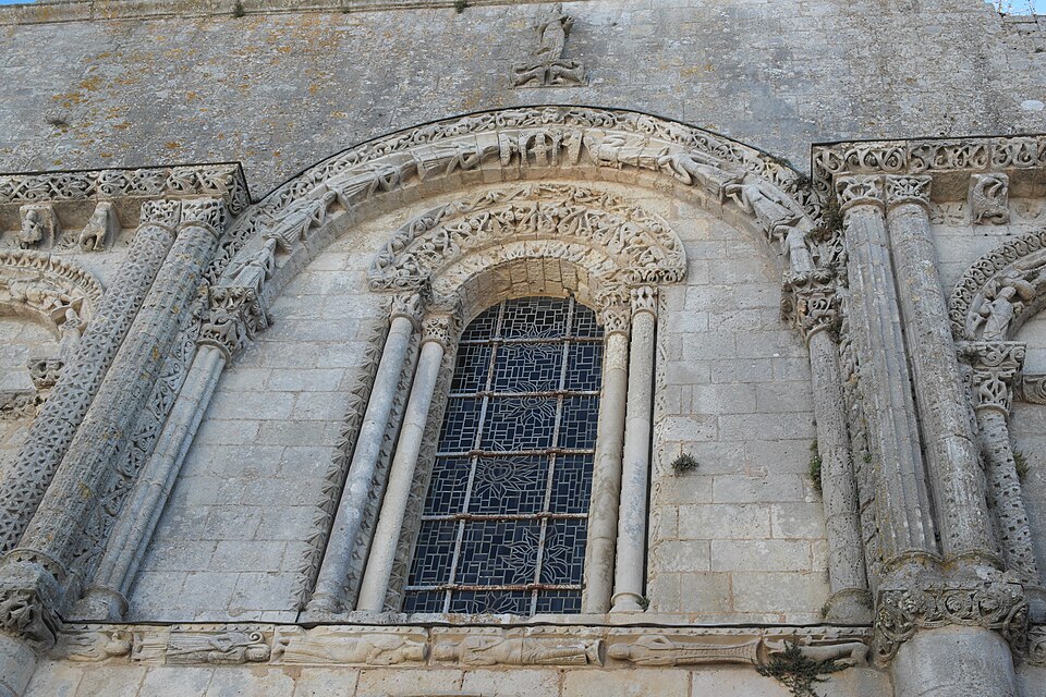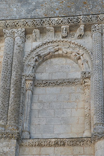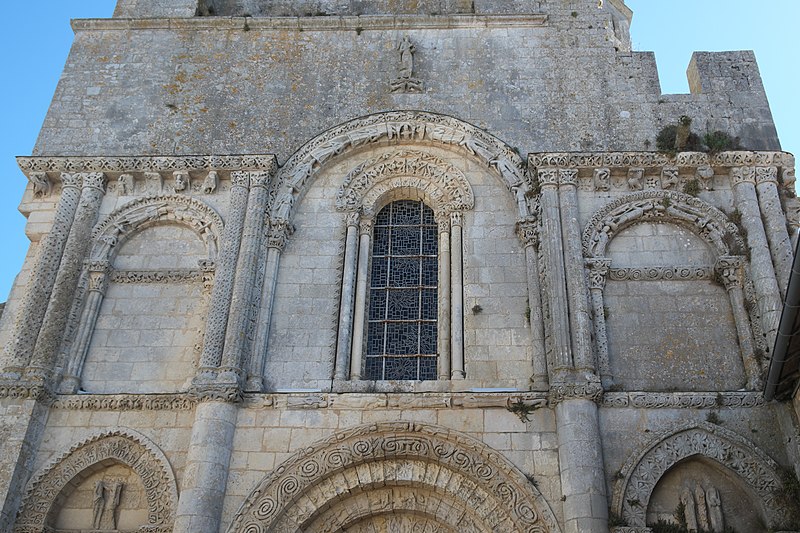 Au premier étage, la large baie centrale à tympan sculpté, flanquée de deux baies aveugles, est encadrée par des colonnes finement travaillées ; la voussure de la baie centrale illustre l'allégorie des Vierges sages et des Vierges folles, scène évangélique qui a inspiré un ancien drame liturgique, tandis que la baie aveugle nord présente quatre saints dont une abbesse, saint Nazaire et son compagnon saint Celse, et sainte Catherine d'Alexandrie, et la baie aveugle sud montre le combat des Vertus et des Vices, thème fréquent sur les façades de Saintonge. La corniche supérieure repose sur des modillons très ouvragés et l'ensemble du pignon, aménagé à la fin du XVe siècle pour servir d'assise au clocher, porte une statue remployée figurant probablement un ange, sur un piédestal flanqué de deux lions adossés. Le clocher, ajouté au XVe siècle, n'a sans doute jamais été élevé davantage et est aujourd'hui coiffé d'une toiture Louis XIII en ardoise.