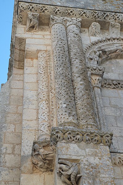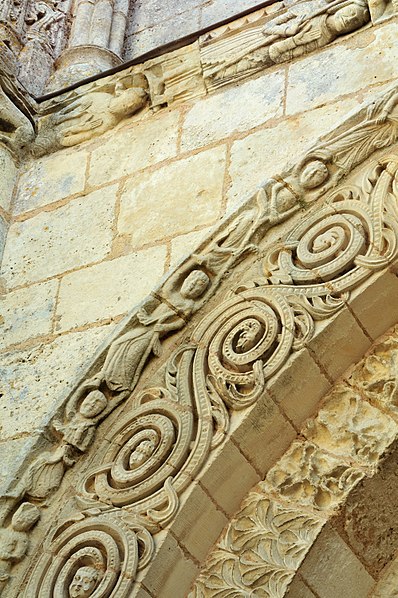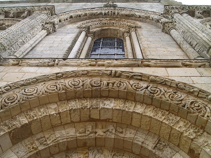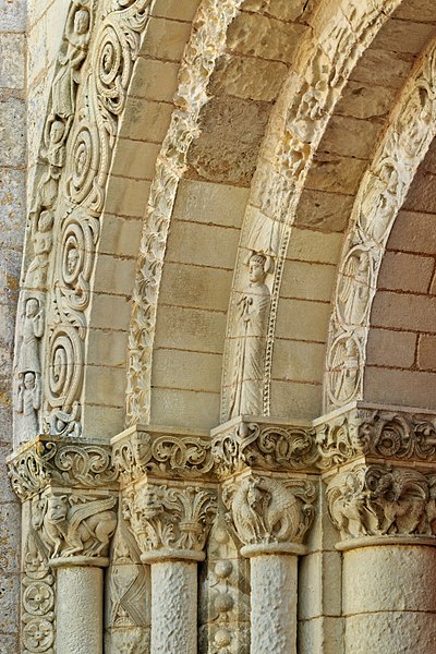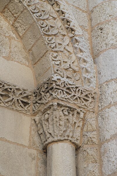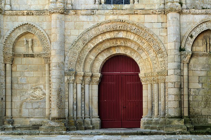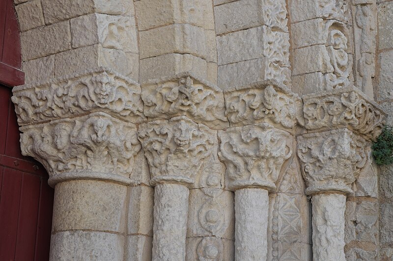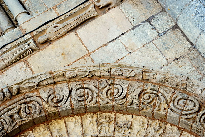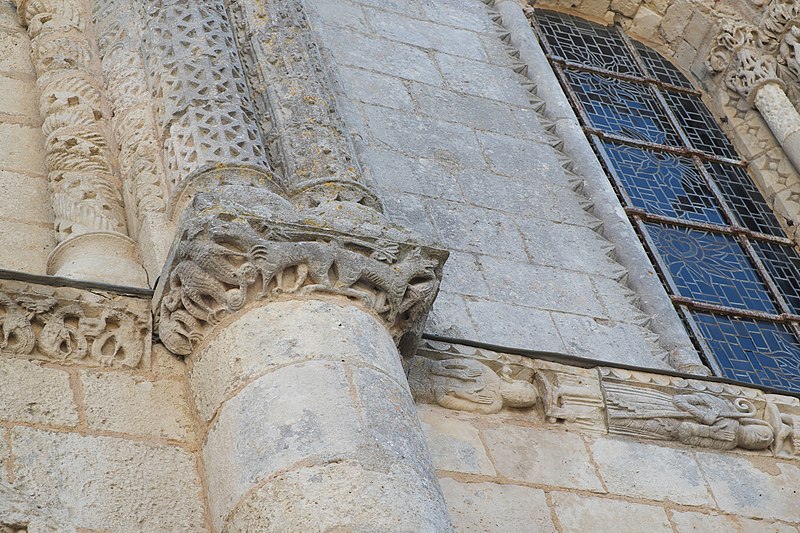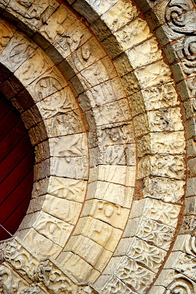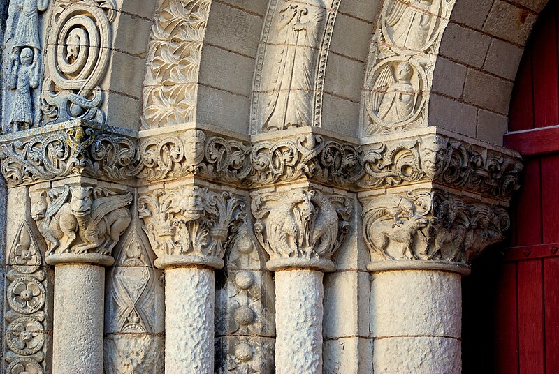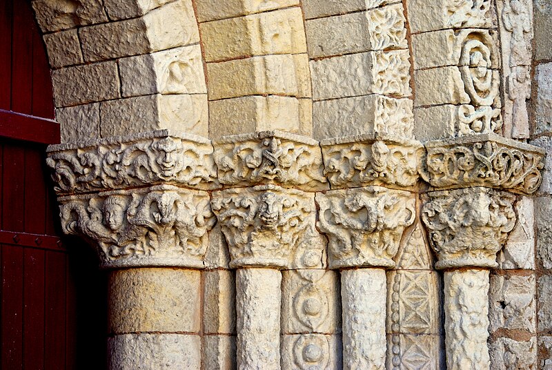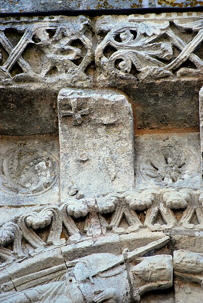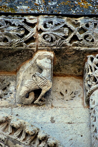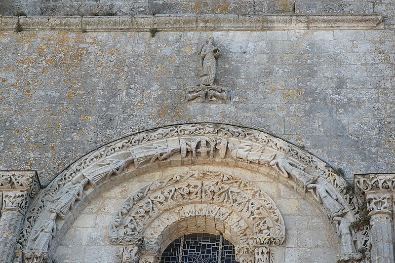 Au rez-de-chaussée, le portail en plein cintre est encadré de deux portes factices en arc brisé ; les voussures de ces portes sont ornées de fleurs stylisées, les chapiteaux présentent des rinceaux dont l'un est endommagé, et les sculptures centrales, très altérées, sont traditionnellement interprétées comme la Visitation et la Présentation au Temple. Le portail central, longtemps muré puis dégagé en 1880, offre une profusion de motifs sculptés mais a été fortement restauré et conserve peu d'éléments d'origine. Entre les deux niveaux, la corniche de séparation est finement sculptée et comporte, sur la gauche, une Pesée des âmes avec l'archange saint Michel face à un diable, puis une série d'une douzaine de couples d'oiseaux affrontés ou de griffons, et au-dessus du portail central six figures — un homme priant, un évêque, un guerrier, un personnage portant un objet peut‑être évangélique, une sirène-poisson et un lion rampant — tandis que la corniche au-dessus de la porte sud est ornée de rinceaux.