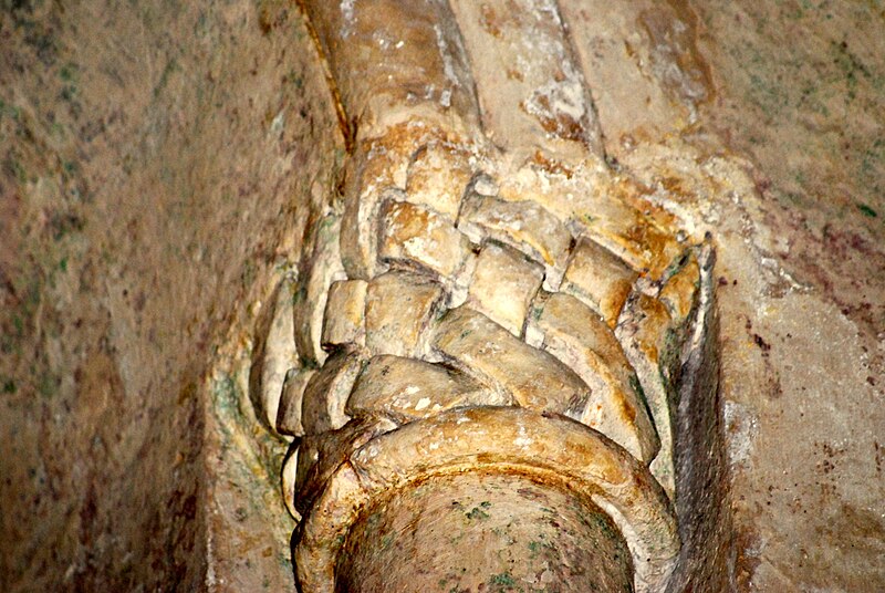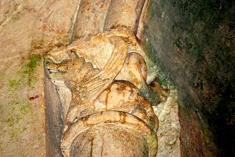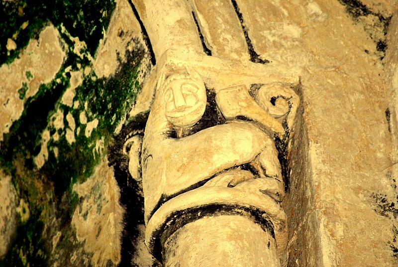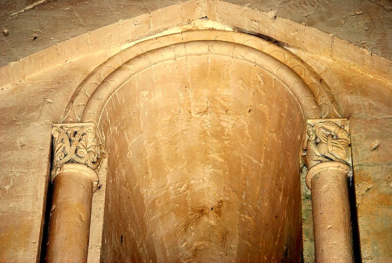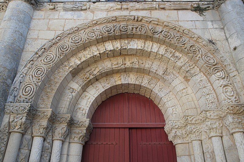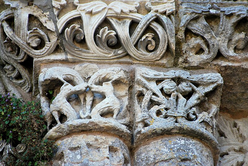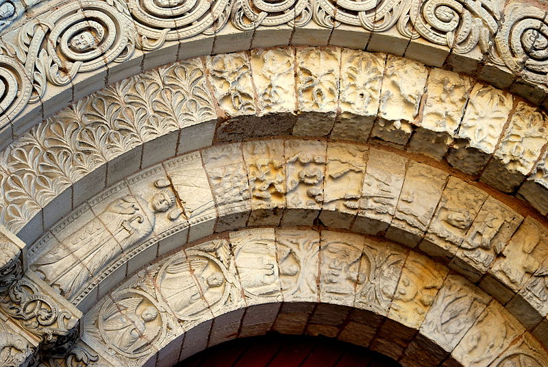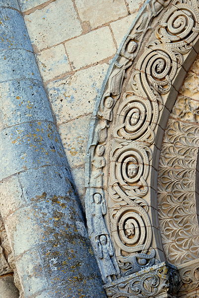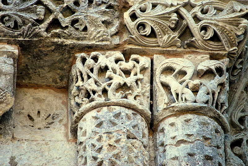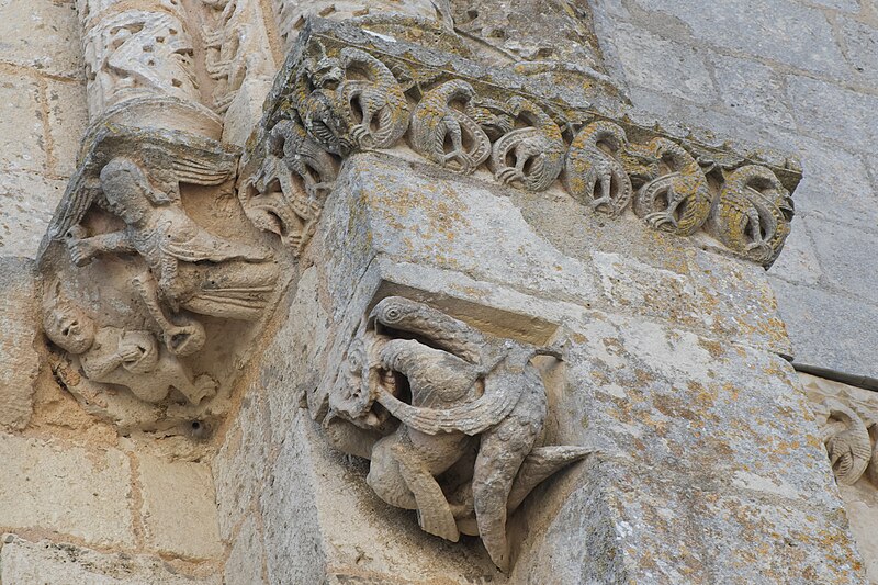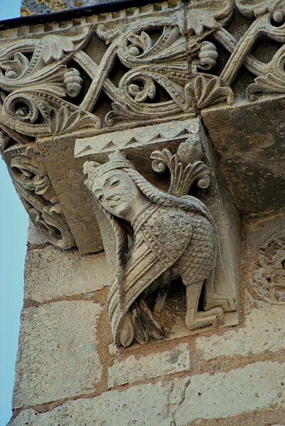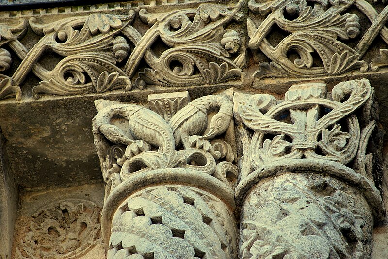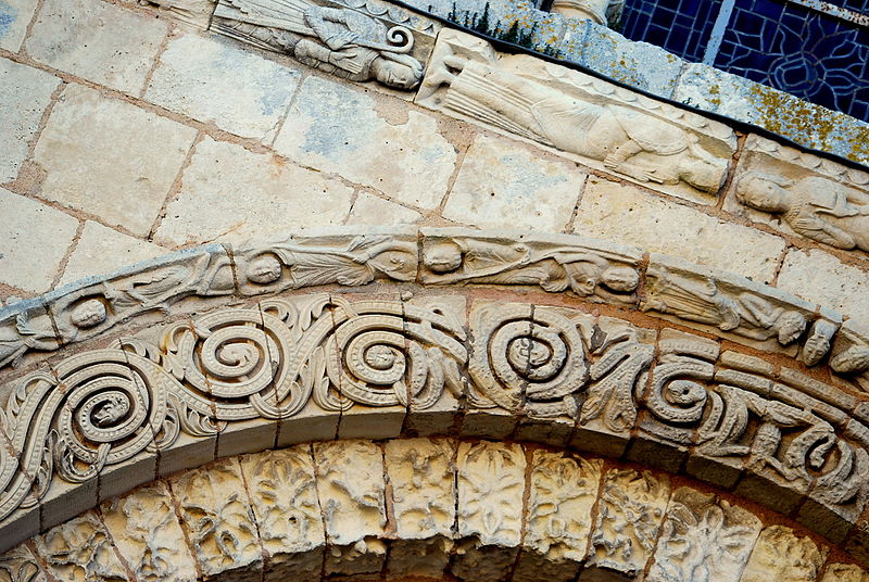 Au rez-de-chaussée, le portail en plein cintre est encadré de deux portes factices en arc brisé ; les voussures de ces portes sont ornées de fleurs stylisées, les chapiteaux présentent des rinceaux dont l'un est endommagé, et les sculptures centrales, très altérées, sont traditionnellement interprétées comme la Visitation et la Présentation au Temple. Le portail central, longtemps muré puis dégagé en 1880, offre une profusion de motifs sculptés mais a été fortement restauré et conserve peu d'éléments d'origine. Entre les deux niveaux, la corniche de séparation est finement sculptée et comporte, sur la gauche, une Pesée des âmes avec l'archange saint Michel face à un diable, puis une série d'une douzaine de couples d'oiseaux affrontés ou de griffons, et au-dessus du portail central six figures — un homme priant, un évêque, un guerrier, un personnage portant un objet peut‑être évangélique, une sirène-poisson et un lion rampant — tandis que la corniche au-dessus de la porte sud est ornée de rinceaux.