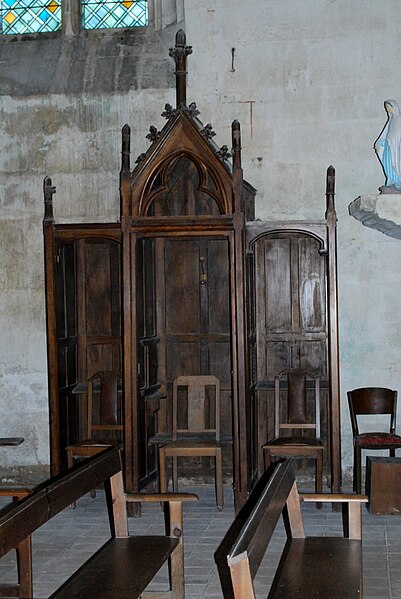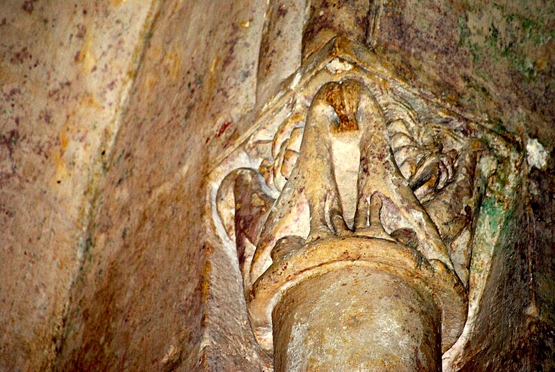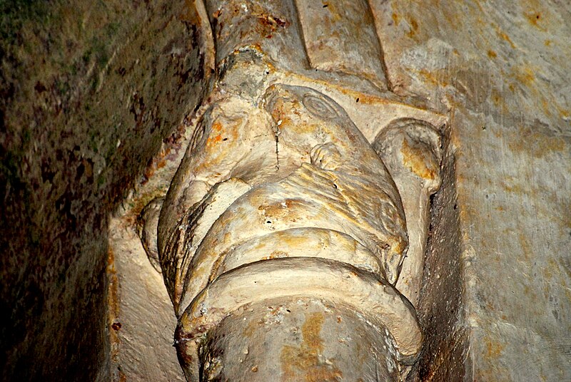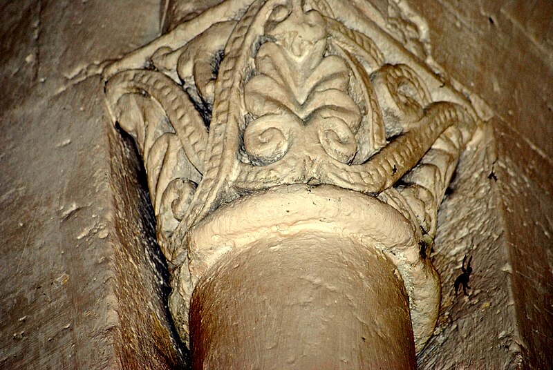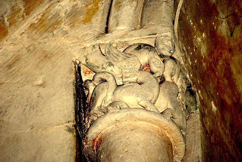 À l'intérieur, l'iconographie romane se concentre sur quelques chapiteaux et tailloirs ainsi que sur trois baies du mur sud de la nef et une quatrième, plus tardive, dans le chœur ; ces baies en plein cintre, dotées de colonnettes d'angle, percent un mur épais d'environ trois mètres. Parmi les chapiteaux, l'un du pilier principal montre un dragon ailé combattant un quadrupède, d'autres présentent un lion crachant un rinceau, des entrelacs et plusieurs créatures fantastiques affrontées, tandis que la baie du chœur porte des sculptures plus récentes dont un griffon ou dragon ailé à tête d'oiseau et un motif végétal. Le mobilier comprend un tableau de la Sainte Famille daté de 1636 et signé Lartigue, mentionnant une abbesse de Saintes, Madame de Foix, ainsi qu'un bénitier constitué d'un chapiteau renversé en marbre ou calcaire fin d'origine inconnue, un crucifix, des stalles, une chaire, un confessionnal et des vitraux refaits dans les années 1970.