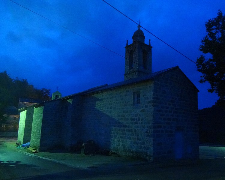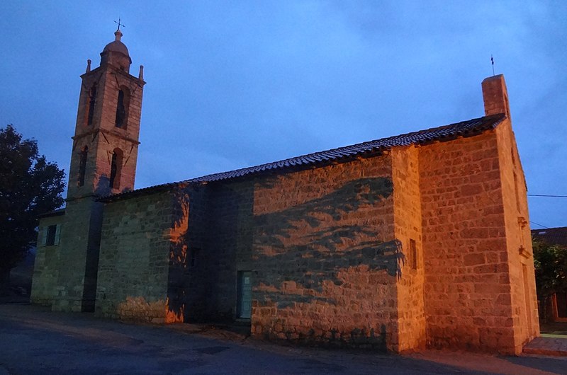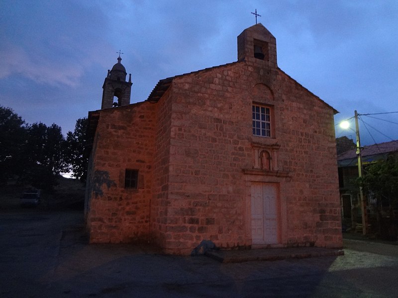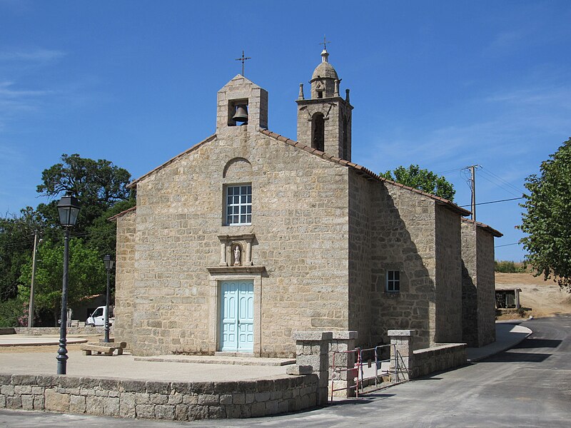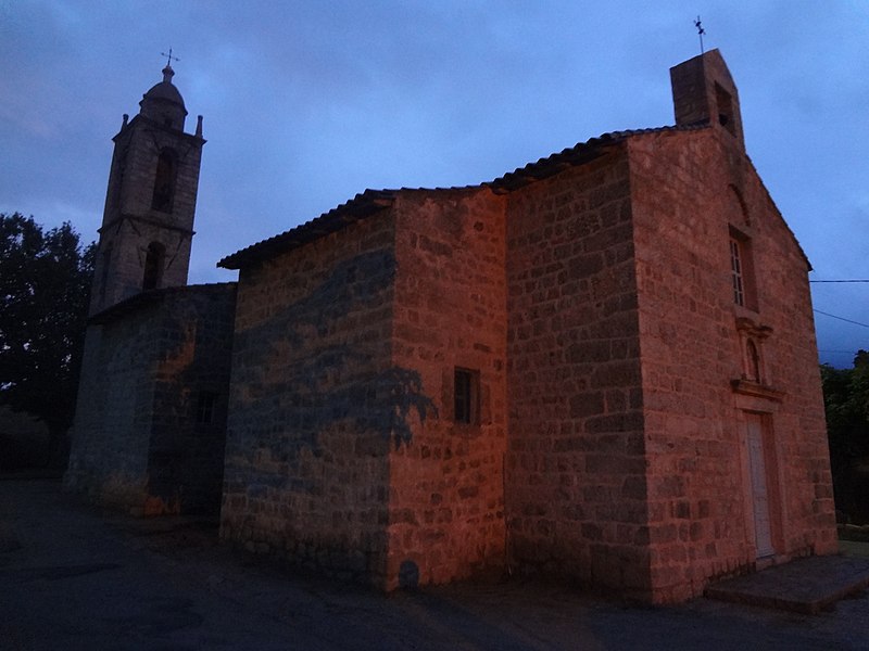 Le clocher en pierre de granit, accolé à l'église, présente un plan carré et se développe sur trois niveaux soulignés de moulurations : le premier est aveugle, les deux étages supérieurs sont percés de baies allongées surmontées d'arcs en plein cintre. L'ensemble se termine par un clocheton octogonal, surmonté d'une coupole à pans coupés ; ce clocheton comporte quatre fenestrons coiffés de petits frontons triangulaires. Ce type d'architecture, fréquent dans de nombreux villages du haut Taravo et de l'Alta Rocca, doit dater de la première moitié du XIXe siècle. L'église paroissiale Saint-Nicolas a vraisemblablement été érigée au cours de la première moitié du XVIIe siècle pour remplacer un édifice du milieu du Moyen Âge dédié à saint Antioche, que Mgr Mascardi, visiteur apostolique, signalait en mauvais état en 1587. Dans son rapport de 1686, Mgr Spinola relève la décence de l'église, qui possède, en plus du maître-autel, un autel secondaire dédié au Saint-Sacrement, et il signale que le clocher était en cours de construction. L'édifice a été remanié aux XVIIIe et au début du XIXe siècle ; les documents mentionnent notamment les interventions des maîtres maçons Antonio Lucchini et Tomaso Lanfranchi en 1837, puis de Pierre Lovichi en 1844, sous la direction de l'architecte départemental Cotin.