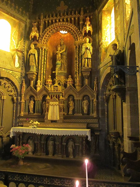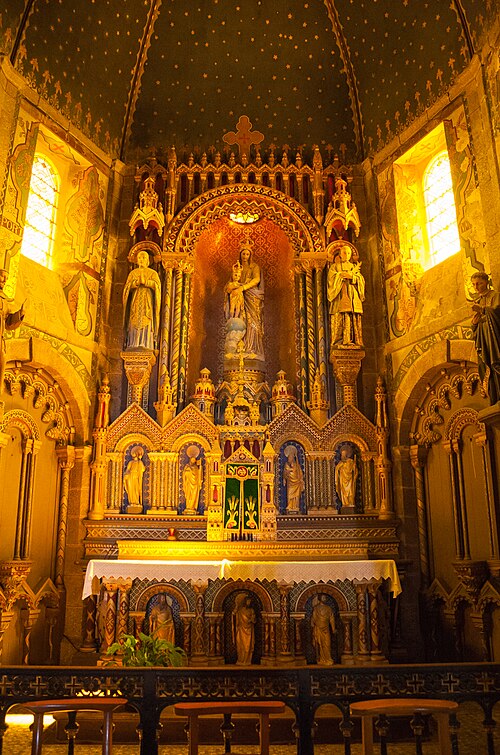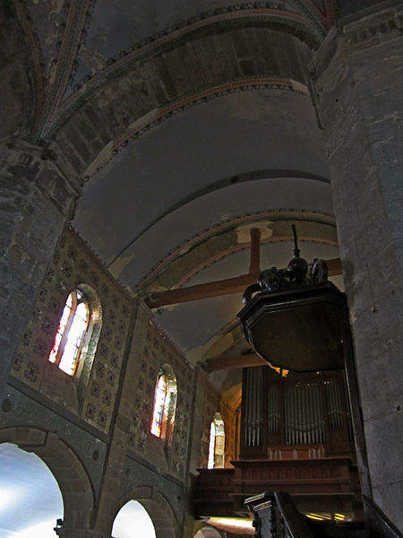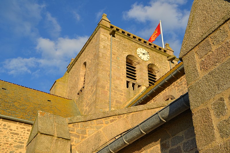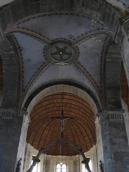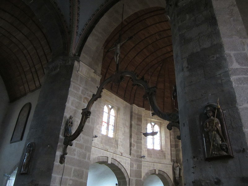 La courte nef, aussi large que longue, présente trois arcades ouvrant sur des bas‑côtés en arc surbaissé, l’ensemble relevant du XIXe siècle ; l’éclairage provient de fenêtres au style roman dont les remplages incluent des motifs gothiques insérés ultérieurement, et les parties hautes portent des peintures au pochoir. Le chœur, de plan trapézoïdal délimité par cinq arcades, est pourvu d’un déambulatoire. La tour‑clocher, massive et carrée, était à l’origine couronnée d’une pyramide en ardoise ; son entretien ayant été jugé coûteux, on y a élevé au milieu du XVIIIe siècle une plate‑forme en granit dallée et entourée d’une balustrade. L’ensemble est couvert d’une toiture en schiste vert et les charpentes qui coiffent le chœur, les chapelles et la nef sont en bois à une époque récente.