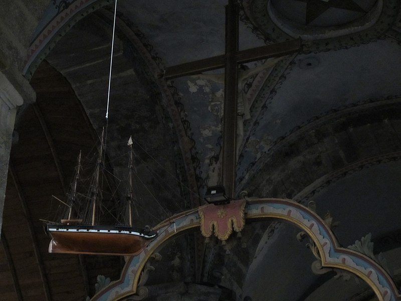 Bâtie en plusieurs campagnes, l’église, ramassée et entourée de son cimetière marin établi directement sur le roc, conserve comme parties les plus anciennes le chœur, les piles de la tour et les murs du transept datés de 1649, la tour et le transept étant définitivement clos en 1695. Un plan ancien visible à l’intérieur précise les étapes de construction : chœur, transept et tour aux XVIIe siècle, puis nef et chapelle axiale au XIXe siècle avec une façade néo‑romane. Quarante et une pierres à triglyphes, pour la plupart retaillées, ont été réemployées en guise de chapiteaux, vestiges du fort et de l’ancienne église.