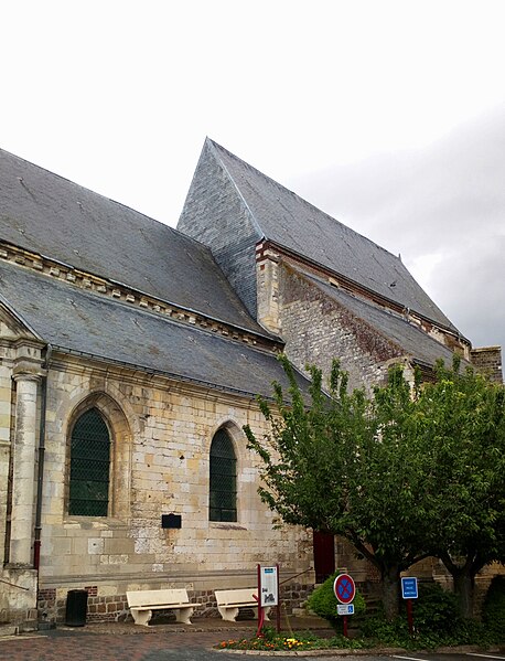 Construite en pierre locale — calcaire jaune et tendre — l'église mesure 38 mètres de long sur 18 mètres de large; la voûte du chœur atteint 14 mètres de hauteur tandis que celle de la nef s'élève à 11 mètres. La tour-clocher, achevée en 1745, culmine à 35 mètres et fut réparée après la guerre, avec un toit plus pentu qu'auparavant. La nef, moins élevée que le chœur, a été voûtée lors des restaurations du XIXe siècle. Le chœur se développe sur trois niveaux : un registre inférieur doté d'une arcature romane aveugle, un niveau central gothique et un niveau supérieur percé de lancettes accentuées.