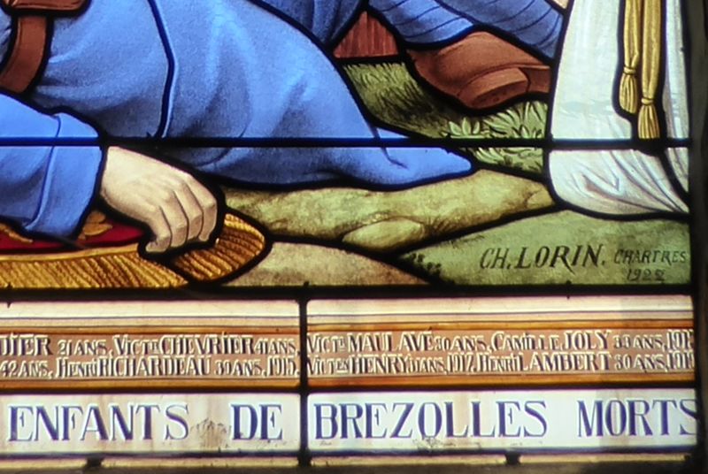L'église Saint-Nicolas de Brezolles (Eure-et-Loir) a été fondée au début du XIe siècle. Brûlée en 1151, elle a été rebâtie en 1177. Des travaux menés aux XVe et XVIe siècles ont remplacé l'ancien clocheton octogonal par la tour actuelle et ont prolongé la nef. La tour-clocher et la première travée de la nef ont été classées au titre des monuments historiques en 1913. Parmi les éléments remarquables figurent la tour-clocher, une gargouille sur la façade occidentale et un cadran solaire sur la façade sud. Les vitraux datent des XIXe et XXe siècles et proviennent majoritairement des ateliers Lorin de Chartres. On y retrouve les signatures de trois générations de verriers : Nicolas Lorin, son fils Charles et le petit-fils François Lorin. Un vitrail signé par Charles Lorin en 1922 comporte, en partie basse, un phylactère « à la mémoire des enfants de Brezolles morts pour la patrie » et trois phylactères du tympan indiquant « Gloire et merci », « aux sauveurs », « de la France ». La composition représente la France, au manteau de fleurs de lys, remettant une couronne de lauriers à un soldat gisant ; la cathédrale Notre-Dame de Reims apparaît à l'arrière-plan gauche. Cette réalisation, peu fréquente dans le département, comporte seize portraits de poilus placés en médaillons le long des côtés, entourant la figure du Christ en croix qui surplombe les tranchées. Les verrières identifiées comprennent notamment la baie 0 datée de 1878 et signée Nicolas Lorin, ainsi que la baie 10 de 1922 signée Charles Lorin. L'église fait partie de la paroisse Bienheureux-François-de-Laval en Thymerais, rattachée au doyenné des Forêts. Des notices et ressources en ligne, dont Mérimée, Clochers de France et l'Observatoire du patrimoine religieux, documentent cet édifice.