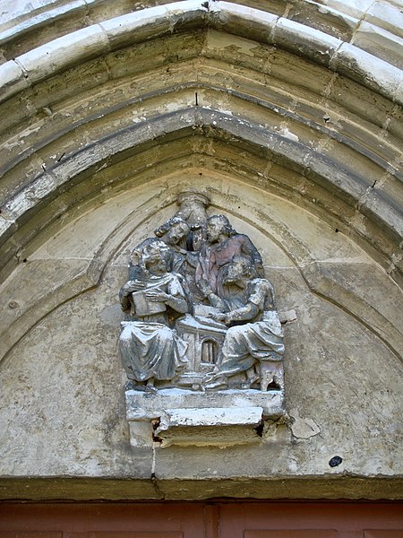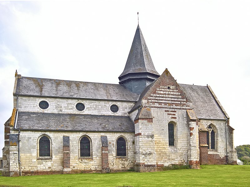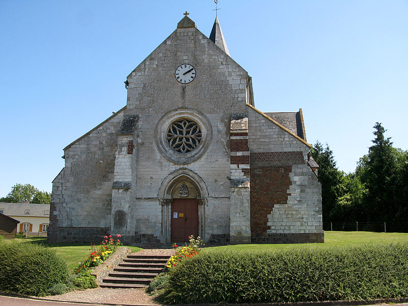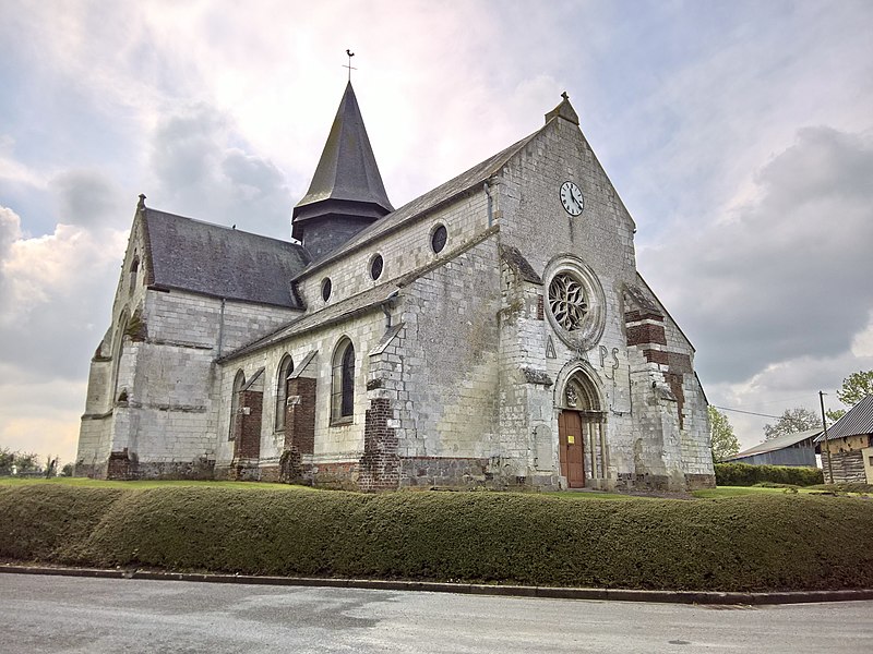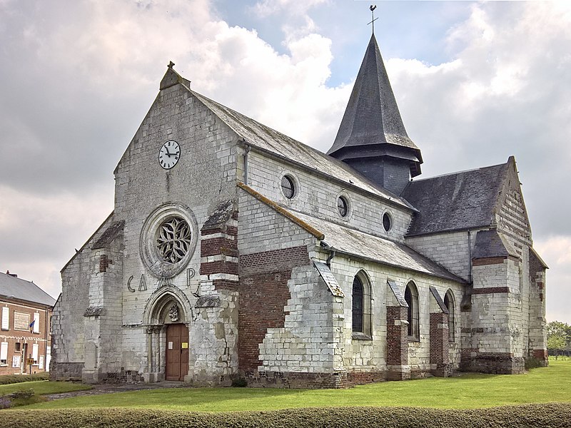 L'église Saint-Nicolas de Camps-en-Amiénois (Somme) se situe à environ 20 km à l'ouest d'Amiens. Sa construction remonterait au XIIIe siècle. L'édifice a ensuite été reconstruit, sans que l'on puisse en préciser les dates. Le portail, seul vestige de l'ancien édifice, est protégé au titre des monuments historiques par inscription par arrêté du 4 mars 1926. Le tympan du portail porte en haut-relief une main pendante bénissant de deux doigts, aujourd'hui partiellement masquée par la représentation d'un groupe de quatre personnages, les Évangélistes, rassemblés autour d'une table basse ou d'un écritoire sur pieds. Deux des personnages, en arrière-plan, sont debout; les deux autres, assis à l'avant, tiennent chacun un livre ouvert; celui de gauche presse son livre contre sa poitrine, tandis que celui de droite montre du doigt un passage sur le livre posé sur l'écritoire. Des traces de peinture subsistent sur les vêtements des deux personnages du fond. Le clocher, élevé au-dessus de la croisée du transept, est de plan octogonal et coiffé d'une flèche en ardoise; une tourelle d'accès a conservé son escalier. À l'intérieur, une statue de saint Éloi a été répertoriée. On y trouve également une Vierge de Pitié en pierre calcaire polychrome et dorée, provenant de la chapelle Saint-Milfort, deux statues en bois grandeur nature représentant saint Jean-Baptiste et saint Nicolas encadrant le maître-autel, ainsi qu'une Vierge à l'Enfant en pierre calcaire badigeonnée en blanc. La Vierge de Pitié, datée du XVIe siècle et issue de la chapelle de dévotion Saint-Milfort, a été rapportée dans l'église et est classée depuis le 28 mai 2004.