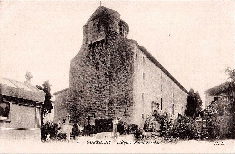 L'église Saint-Nicolas, située à Guéthary (Pyrénées-Atlantiques), est dédiée à saint Nicolas, patron des marins, et dépend du diocèse de Bayonne. Édifice massif construit au XVIe siècle, elle présente une nef unique sans transept ni chapelles latérales, prolongée à l'est par un chevet demi-circulaire et coiffée à l'ouest d'un clocher-mur. Un porche est adossé à l'angle nord-ouest de la façade. La nef fut agrandie au XVIIe siècle, probablement lors d'une reconstruction approximative entre 1636 et 1650, et elle fut entourée de tribunes en chêne sur trois niveaux autrefois réservées aux hommes. Des retables latéraux encadrant le chœur datent de cette période. Une benoîterie, aujourd'hui disparue, était accolée à l'édifice. Le porche s'écroula en 1818 ; il fut surhaussé après 1830 pour l'aménagement d'une salle de classe, puis réaménagé en 1859 avec la création d'escaliers en fer à cheval et la reprise de la porte de la nef. L'église fut réparée en 1818 (porche) et en 1846, puis rehaussée et élargie lors des travaux de 1859. Entre 1860 et 1870, les tribunes furent légèrement raccourcies et le retable central fut vendu en 1870 ; une statue de saint Nicolas provenant de ce retable fut placée dans une niche surmontant le porche. Le décor intérieur a été épuré en 1970 et certaines pièces dispersées ailleurs pour se conformer aux règles en vigueur à l'époque. L'église conserve des statues du XVIIe siècle et un ex-voto en forme de vaisseau trois-mâts à coque verte suspendu dans la nef. L'orgue, fabriqué vers 1955 par la maison Organeria Española, a été installé et inauguré en 1959 et restauré en 2012 par l'atelier Azpiazu d'Azpeitia ; il compte quinze jeux et deux claviers. L'édifice dépend de la paroisse Saint-Joseph-des-Falaises/Bidart et a été inscrit en 2001 à l'inventaire supplémentaire des Monuments historiques.
