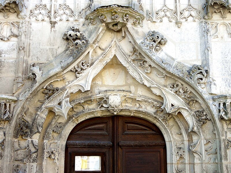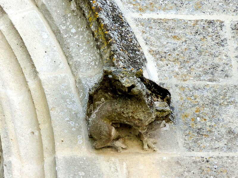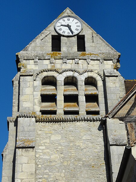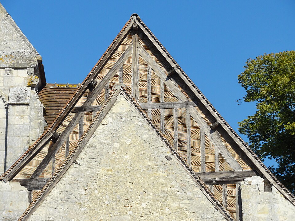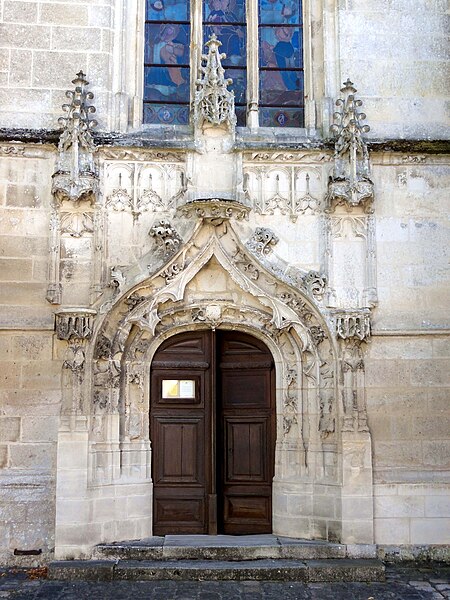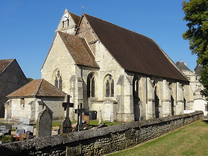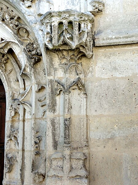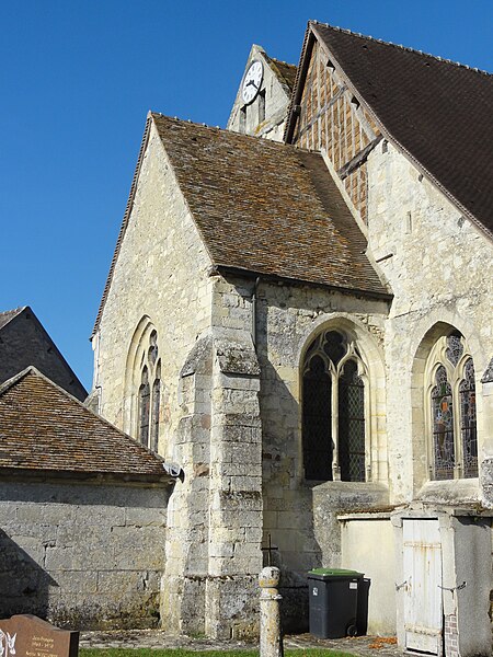 La façade occidentale est dominée par un portail flamboyant richement sculpté où voussures ciselées de pampres, écusson à la clé, niches à dais gothiques et arcatures plaquées constituent l'essentiel de l'ornementation, tandis que la grande fenêtre haute ouvre la façade. Le clocher latéral, organisé en trois baies par face à l'étage de beffroi, est bâti en moellons avec pierre de taille pour les contreforts et les ouvertures, et présente une corniche de modillons et des chimères aux angles. Les élévations latérales et le chevet sont maçonnés en moellons avec des éléments de pierre de taille pour soubassement, contreforts et pourtours des baies ; le chevet, qui ne dépasse pas la hauteur des bas‑côtés, se distingue par une paroi en pans de bois remplie de tuiles disposées de façons variées.