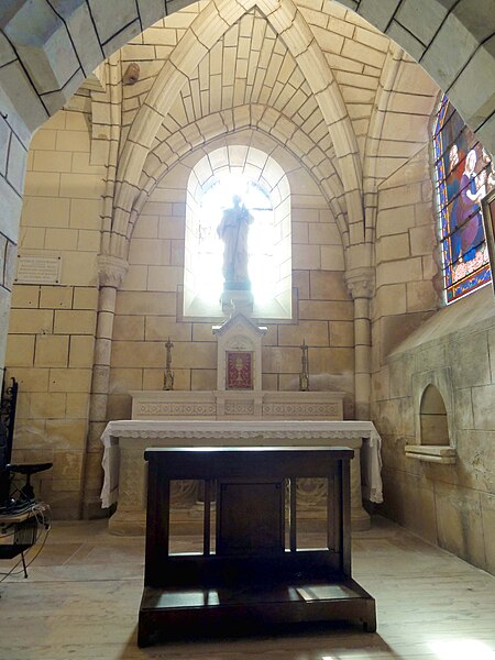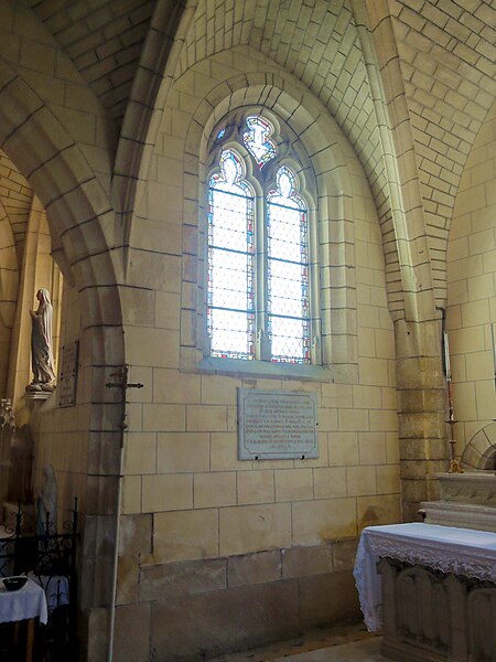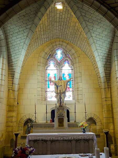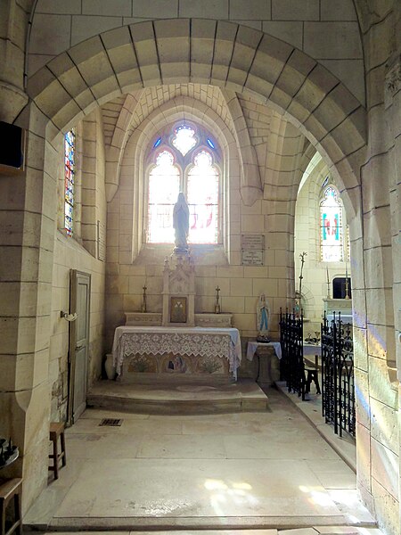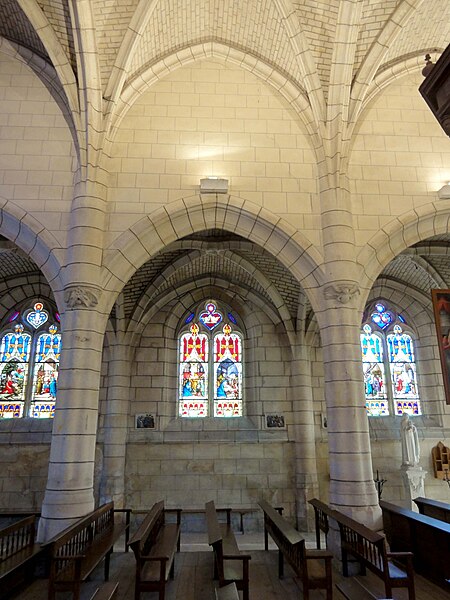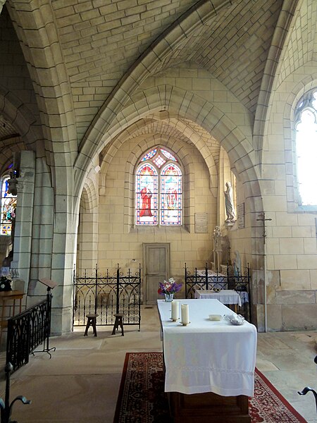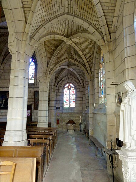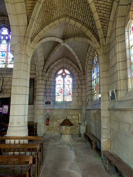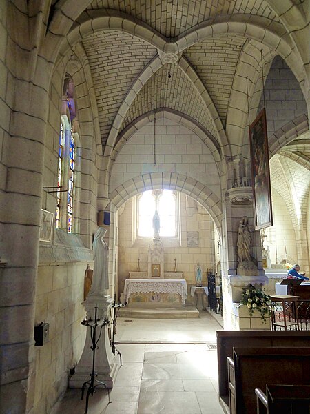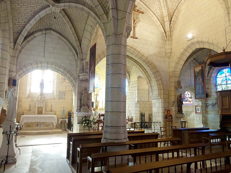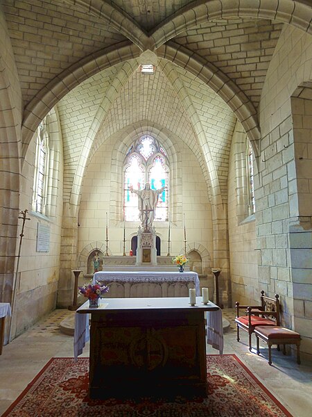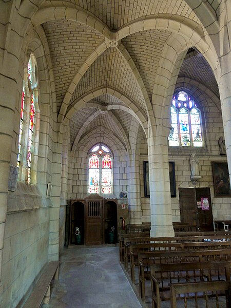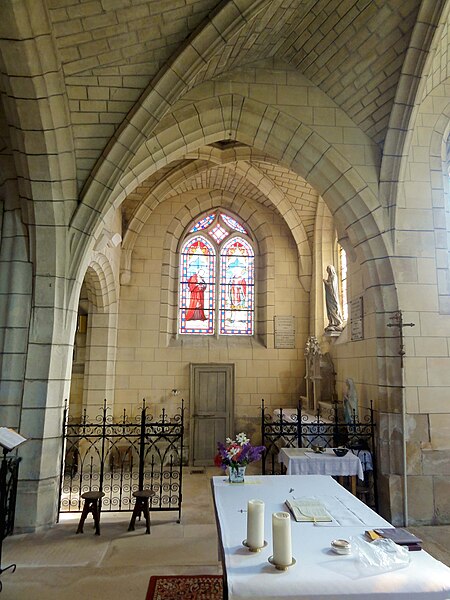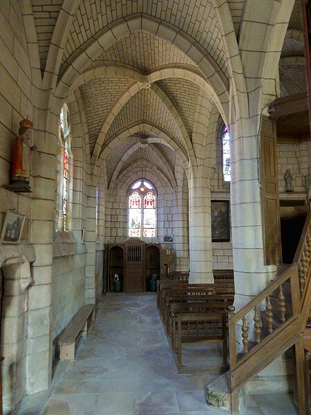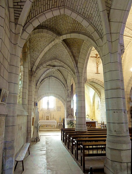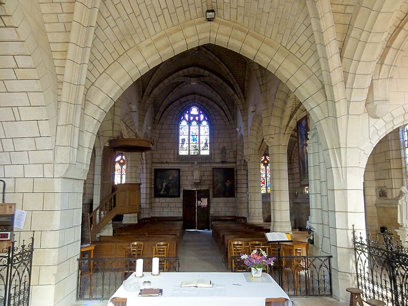 Orientée légèrement de biais, l'église présente un plan globalement symétrique composé d'une nef de trois travées accompagnée de deux bas‑côtés, d'un chœur rectangulaire profond d'une seule travée et de deux chapelles latérales peu profondes. La chapelle nord est dédiée à la Vierge et la chapelle sud, plus ancienne et formant la base du clocher, est dédiée à saint Joseph. La nef, uniquement éclairée par les bas‑côtés à l'exception d'une grande fenêtre au‑dessus du portail occidental, est voûtée d'ogives et s'appuie sur des piliers ondulés à huit renflements caractéristiques du style flamboyant. Les voûtes, dont la clé de voûte du chœur est sexpartite, présentent des nervures prismatiques au profil flamboyant, des formerets et des arcs doubleaux qui retombent sur des fûts cylindriques engagés ou des culs‑de‑lampe sculptés. L'arc triomphal, d'une hauteur égale à celle des grandes arcades mais mouluré plus simplement, et divers aménagements irréguliers témoignent de reprises et d'anciennes structures intégrées au plan actuel. Les bas‑côtés, de moitié de la largeur de la nef et d'environ deux tiers de sa hauteur, ont une modénature plus sobre et des fenêtres généralement à deux lancettes trilobées surmontées d'un soufflet et de mouchettes, à l'exception de quelques baies atypiques. Le chœur, profond et atypique, combine une voûte sexpartite et des élévations irrégulières qui laissent penser à une réutilisation de maçonneries antérieures ou à une solution économique de voûtement. La chapelle de la Vierge paraît avoir été ajoutée en second lieu et se caractérise par des ogives au même profil que le reste de l'édifice et par des culs‑de‑lampe massifs.