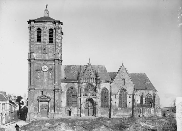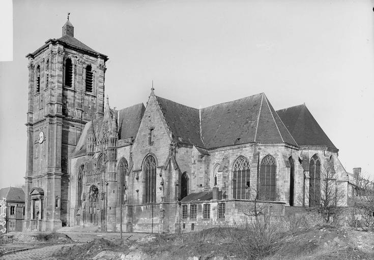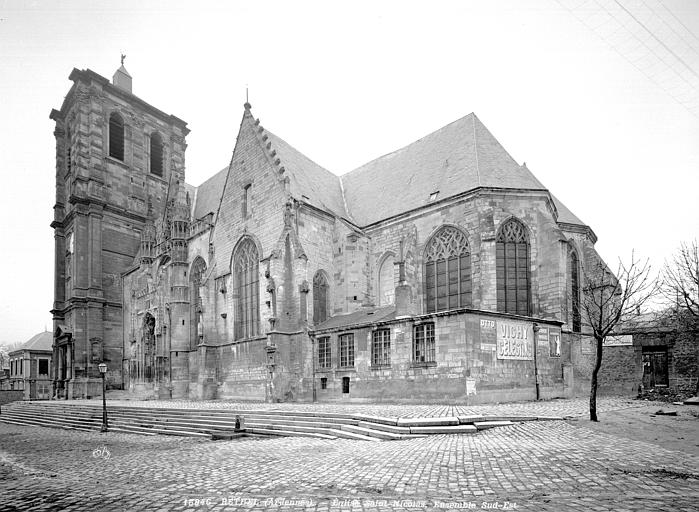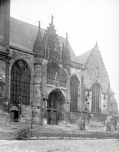 L'église Saint-Nicolas, de styles gothique et baroque, se situe rue Étienne Dolet au cœur de Rethel, dans le département des Ardennes. L'édifice actuel repose sur des vestiges du VIIe siècle et remonte principalement aux XIIIe et XIVe siècles, mais il a été profondément remanié au fil du temps. Le prieuré, fondé en 1108 et dépendant de Saint-Remi de Reims, vit son église construite en 1279 ; le prieuré fut dissous en 1740 et l'église devint entièrement paroissiale. Des travaux d'embellissement furent entrepris au début du XVIe siècle, notamment par Rambaud le Buz en 1517 et par Jean Bailly de Biermes pour l'édification d'un grand portail latéral de style gothique flamboyant, commencé en 1512 et achevé en 1531. La tour carrée, d'origine datée de 1614, s'élève à 50 mètres et présente des étages ornés des ordres dorique, ionique et corinthien. Classée au titre des monuments historiques en 1846, l'église a cependant été fortement endommagée pendant les deux guerres mondiales : elle fut détruite à chaque conflit, brûlée en 1940 puis, le 1er janvier 1941, les voûtes détrempées s'écroulèrent sous l'effet du gel. Les travaux de restauration, engagés dès 1941 et poursuivis après-guerre sous la direction de l'architecte en chef des Monuments historiques M. Froidevaux, durèrent longtemps ; la grosse tour retrouva ses cloches en 1962 et la toiture du clocher, avec sa pointe recouverte d'ardoises, ne fut totalement refaite qu'à la fin des années 1960. L'intérieur présente une configuration à quatre vaisseaux — une double nef résultant de la réunion de l'église priorale au nord et de l'église paroissiale au sud. Le mobilier répertorié au titre du patrimoine comprend notamment le gisant en pierre noire de Thomas-Adolphe de Fuchsamberg et de son épouse Marie Robillard, accompagnée des mentions relatives aux titres et fonctions de Thomas-Adolphe. On y trouve aussi plusieurs peintures, dont La Pêche miraculeuse et La Guérison du boîteux par saint Pierre attribuées à Nicolas Wibault, ainsi que quatre tableaux de Jacques Wilbault (la Descente de Croix, l'Assomption, la Samaritaine et saint Nicolas). Le patrimoine mobilier comporte encore des statues — Sainte Marguerite, un évêque nommé Gorgon en pierre polychrome, et Sainte Claire en pierre polychrome placée sous un dais du XVe siècle — ainsi que, dans la crypte, deux statues féminines et un Christ au tombeau datés des XVIe et XVIIe siècles. On relève enfin la présence d'une croix de chemin, du portail occidental de l'ancienne église priorale, de rosaces et d'une référence à dom Rousseau.