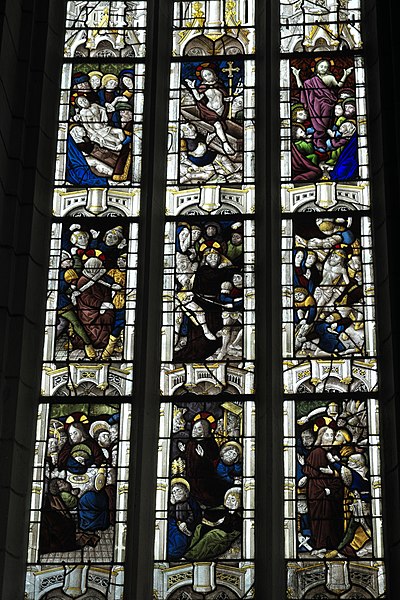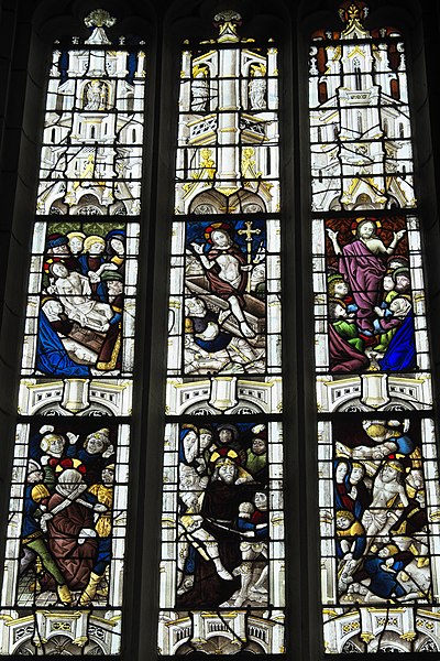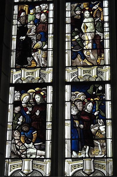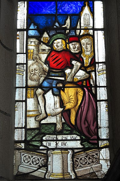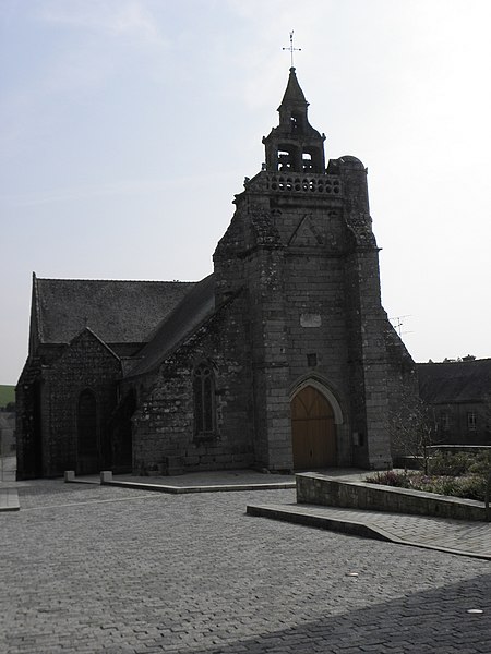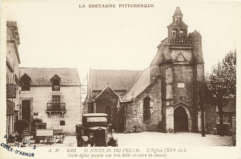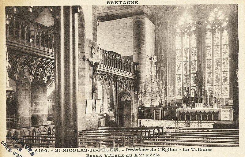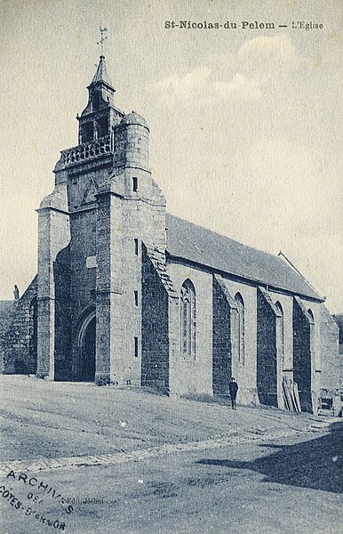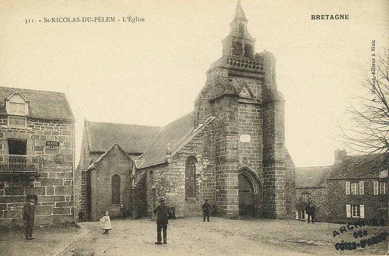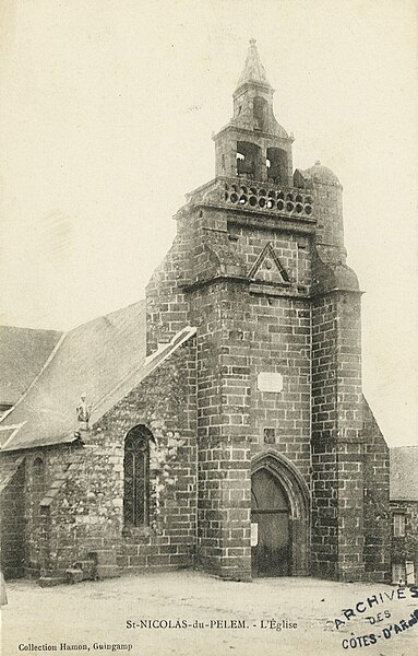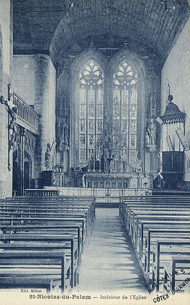 L’église Saint-Nicolas se trouve rue Henri-Aurel à Saint-Nicolas-du-Pélem, dans le département des Côtes-d’Armor en Bretagne. À l’origine elle fut la chapelle privée du château du Pélem, datée 1474–1575. Le comte Loz de Beaucours la donna à la paroisse entre 1847 et 1860, période où le bourg de Saint-Nicolas remplaça Bothoa comme siège de la paroisse. Elle fut agrandie pour devenir l’église Saint-Pierre, nom de l’ancienne église paroissiale de Bothoa, avec l’ajout d’une sacristie et d’une chapelle des fonts baptismaux en 1860. L’édifice, situé en centre-ville, est construit en pierre de taille de granite gris ; sa toiture est recouverte d’ardoises et l’intérieur présente une voûte lambrissée. Le chevet conserve une fenêtre jumelée ornée de vitraux du XVIe siècle. Le vitrail intitulé La Dérision du Christ, daté vers 1470–1480, reprend le même dessin que la peinture murale de l’église Notre-Dame de Kernascléden. Un ancien jubé, transformé en tribune, a été détruit en 1861. L’église est inscrite au titre des monuments historiques par arrêté du 20 janvier 1926. Des ressources et références en ligne mentionnées comprennent Clochers de France, l’Observatoire du patrimoine religieux, l’Inventaire Bretagne, la base Mérimée et divers portails régionaux et nationaux consacrés à l’architecture et au patrimoine.