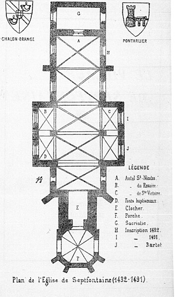 L'église Saint-Nicolas de Septfontaines, dans le Doubs, est d'origine romane et a été restructurée dans le dernier tiers du XVe siècle, marquée par l'adoption de voûtes d'ogives. La base de la tour-clocher serait le vestige de l'édifice roman du XIIe siècle. Orientée et de plan allongé, elle est précédée d'un porche octogonal à voûte en huit voûtains et clé pendante, suivi d'un vestibule. La nef, en trois travées voûtées d'ogives, est bordée de cinq chapelles latérales formant les bas-côtés ; quatre datent de l'origine et la cinquième a été ajoutée en 1748. Le chœur, composé de deux travées et fermé par un chevet plat, a été remanié en 1731 et abrite un retable d'A. Fauconnier. La châsse de Sainte-Victoire, translatée de Rome, est exposée depuis le 7 juin 1838 et a suscité un pèlerinage qui a perduré jusqu'à la Seconde Guerre mondiale. À l'occasion du pèlerinage centenaire de 1938 fut inauguré le chemin de croix peint par Robert Fernier. L'église est inscrite au titre des monuments historiques depuis le 8 juin 1926. Elle dépend de la paroisse de Levier et du diocèse de Besançon. Le mobilier est remarquable et plusieurs pièces sont protégées au titre des objets des monuments historiques : une cloche en bronze datée de 1694, du fondeur Alexis Jolly, classée le 29 octobre 1942 ; l'ensemble du maître-autel du XVIIIe siècle, sculpté par Augustin Fauconnet, la chaire à prêcher et les lambris de revêtement du XVIIIe siècle ornés de bas-reliefs, ainsi que l'ensemble retable de l'autel latéral gauche du XIXe siècle, tous classés le 23 mai 1979 ; enfin, un confessionnal, les fonts baptismaux, un Christ en croix et une statue de la Vierge, datant des XVIIIe et XIXe siècles, inscrits le 31 août 1979. La châsse de Sainte-Victoire, placée dans le collatéral sud, présente le corps de la sainte vêtu d'une tunique blanche brodée, allongé sur des coussins de velours garnis de galons et de pompons, la tête ornée d'une couronne de perles et de fleurs ; les ossements sont disposés sous le vêtement dans leur situation naturelle et les parties apparentes du corps ont été modelées à la cire.