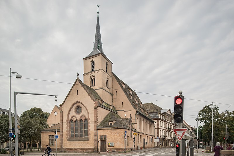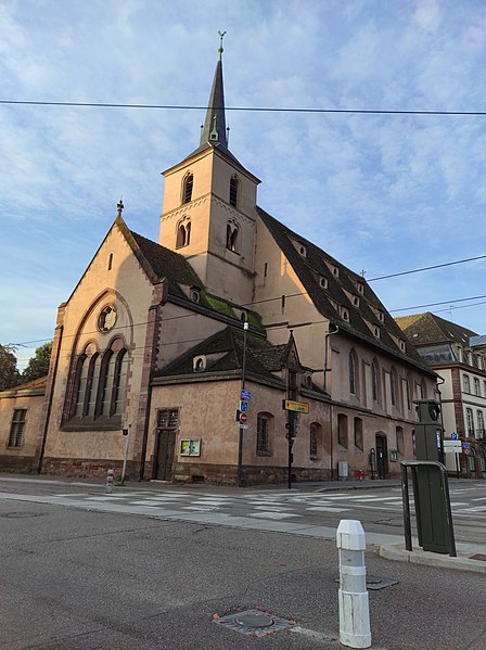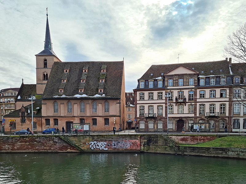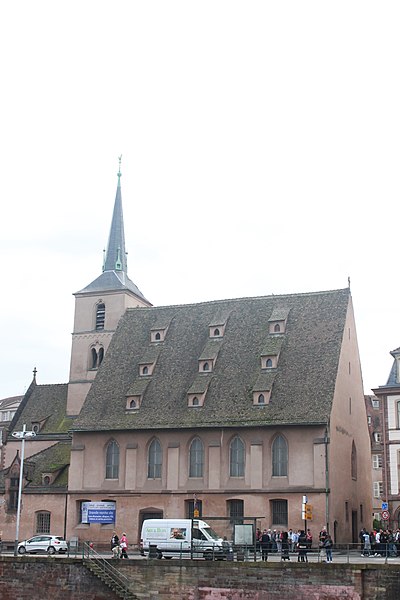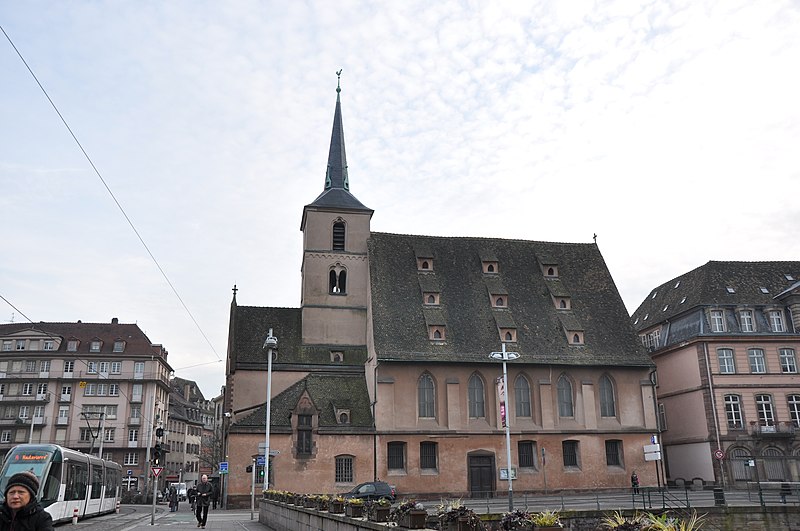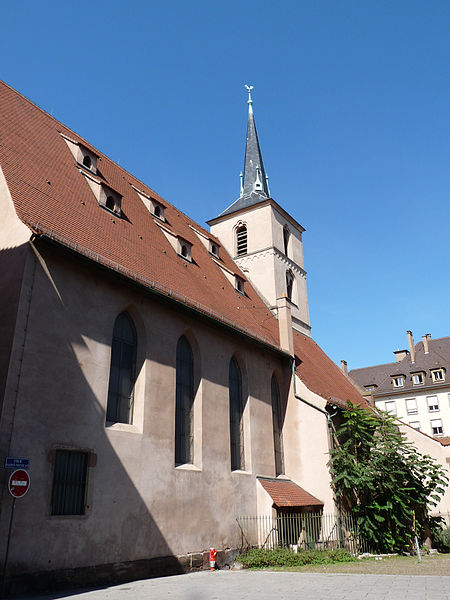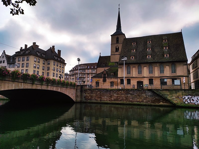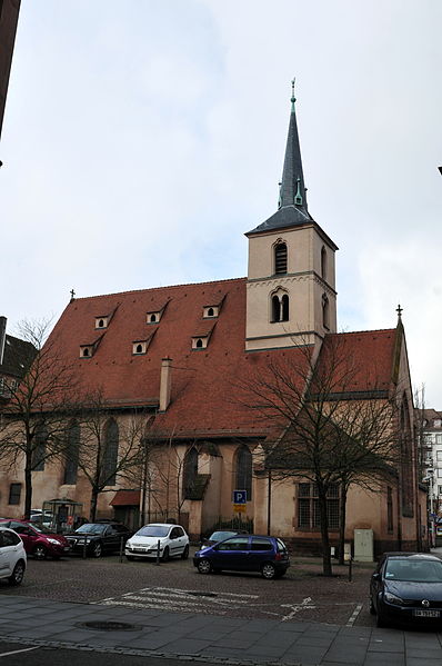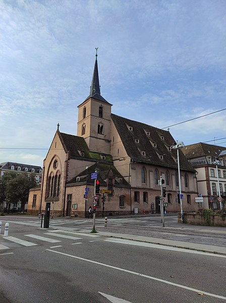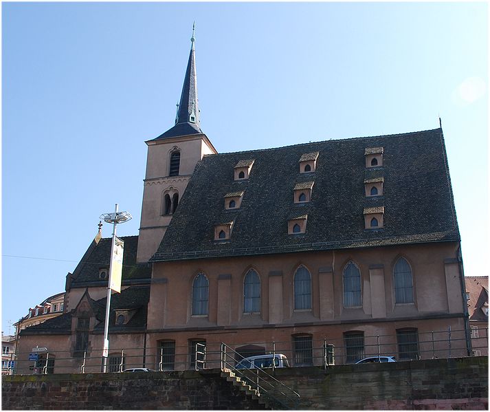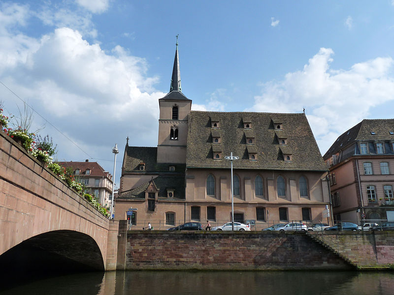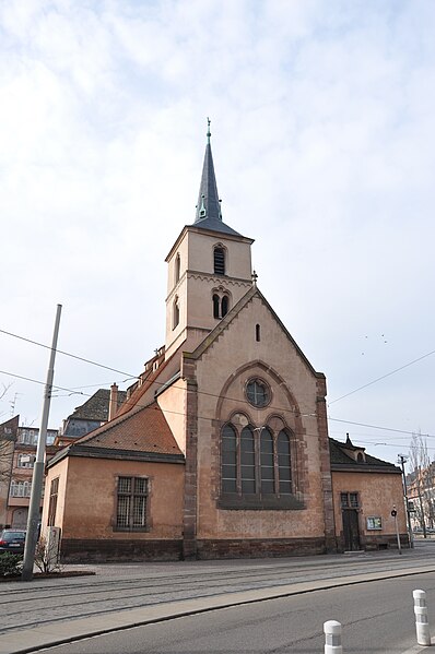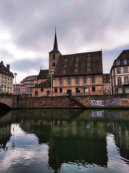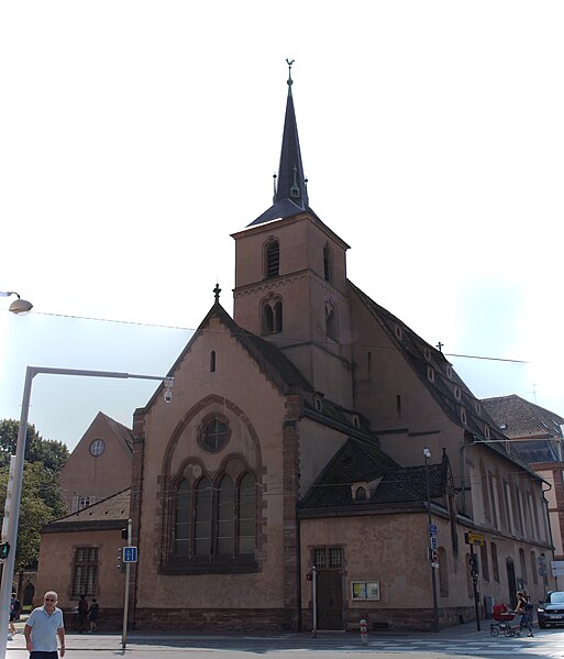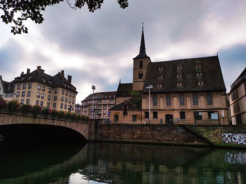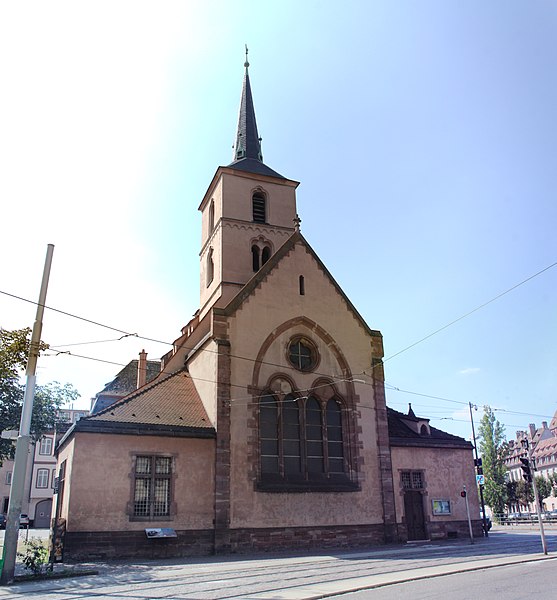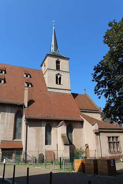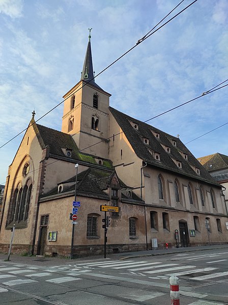 L’église protestante Saint-Nicolas, située quai Saint‑Nicolas dans le quartier du Finkwiller à Strasbourg, borde l’Ill dans le centre historique de la ville. Dédiée à Nicolas de Myre, elle accueille aujourd’hui une communauté du renouveau charismatique rattachée aux Églises protestantes d’Alsace‑Moselle. Classé au titre des monuments historiques depuis le 10 mai 1995, l’édifice est un exemple représentatif des églises‑halles construites dans la région du Rhin supérieur entre le XIVe et le XVIe siècle. Une première chapelle romane, fondée en 1182 par le chevalier Walther Spender, avait été élevée sur le site d’un petit fort romain ; elle était dédiée à Marie‑Madeleine. L’église actuelle a été édifiée entre 1387 et 1454, le sanctuaire ayant été agrandi après la peste de 1381 puis en 1454 par l’architecte Diebolt Mosung, avec d’autres modifications intervenues au XVIe siècle. La tour a été dotée d’une flèche vers 1600 (une mention indique 1585) et l’intérieur a été remanié au XVIIe siècle. Les parties orientales, ainsi que la façade et la sacristie, ont été reconstruites en 1905 par l’architecte Émile Salomon, également auteur de l’église du Temple Neuf. L’intérieur conserve des vestiges de fresques du XVe siècle découverts sous un badigeon qui s’écaillait, ainsi qu’une galerie en bois. L’orgue construit en 1707 par les frères André et Gottfried Silbermann a été démonté en 1967. Parmi les anciens pasteurs figurent des personnalités telles que Théodore Beck, Jean‑Frédéric Bruch, Georges Casalis, Mathias Engel, Antoine Firn, Charles Théodore Gérold, Isaac Haffner, Albert Schweitzer — qui y a notamment présidé le mariage de Theodor Heuss le 11 avril 1908 — et Paul Émile Berron, fondateur de l’Action chrétienne en Orient en 1922.