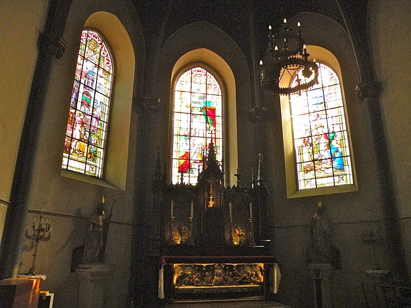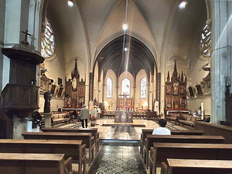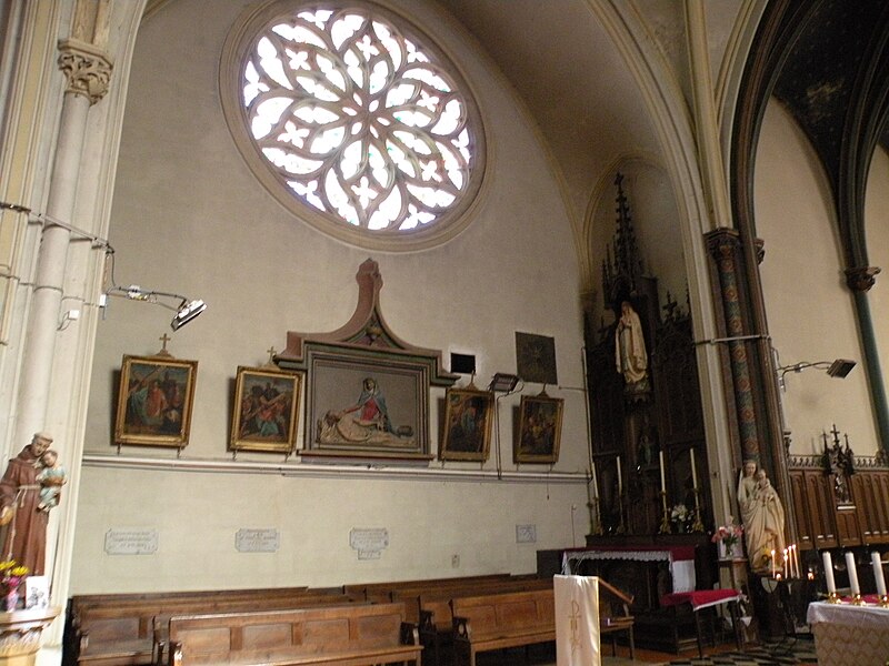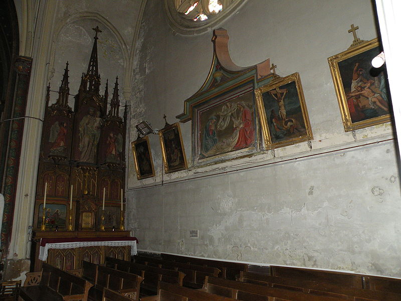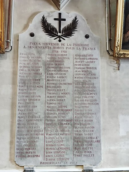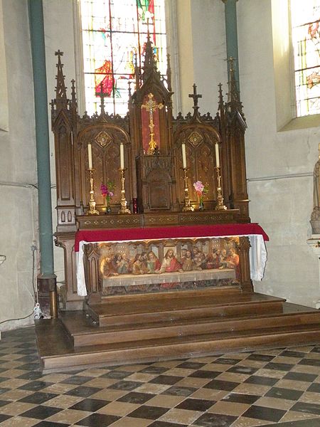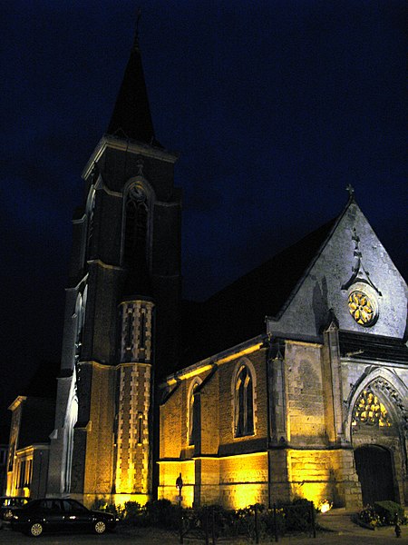 L'église, d'un plan en croix latine, présente un transept légèrement saillant et un chevet à trois pans percé de baies flamboyantes. La nef, en briques reposant sur un soubassement de grès, a été remaniée au XIXe siècle. Elle s'achève par une façade en pierre du XVe siècle, scandée par un avant-corps saillant flanqué de contreforts et de pinacles. Le pignon est percé d'une rose flamboyante surmontée d'un gable fleuronné. Le clocher a été reconstruit en briques entre 1887 et 1889 et déplacé sur le côté nord.
