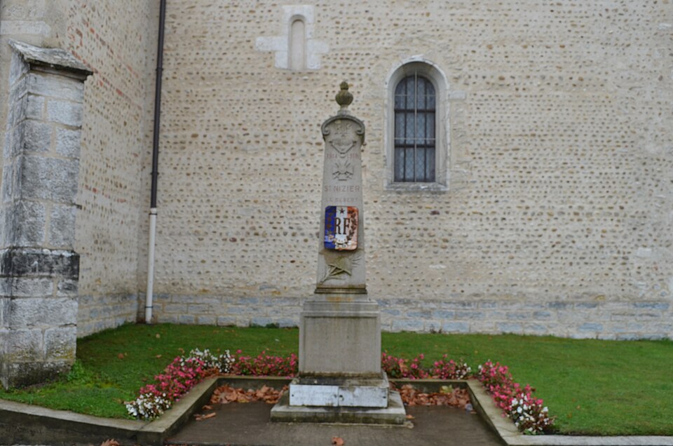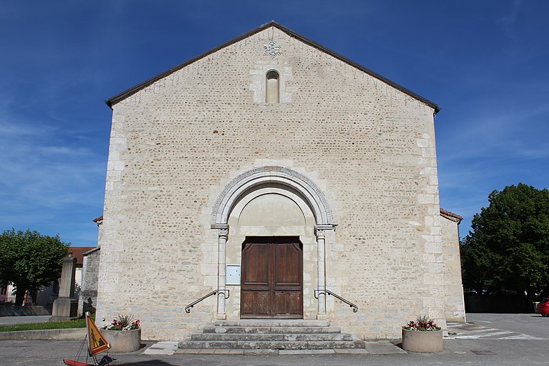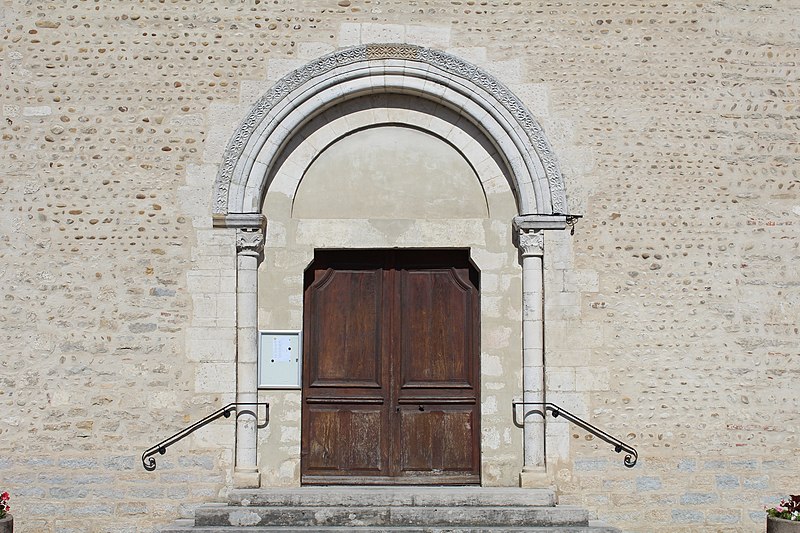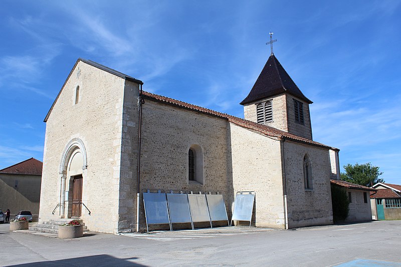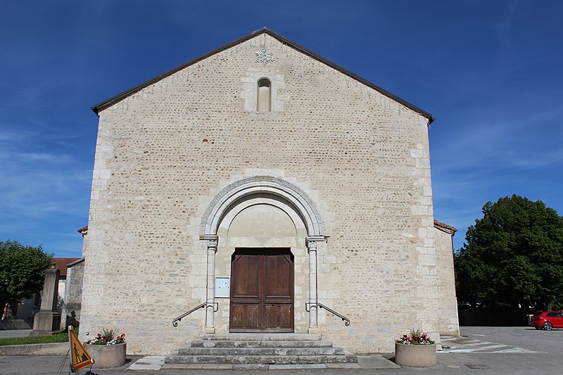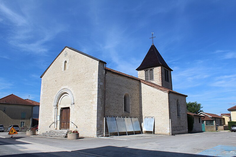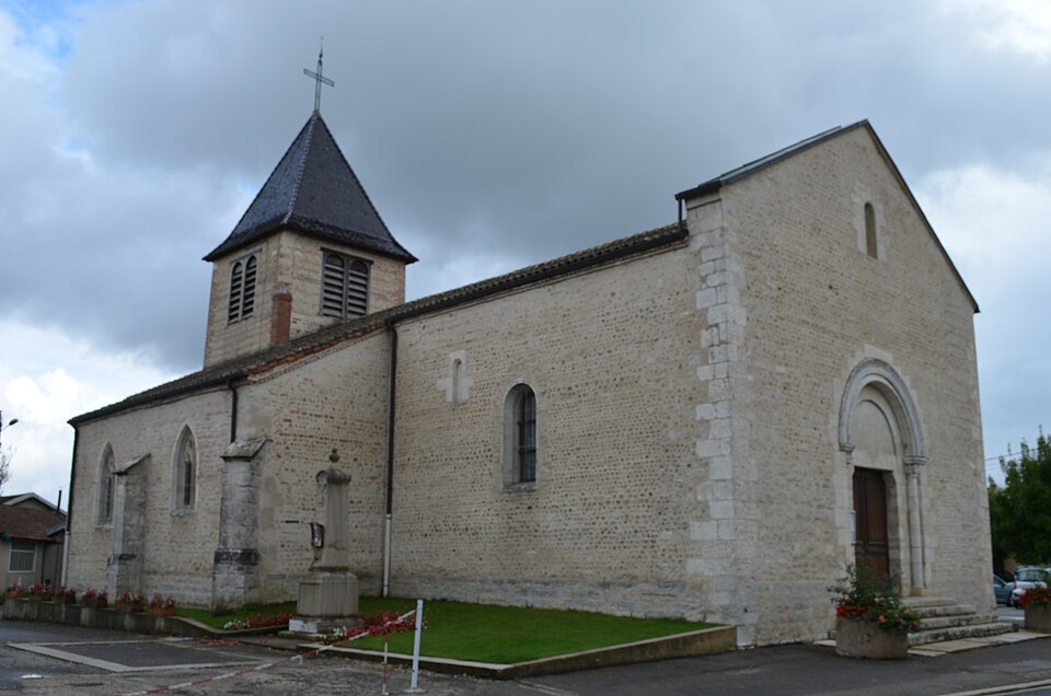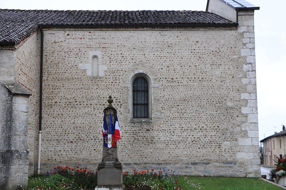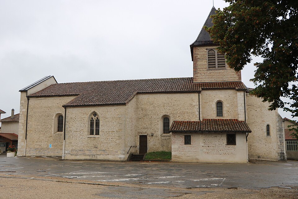 L’église Saint-Nizier, située à Saint-Nizier-le-Désert dans l’Ain (Auvergne-Rhône-Alpes), est inscrite au titre des monuments historiques depuis le 21 octobre 1926. Orientée ouest-est, elle présente un plan basilical avec une large nef épaulée de deux chapelles et un portail roman à double battant surmonté d’un linteau et d’un tympan en plein cintre. La nef, aujourd’hui enduite de blanc, est couverte d’une voûte en anse de panier et abrite plusieurs œuvres, tableaux et sculptures ; elle bénéficie de grandes baies en retrait ornées de vitraux à motif géométrique qui lui apportent une luminosité inhabituelle pour un édifice roman. Les chapelles latérales se distinguent par leur voûtement en croisée d’ogives et leurs baies pourvues d’un remplage élégant avec mouchettes. Le chœur, élevé d’une marche et non enduit, est polychrome : rythmé par des colonnes adossées, il est couvert d’une voûte en cul-de-four peinte en bleu étoilé et ornée d’un chrisme visible depuis la nef. Au centre se trouvent l’autel et un retable de pierre ; derrière le retable, des bancs de bois occupent l’abside pour les clercs. Les archives montrent que la nef était également polychrome au début du XXe siècle, avec un décor d’appareil rectangulaire orné de détails cruciformes, et l’on distingue encore des traces de la voûte étoilée là où l’enduit a disparu. Le décor et les éléments sculptés comprennent notamment le chrisme du chœur, la croix sommitale de la tour surmontée d’un coq visible sur des cartes postales anciennes, un chemin de croix gravé ainsi que diverses statues, dont une Vierge à l’Enfant et saint Denis représenté avec sa tête coupée.